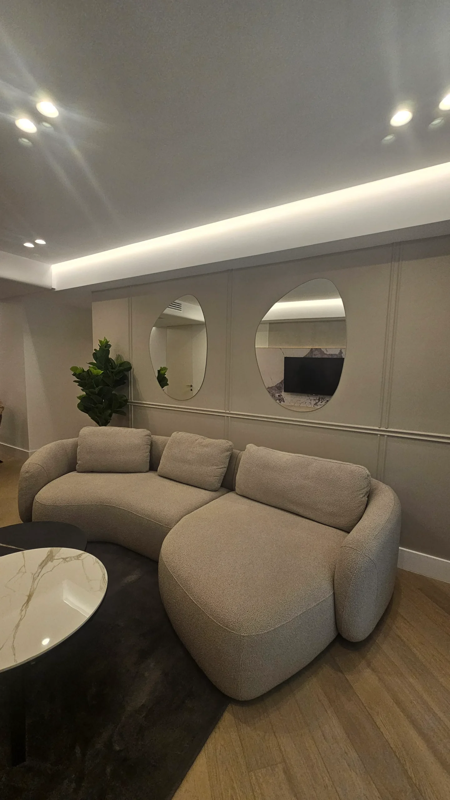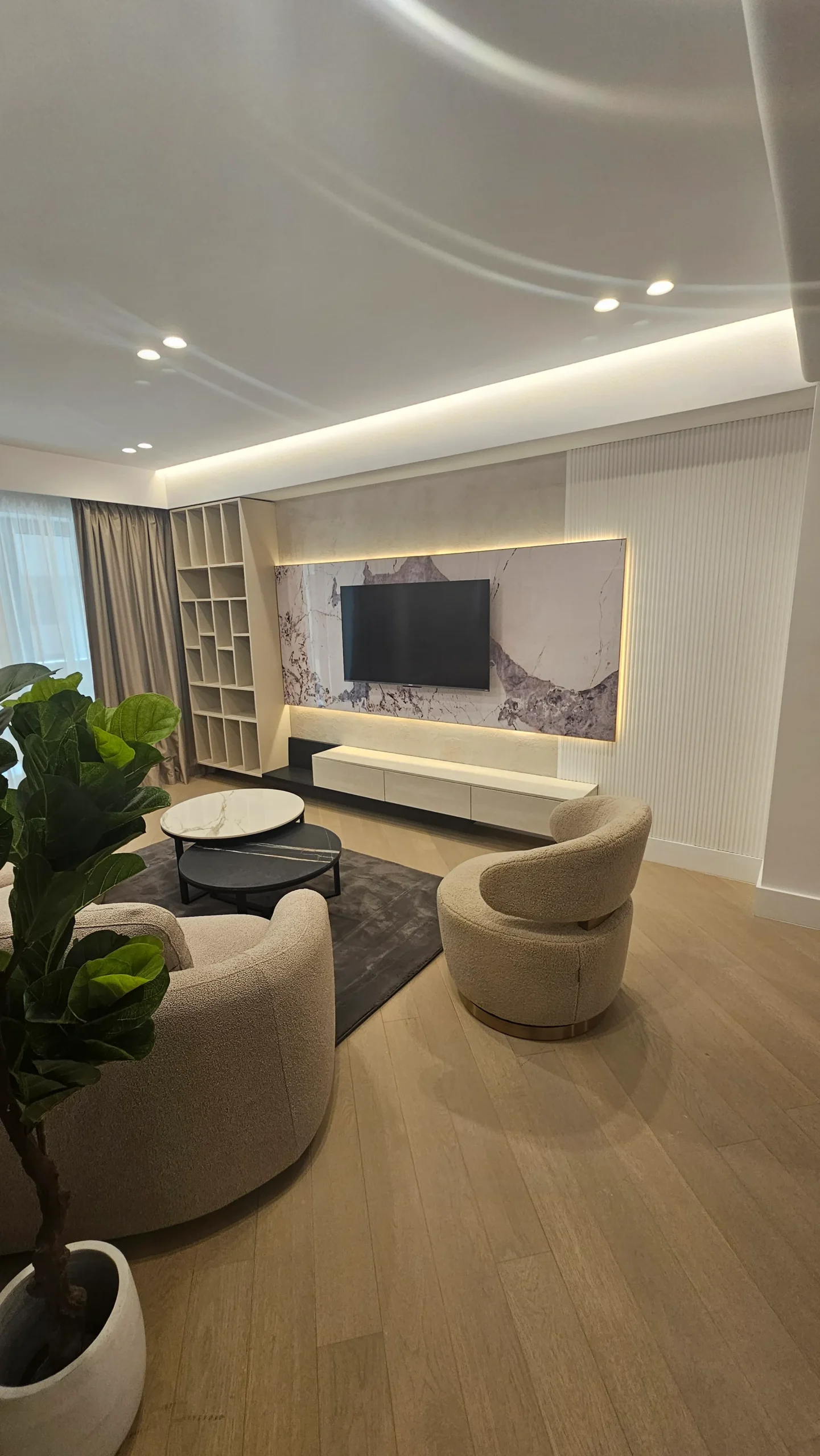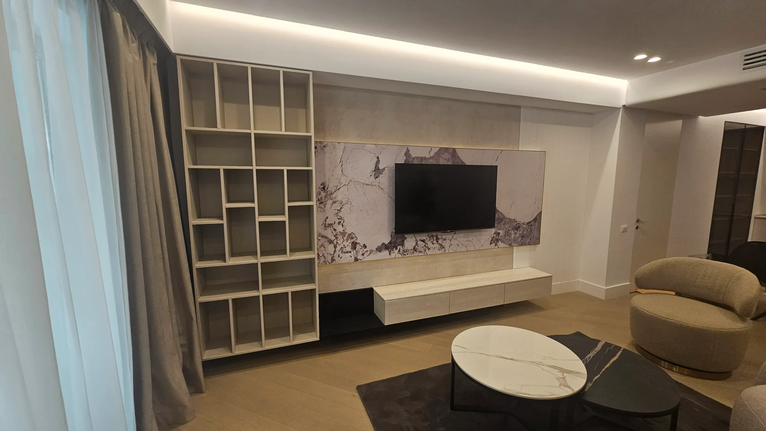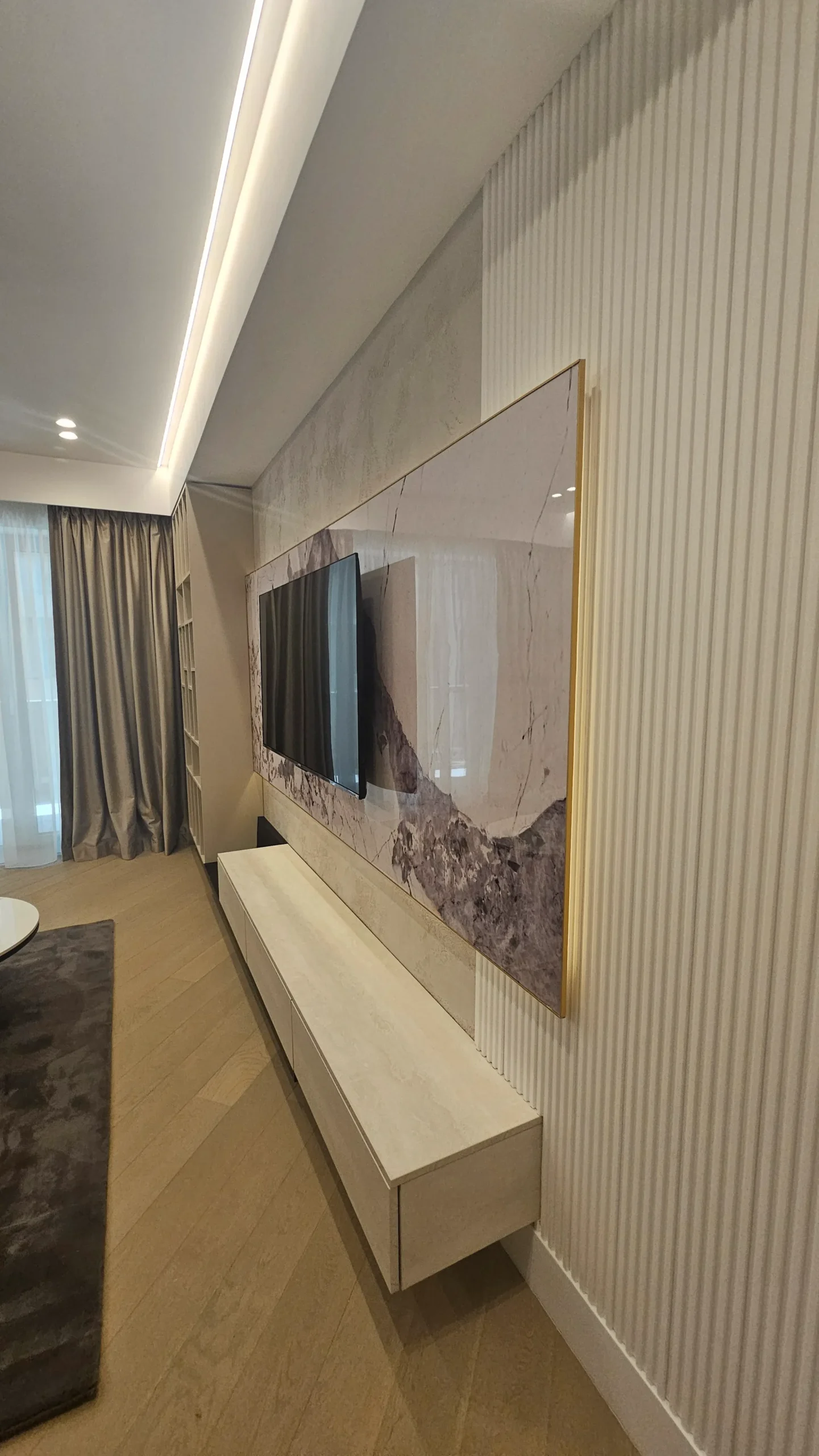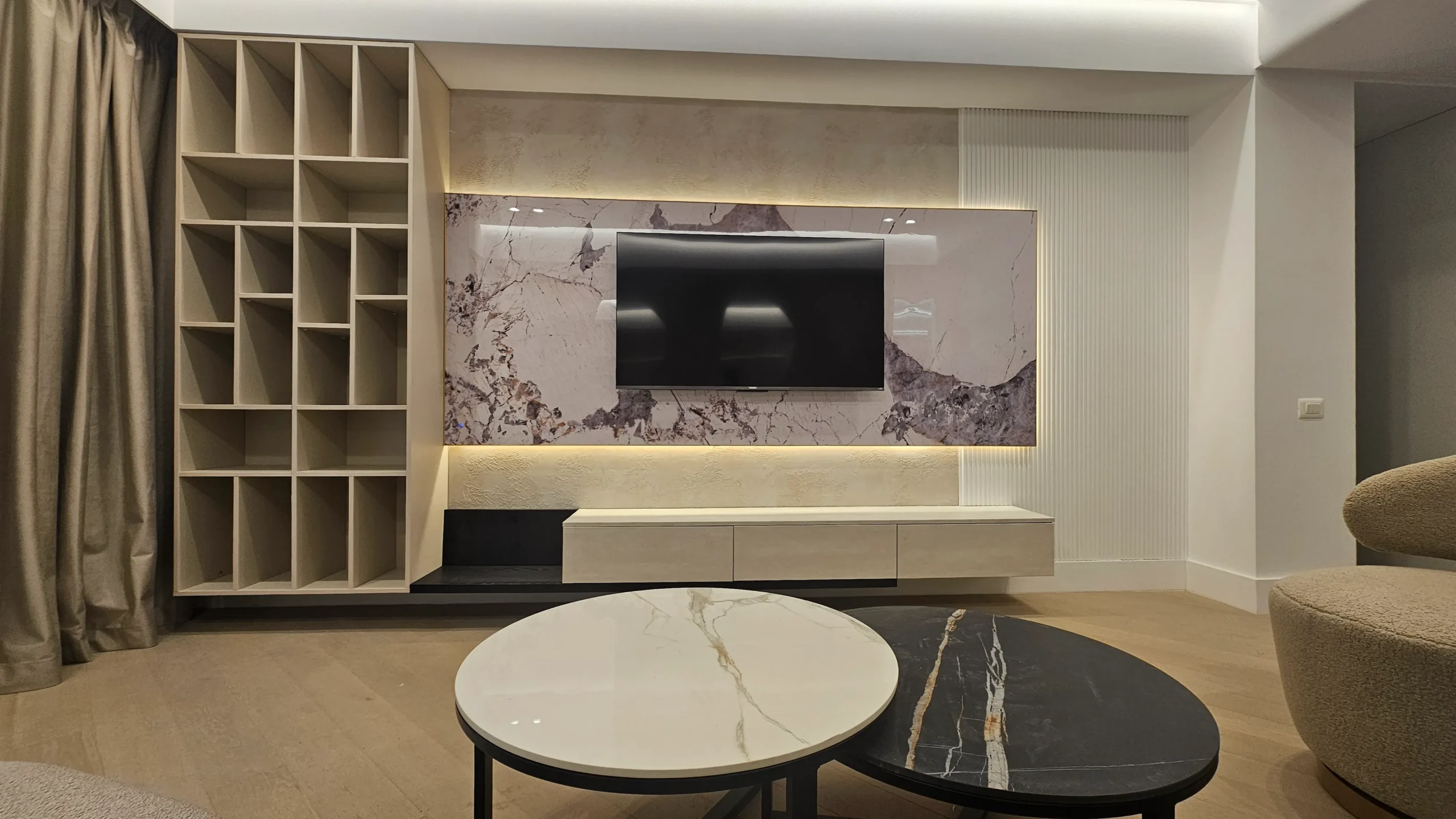 Pe peretele media, accentul cade pe o placare spectaculoasă cu marmură decorativă, cu vene discrete și iluminare LED perimetrală subtilă, ce pune în valoare designul minimalist al mobilierului suspendat. Două măsuțe de cafea rotunde, cu blaturi din ceramică neagră și albă cu aspect marmorat, întregesc atmosfera contemporană, în tonuri neutre.