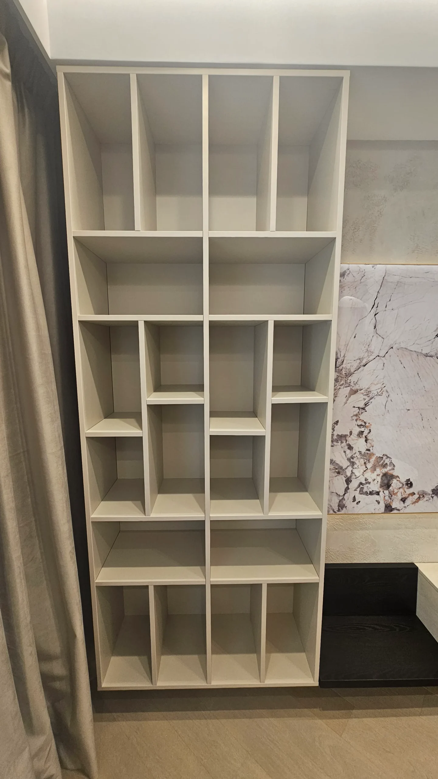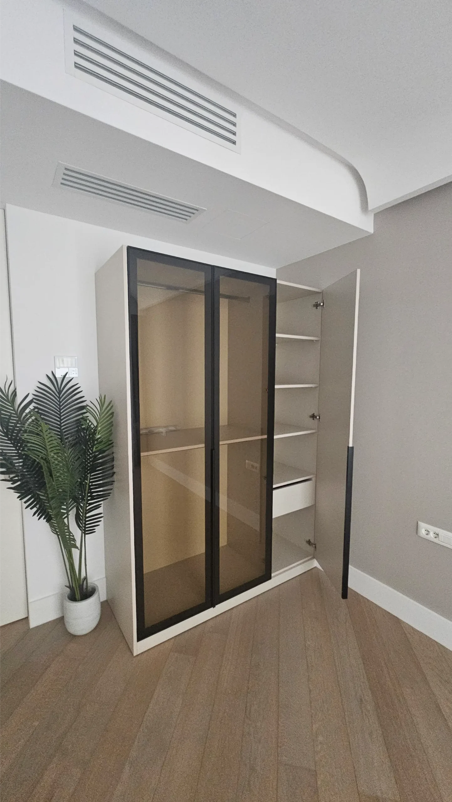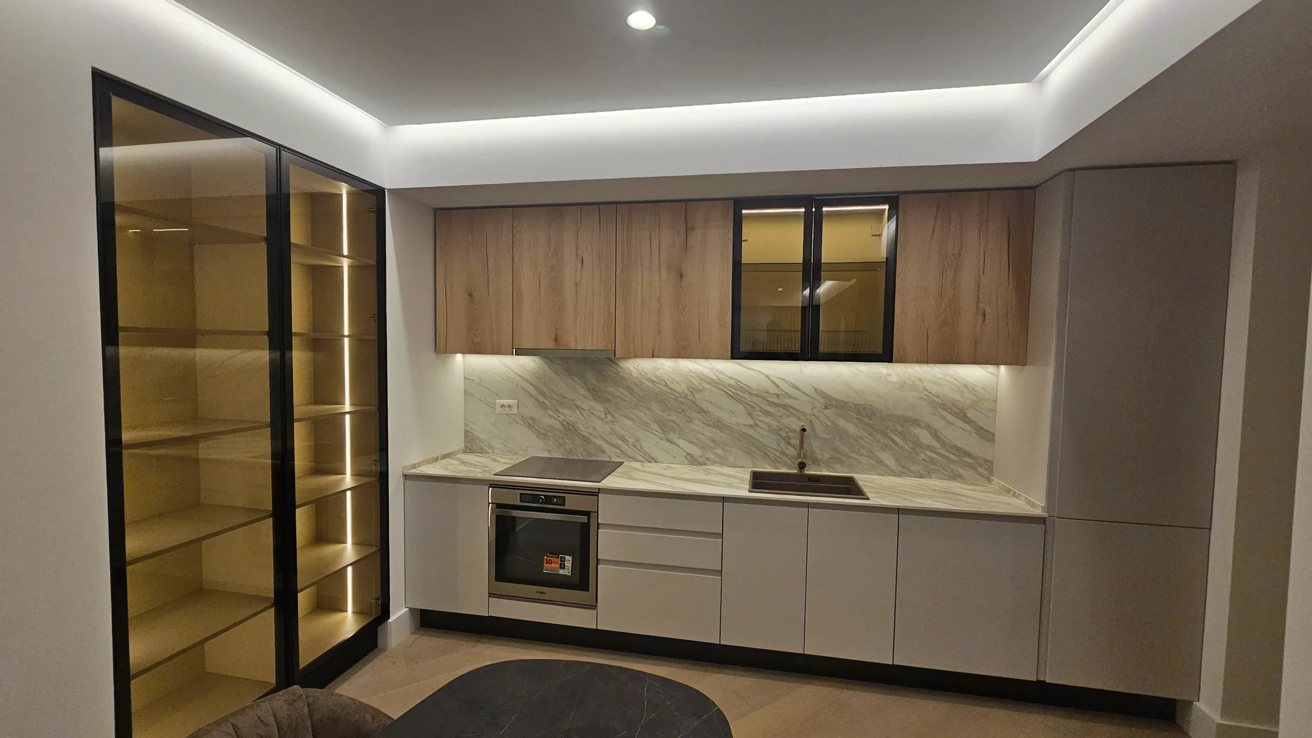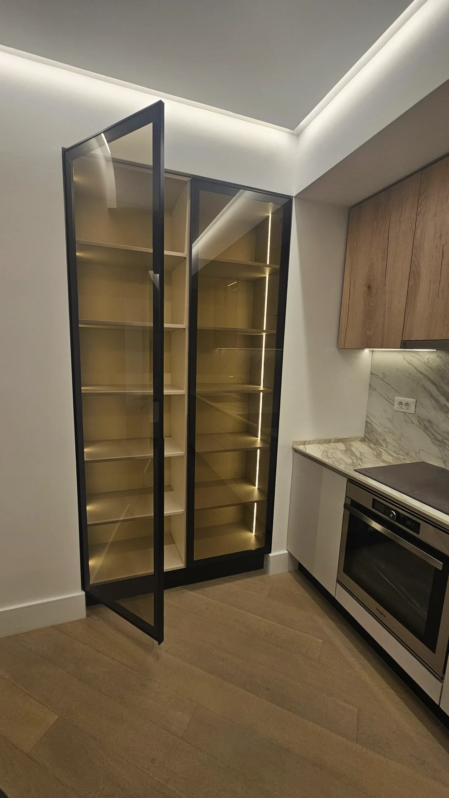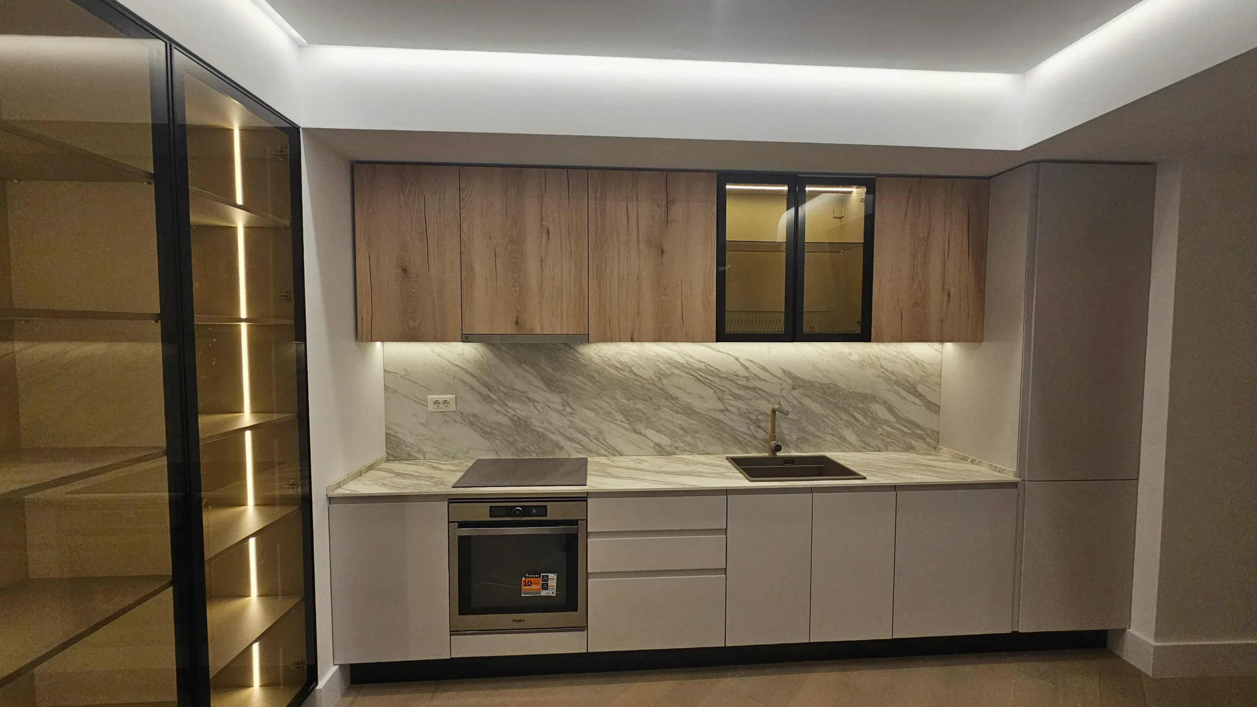 • Mobilier: executat la comandă, materiale premium (MDF vopsit mat, furnir, sticlă fumurie).