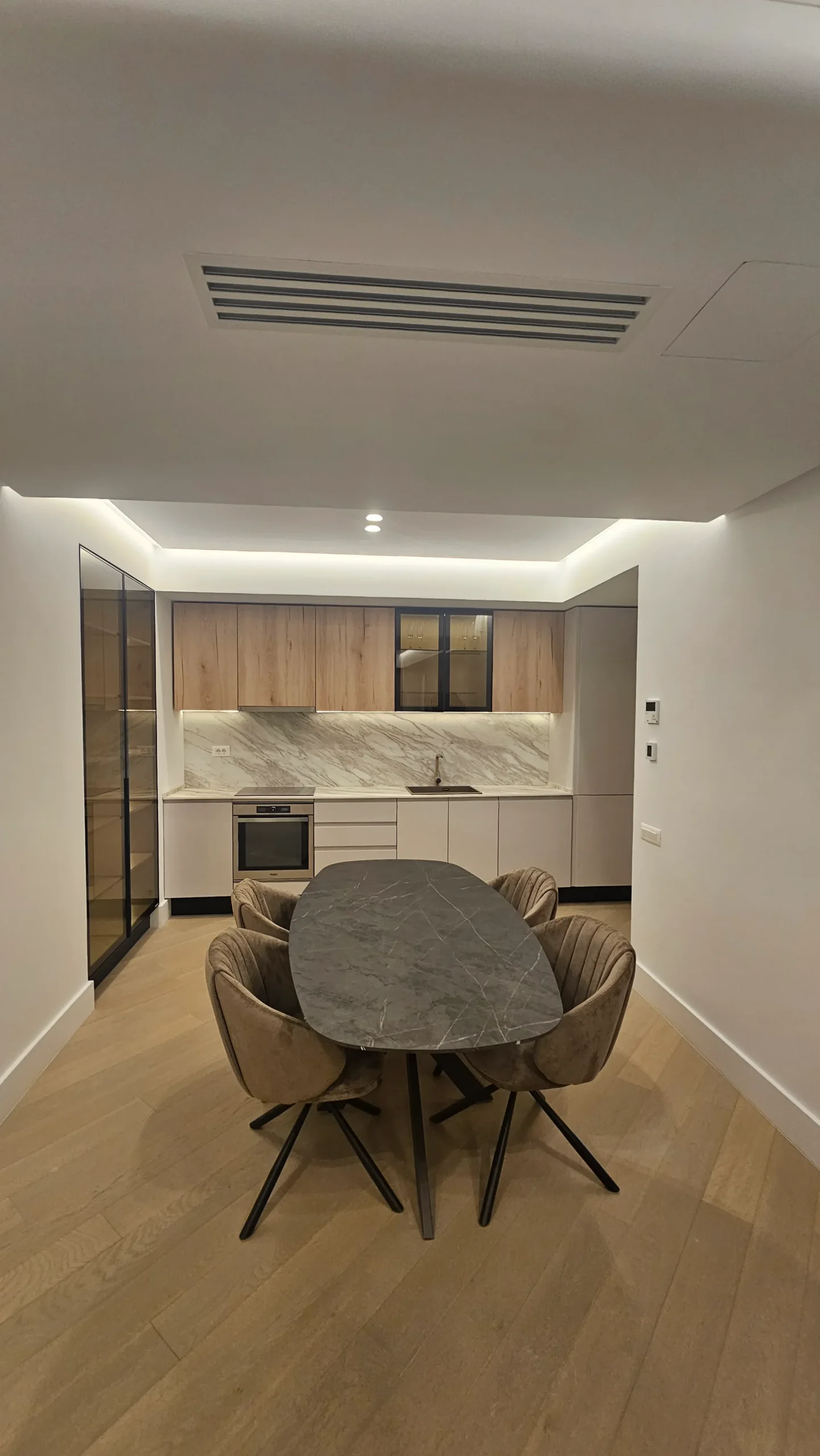 Masa de dining, cu blat ceramic în nuanțe închise și textură marmurată, este înconjurată de patru scaune tapițate în catifea fină, cu un design ergonomic, spătar rotunjit și picioare metalice negre. Este o zonă ideală pentru cine rafinate sau momente relaxante în familie.