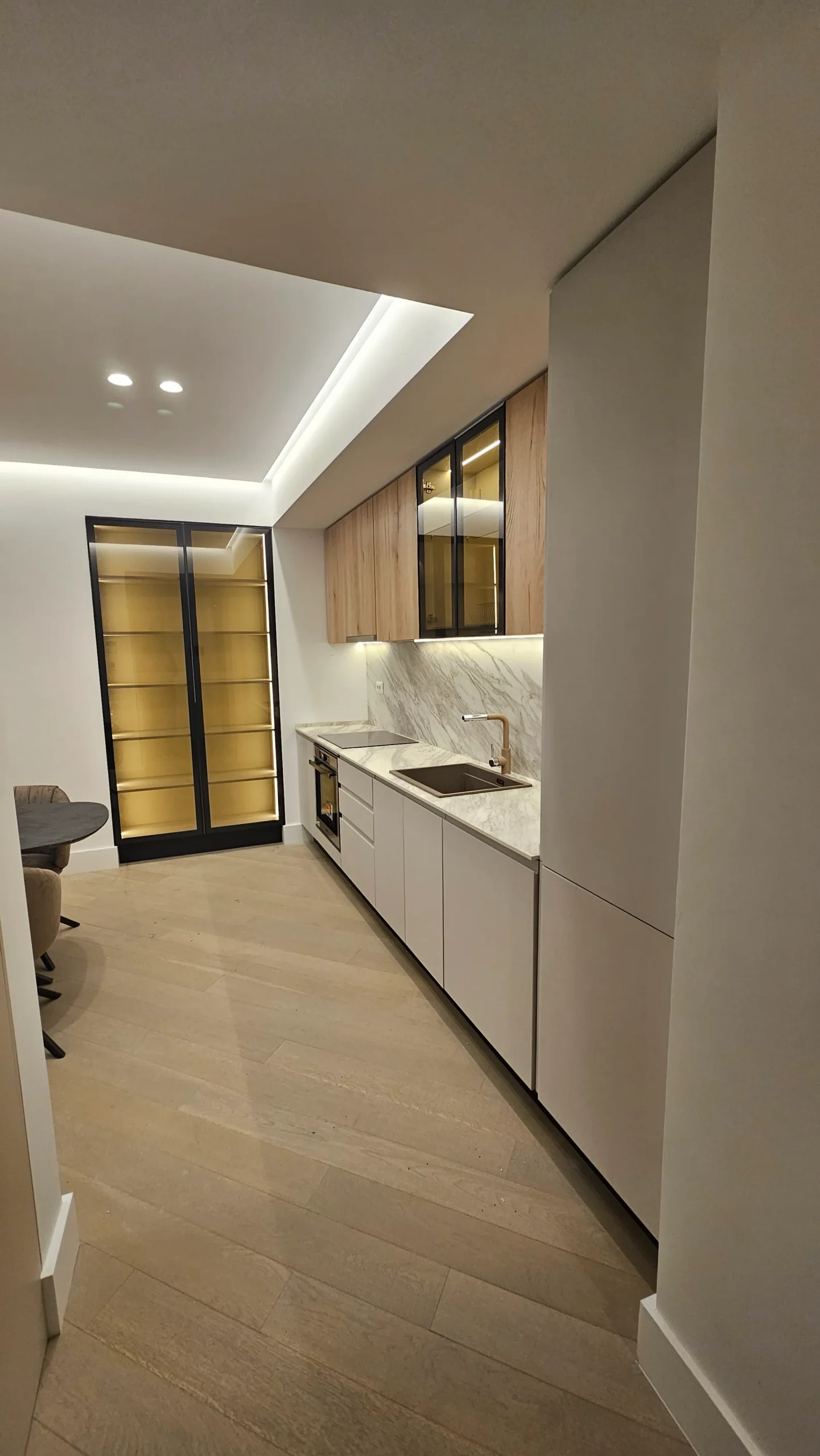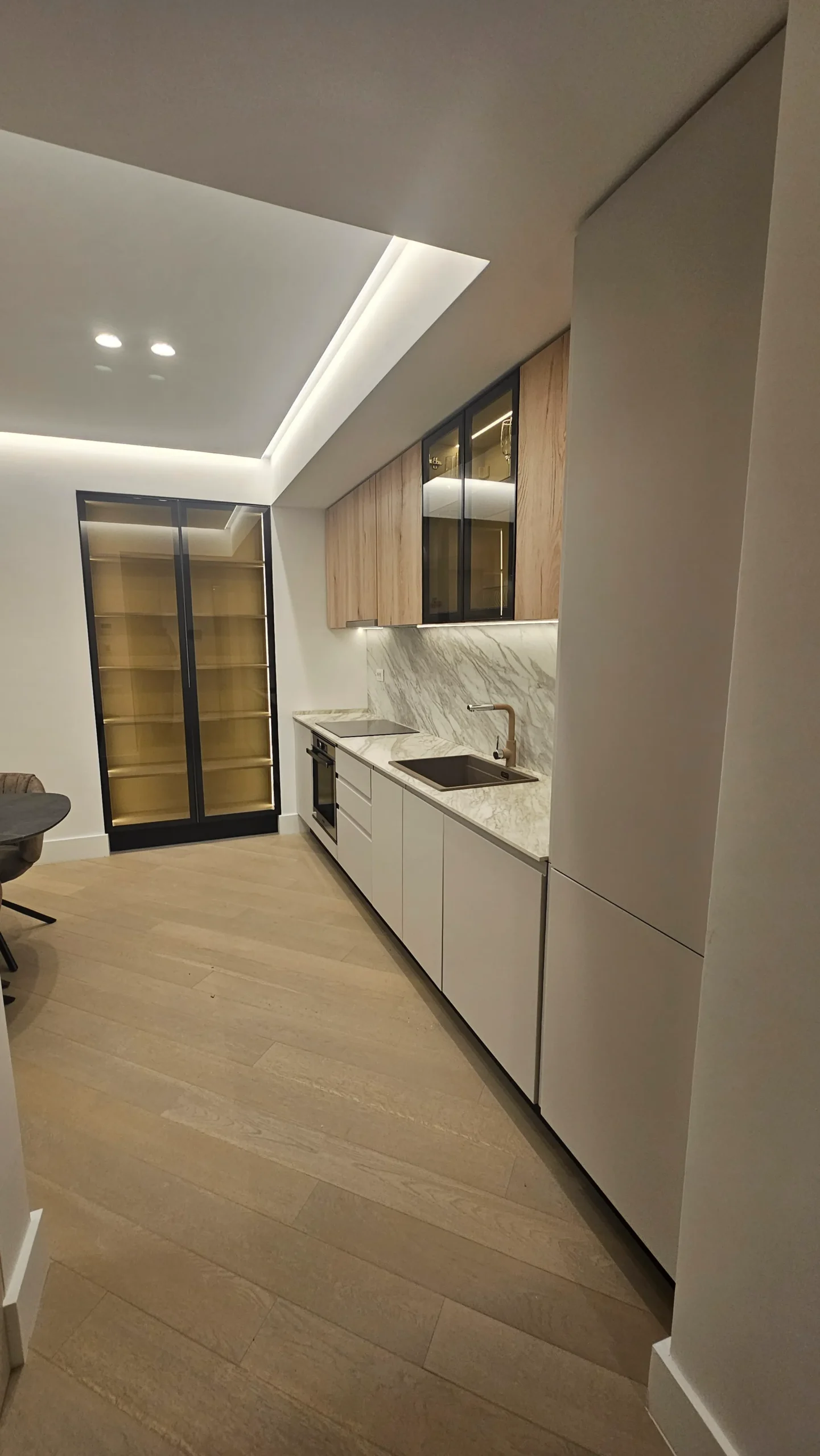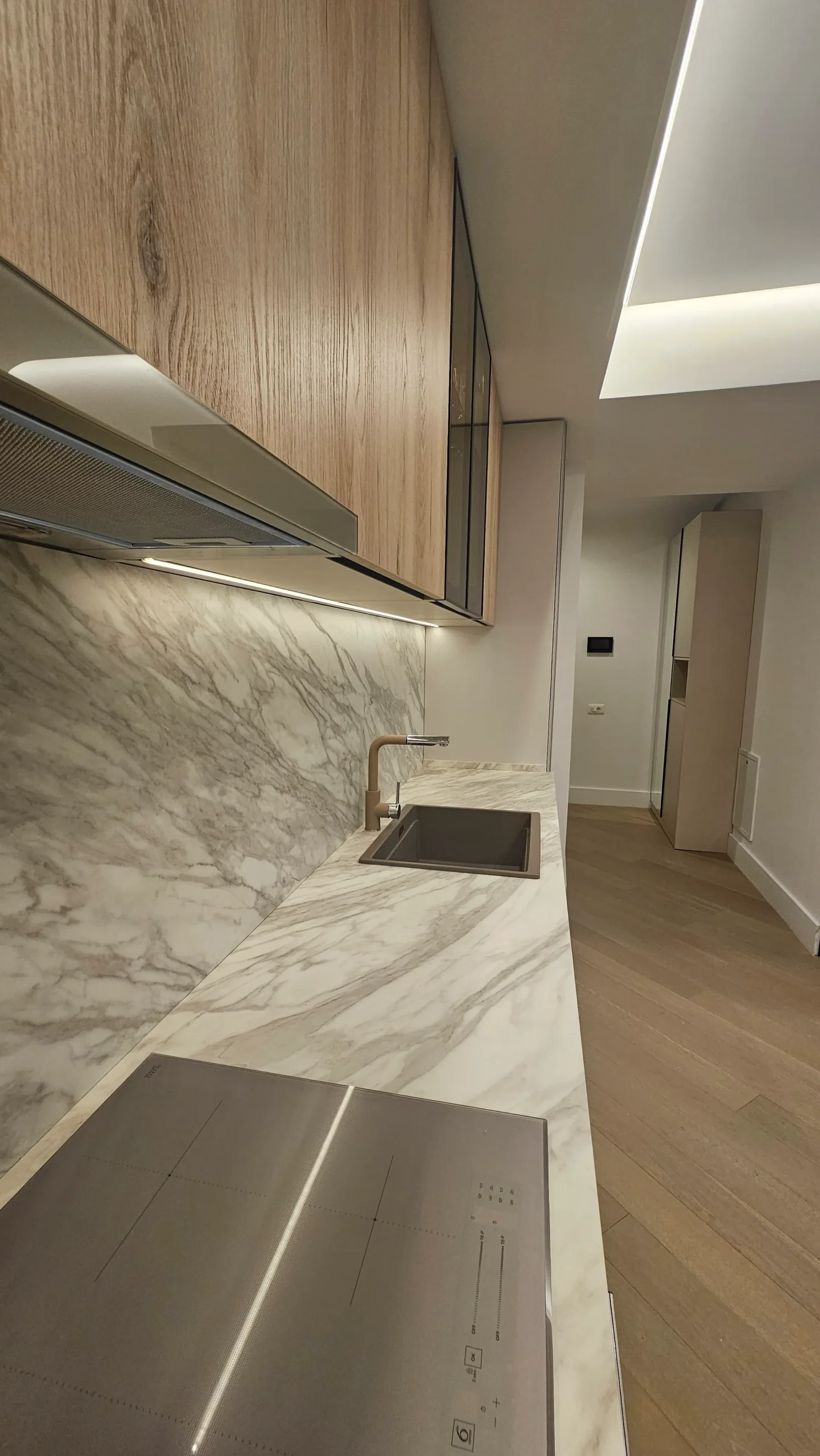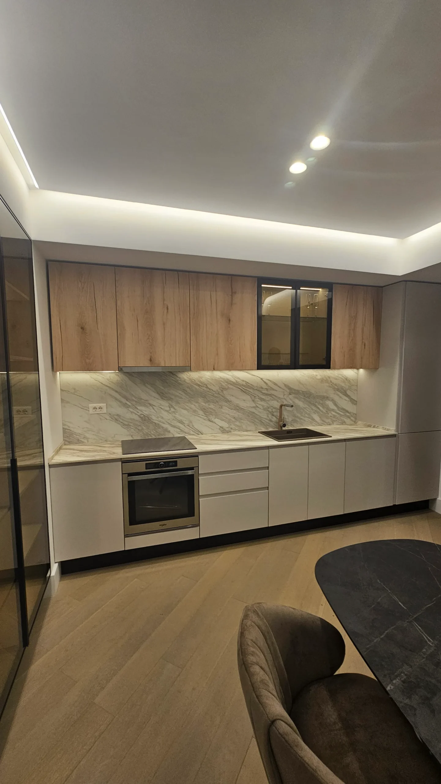 Bucătăria deschisă continuă linia de design cu mobilier personalizat, compus din fronturi mate crem în partea inferioară și corpuri suspendate din furnir de stejar deschis. Blatul și backsplash-ul sunt realizate din quartz compozit cu aspect de marmură albă, oferind atât rezistență, cât și eleganță.