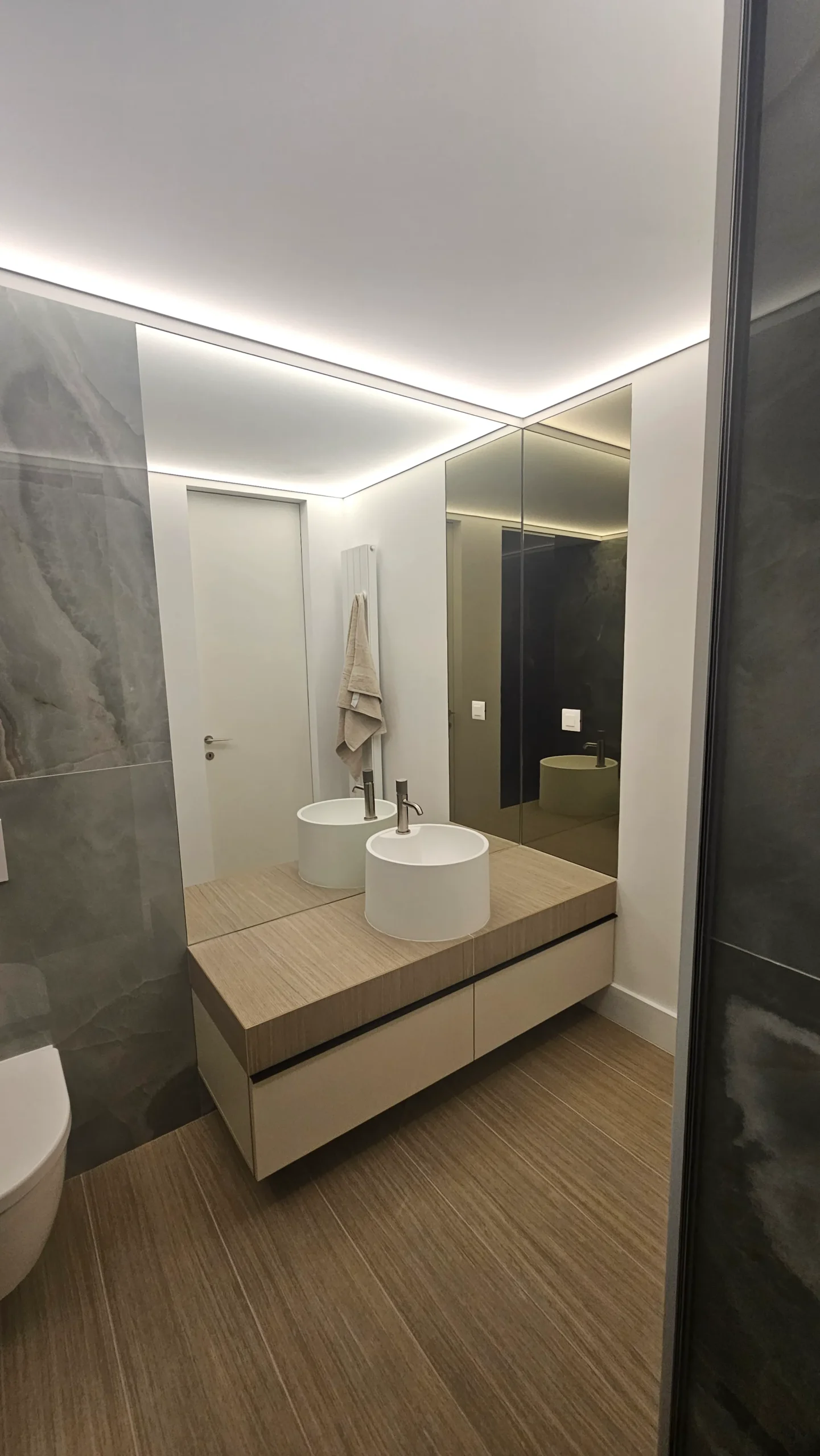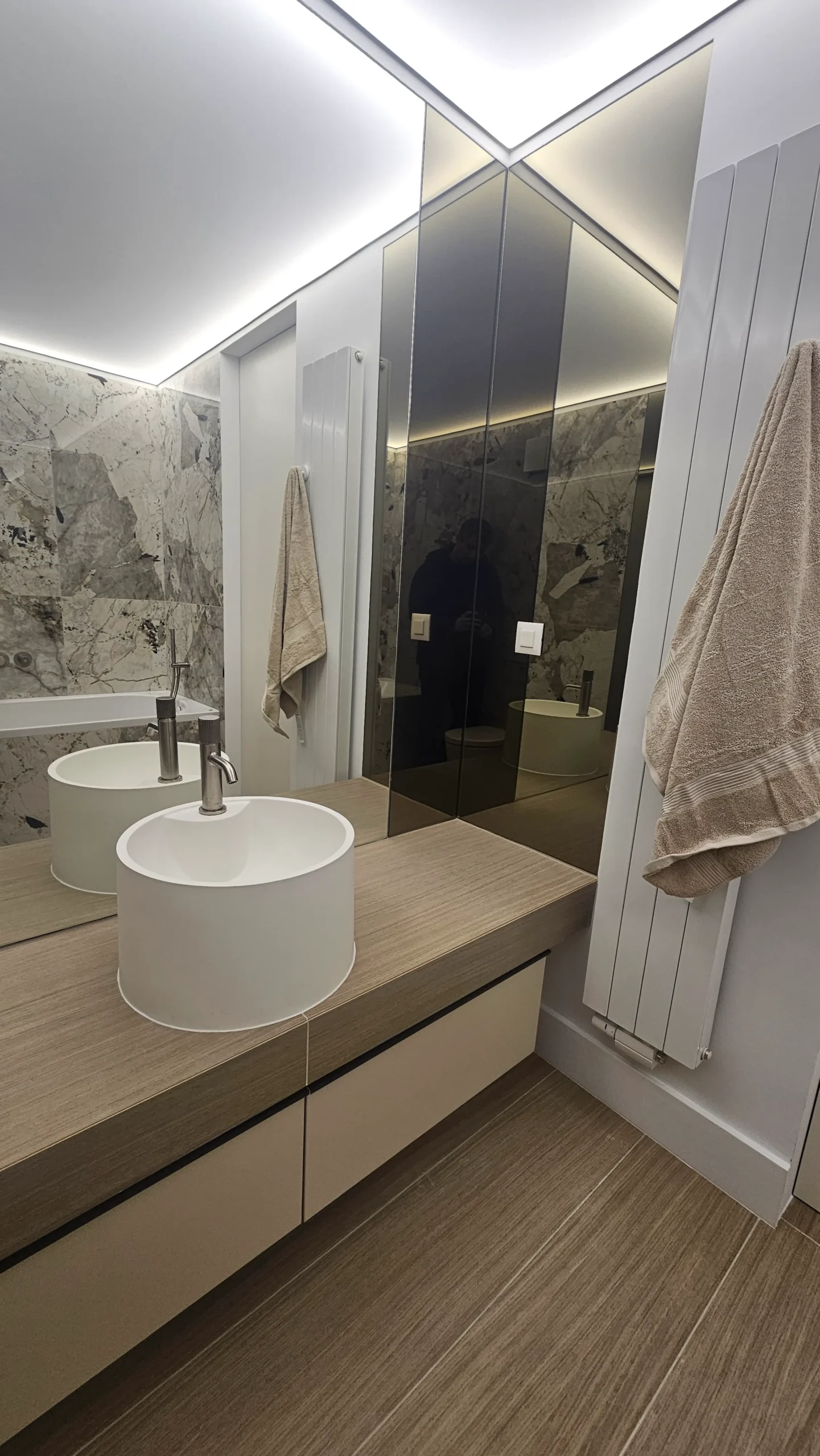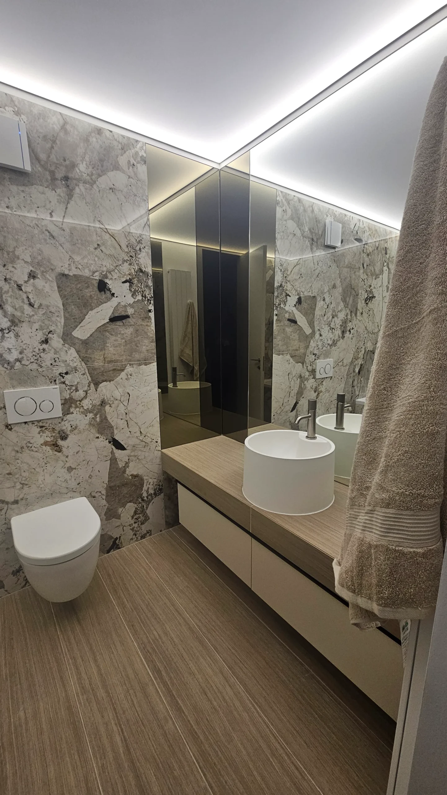 Baia principală este finisată cu plăci ceramice mari în nuanțe de gri-verde, cu aspect de onix, care creează un efect vizual spectaculos. Lavoarul cilindric este așezat pe un blat tip lemn deschis, încorporat într-un mobilier suspendat cu fronturi crem. Oglinda este placată pe întreg peretele, cu iluminare LED pe conturul tavanului, oferind lumină difuză și rafinament.