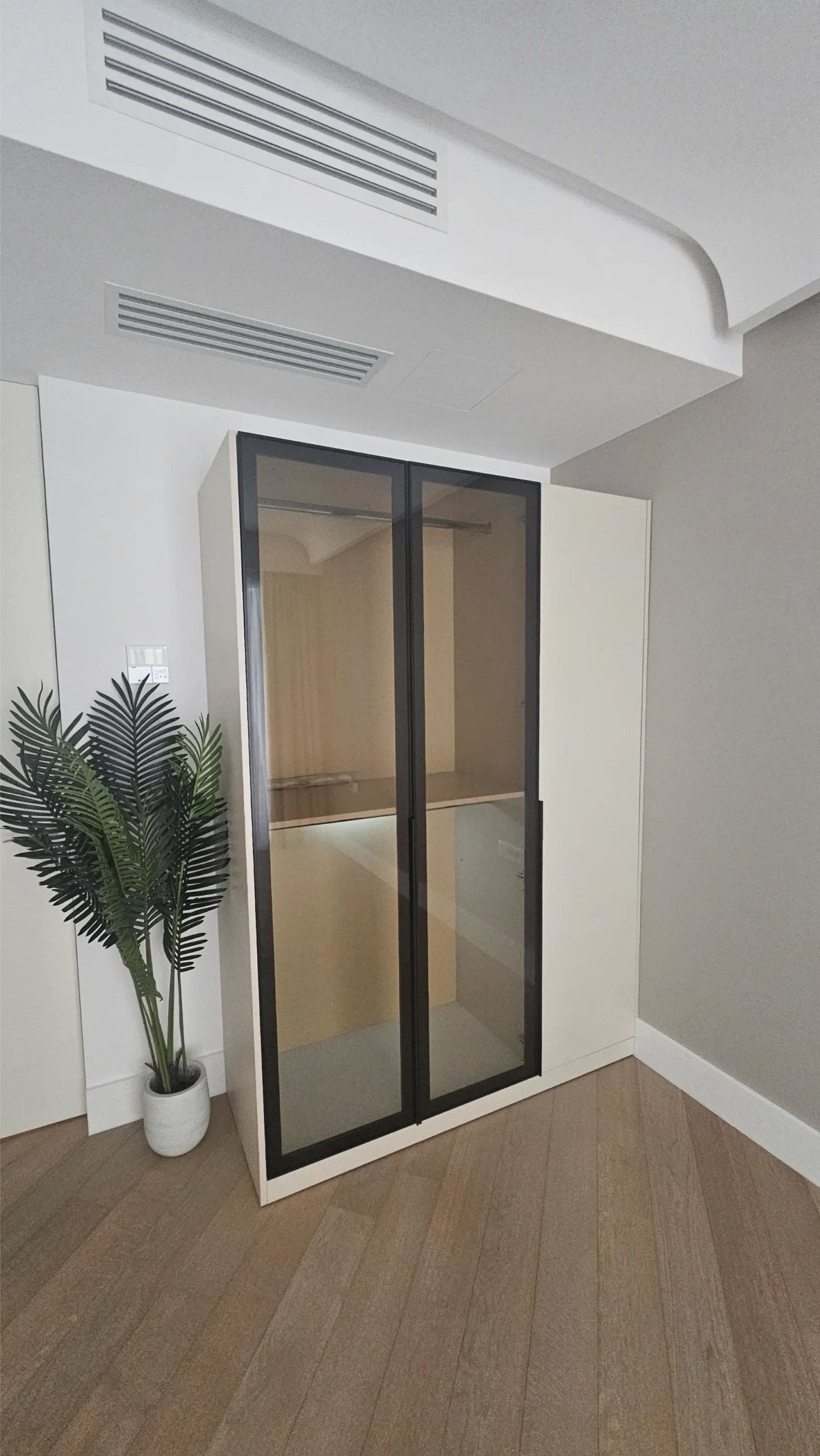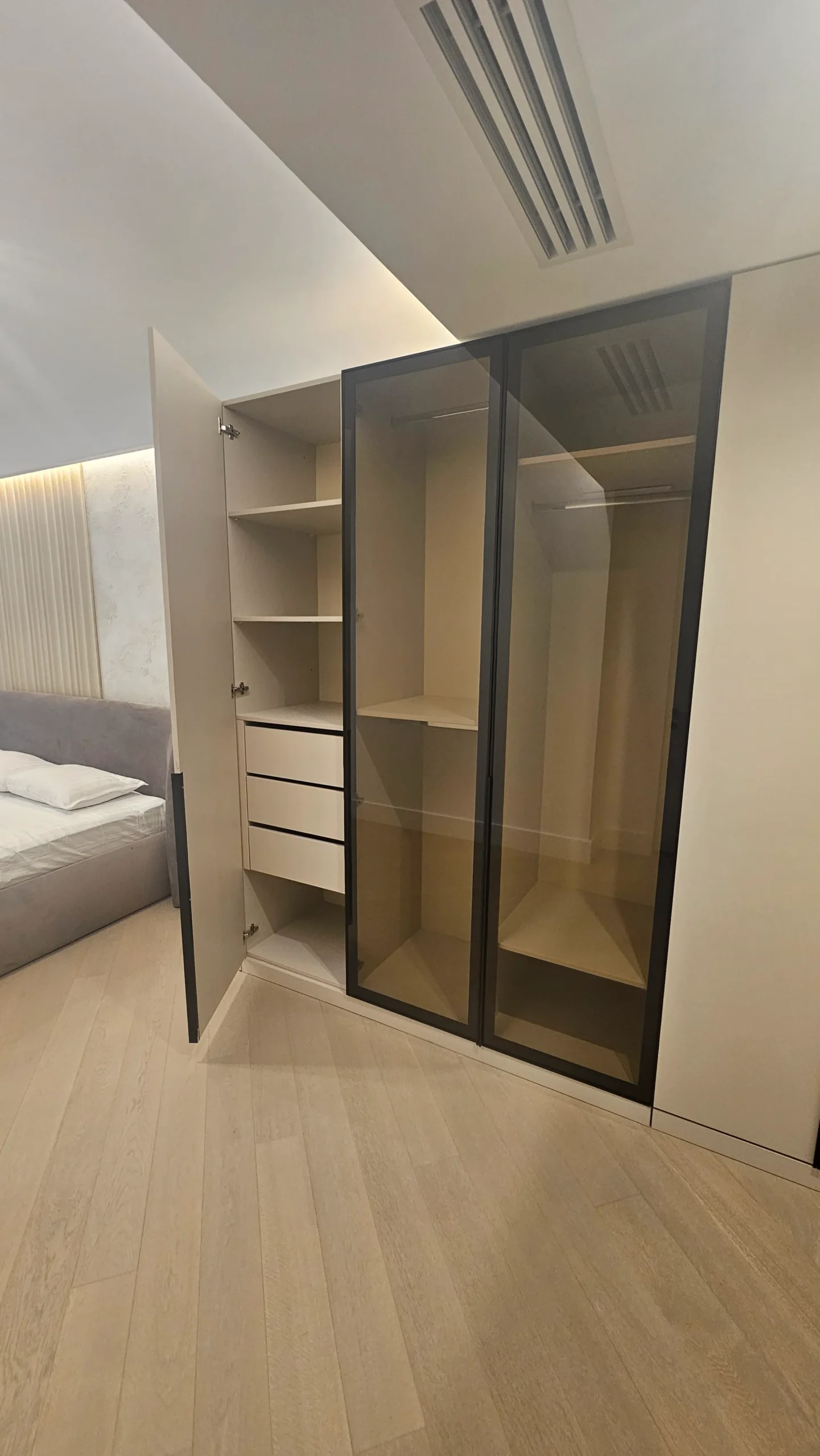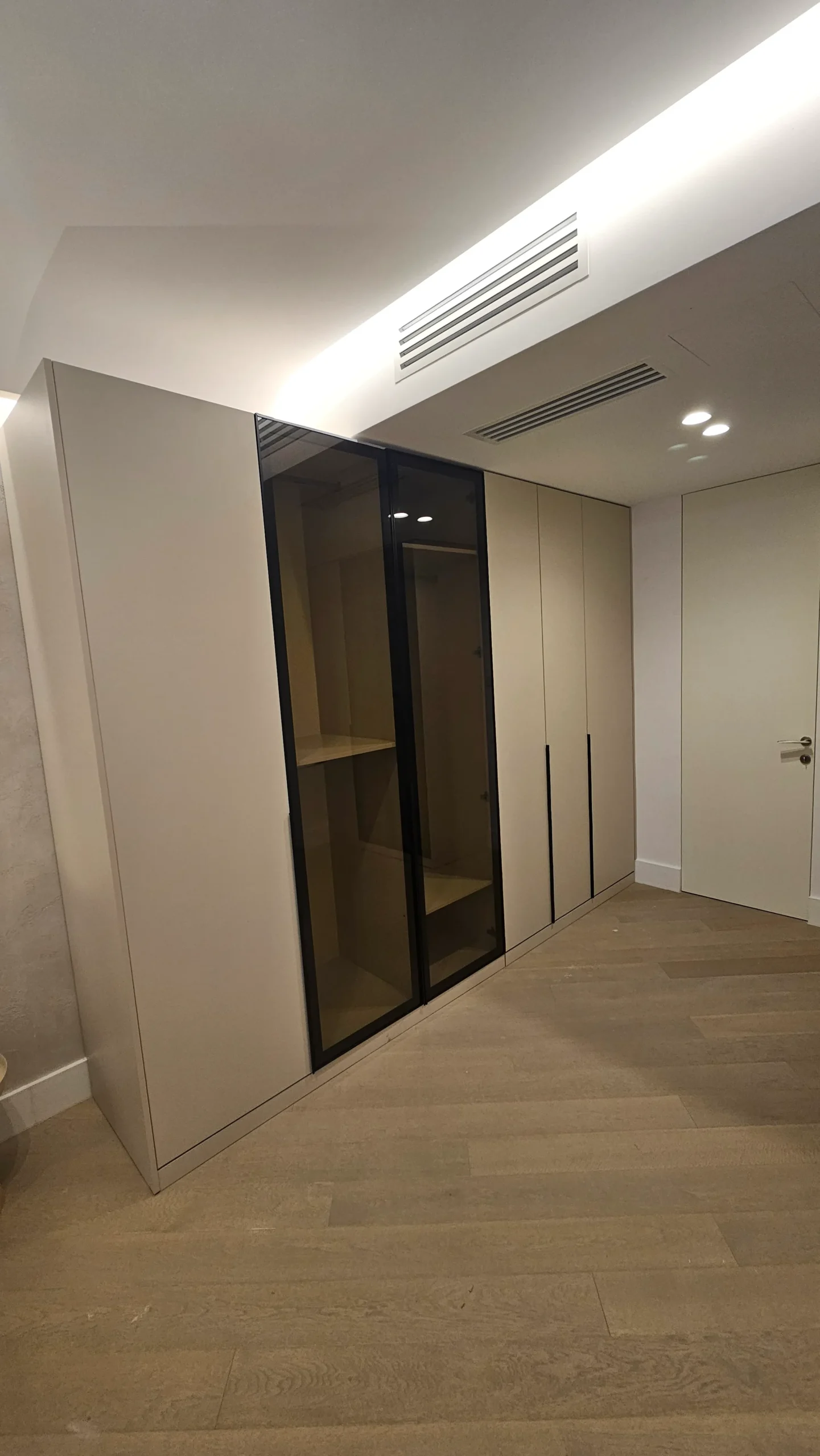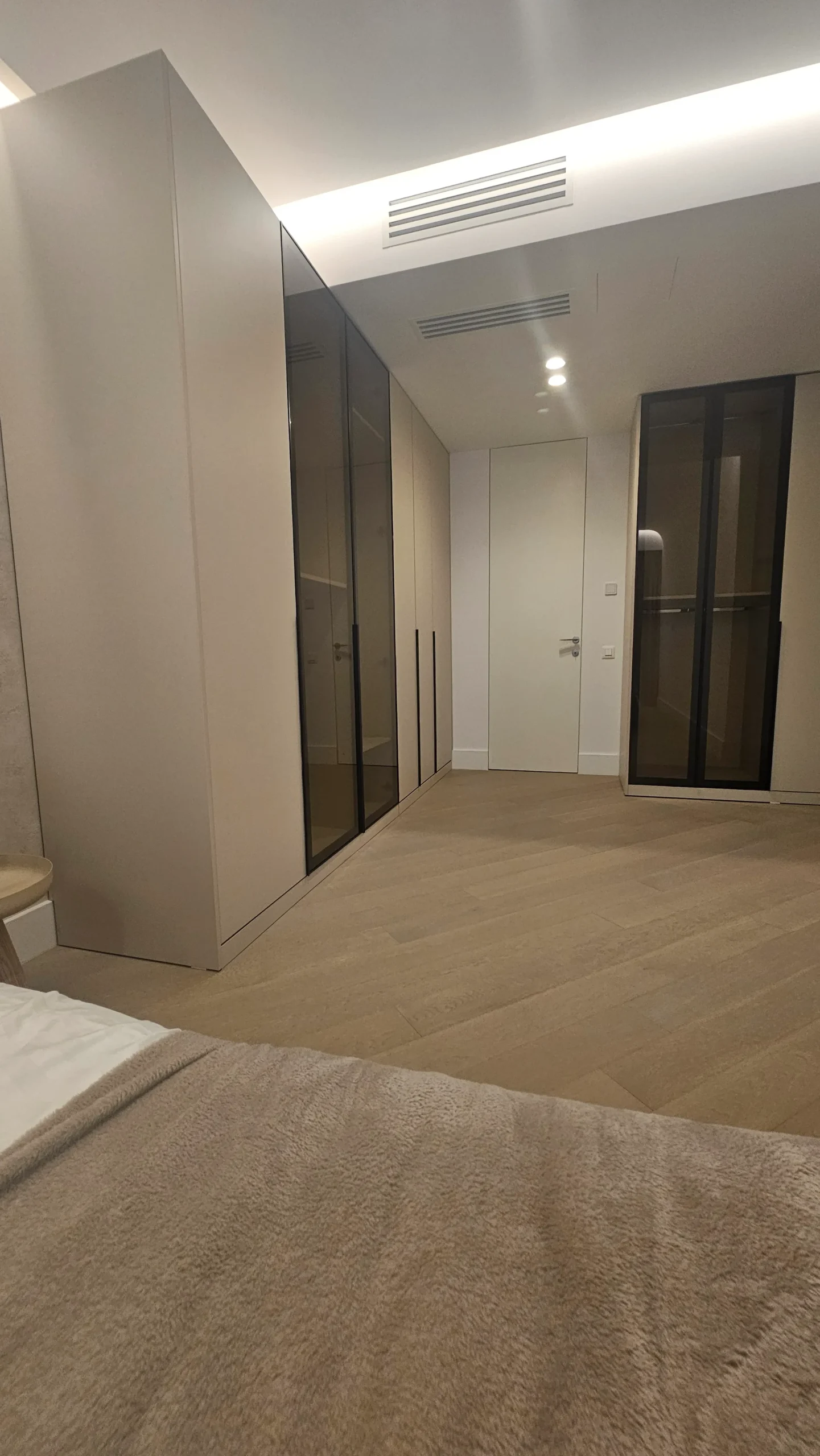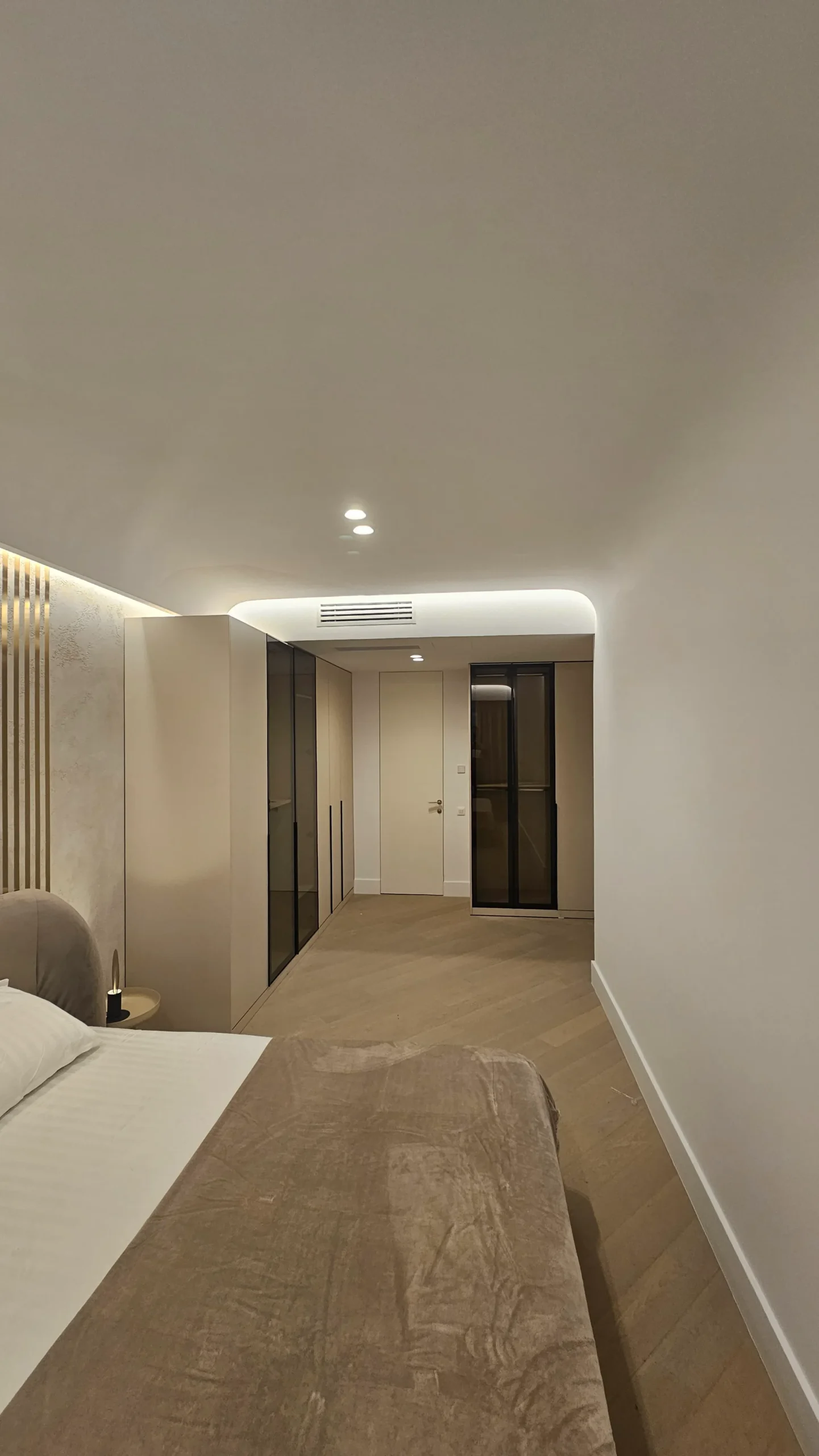 Peretele din spatele patului este tratat decorativ, cu tencuială venetiană bej deschisă și inserții verticale metalice aurii, puse în valoare de un sistem discret de LED warm white. Dressingul are uși din sticlă fumurie și rame metalice negre, cu interior organizat funcțional.