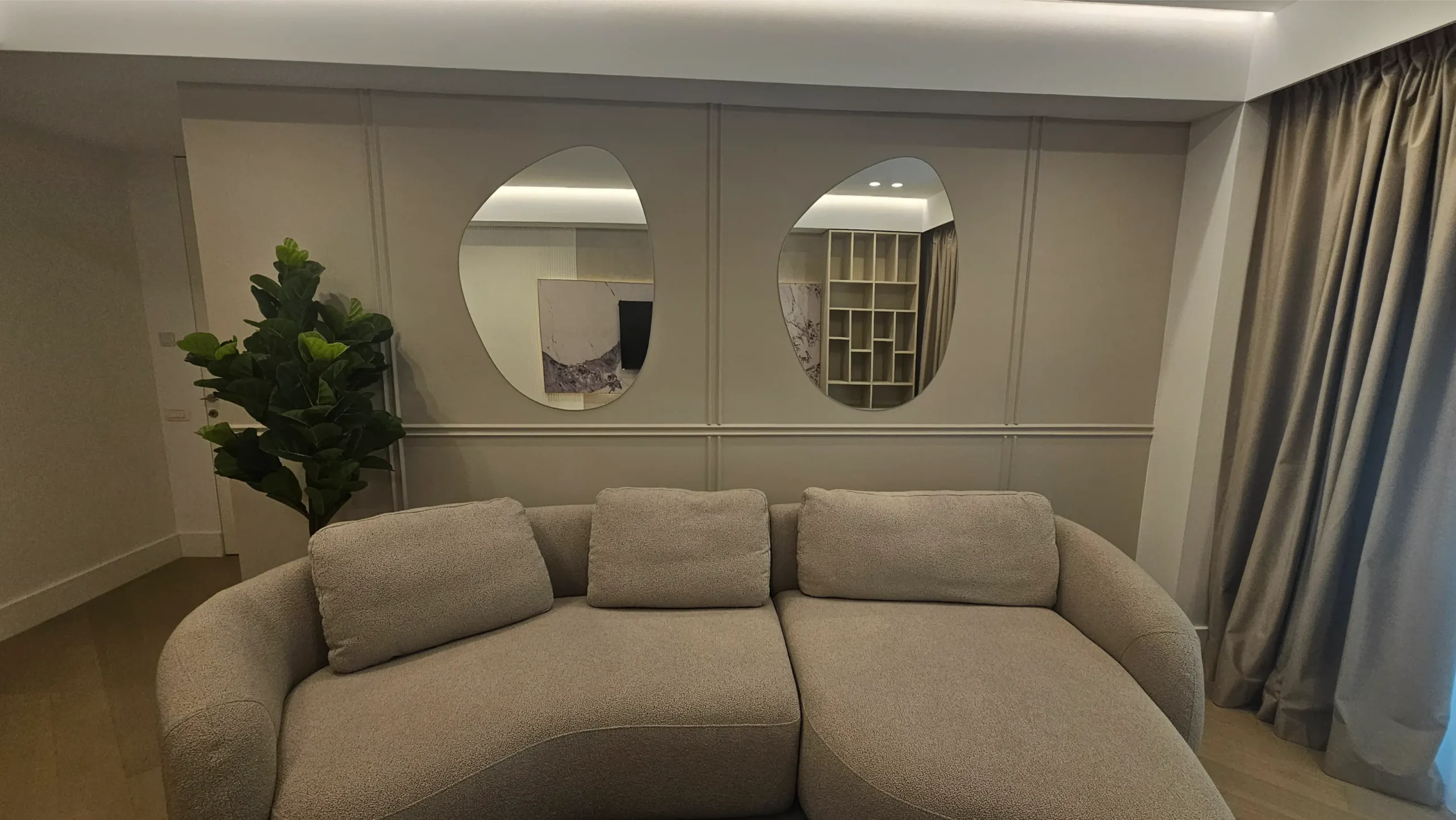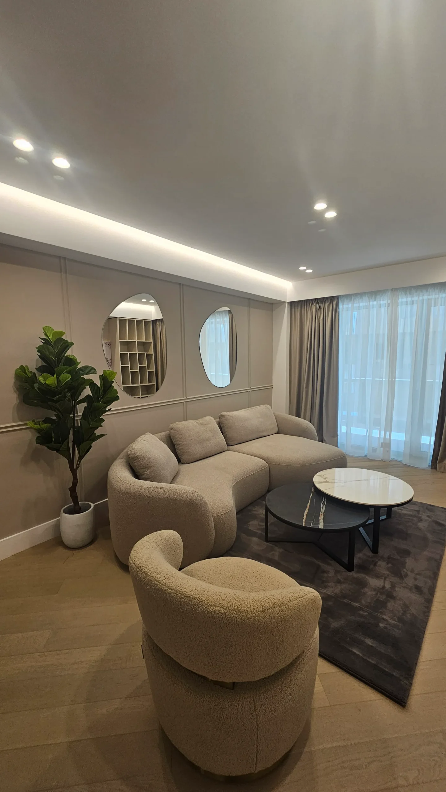 Zona de zi este spațioasă și luminoasă, cu acces direct către balcon prin ferestre ample, care lasă lumina naturală să curgă în interior. Canapeaua modulară, realizată din țesătură tip bouclé crem, cu forme curbate și volumetrie organică, creează o atmosferă relaxantă, completată de un fotoliu în același stil.