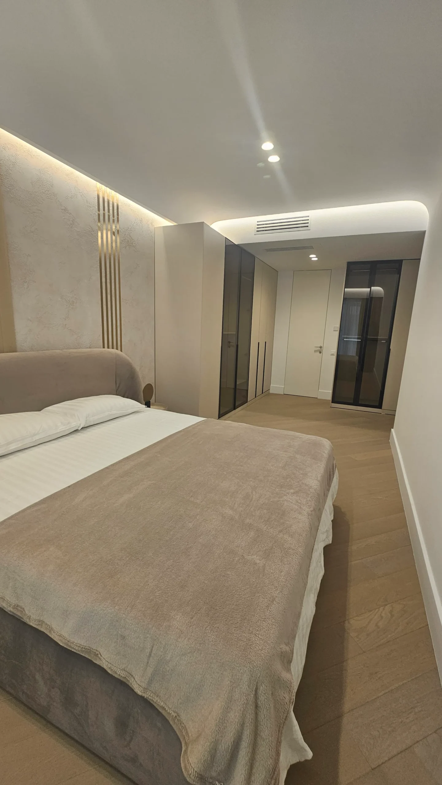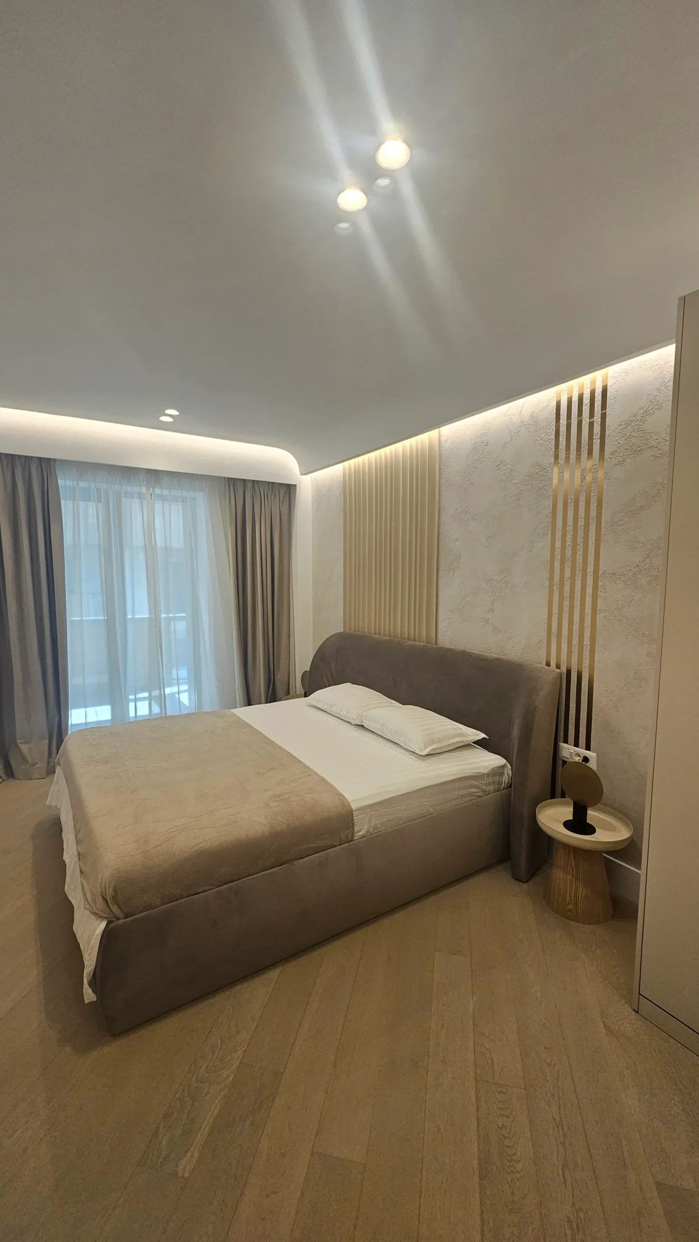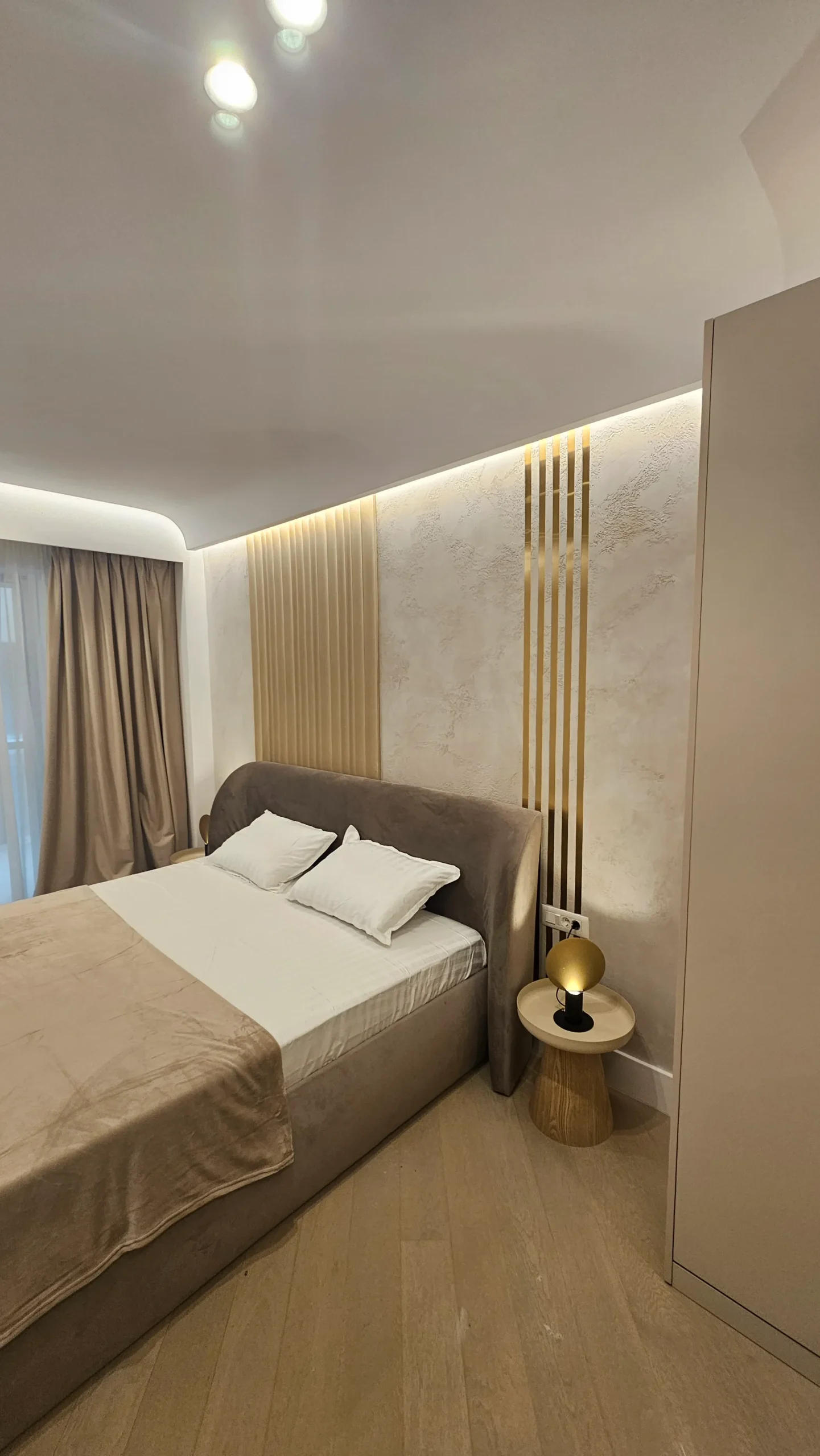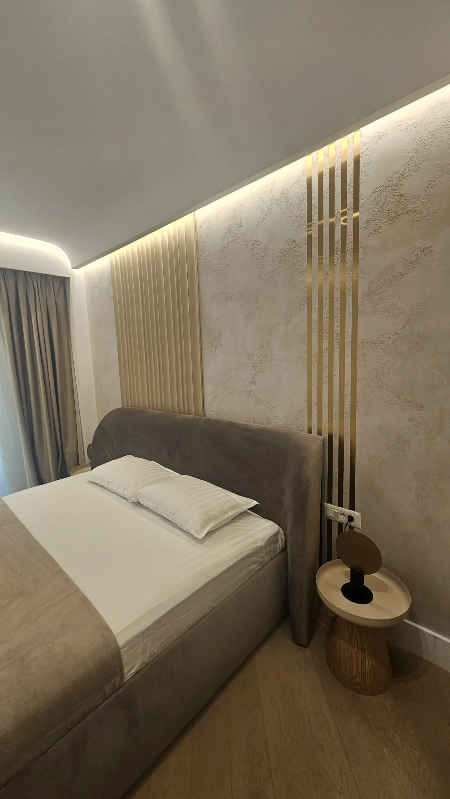 Dormitorul principal este o oază de liniște, cu un pat generos, tapițat în velur moale de culoare taupe, completat de o tăblie rotunjită și impunătoare, cu design hotelier. Noptierele minimaliste din lemn natural găzduiesc lămpi aurii cu abajur sferic mat, perfecte pentru lumină ambientală.