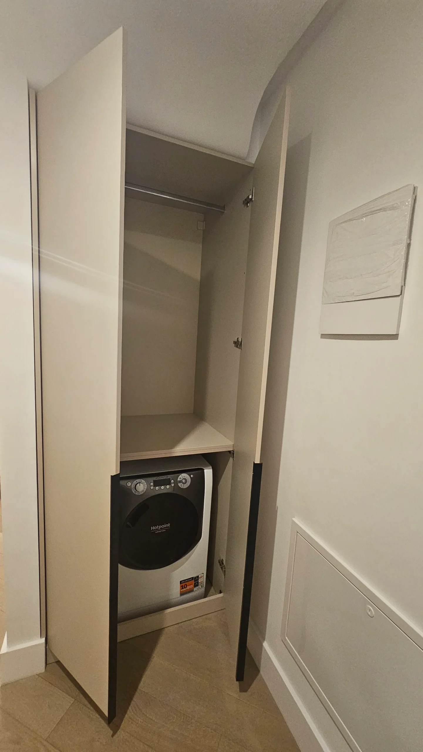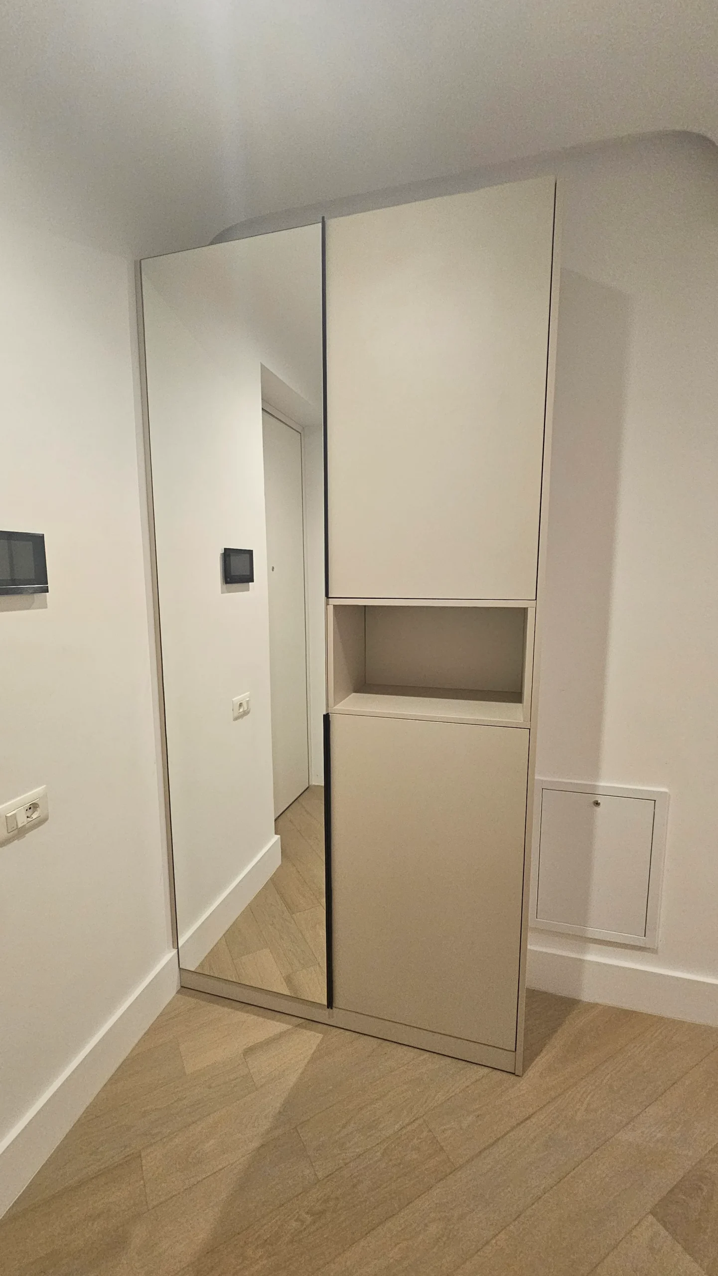 Holul este gândit funcțional, cu mobilier încastrat, uși ascunse în panouri mate, care integrează inclusiv un spațiu tehnic dedicat mașinii de spălat. Totul este finisat în tonuri neutre, păstrând linia curată și elegantă a întregului apartament.
