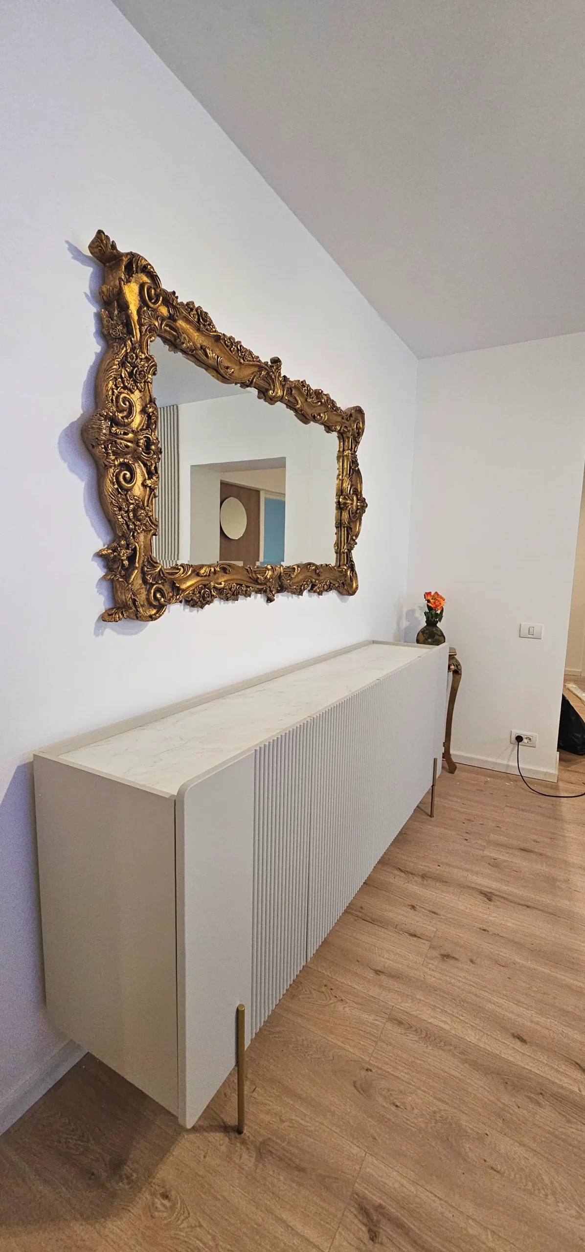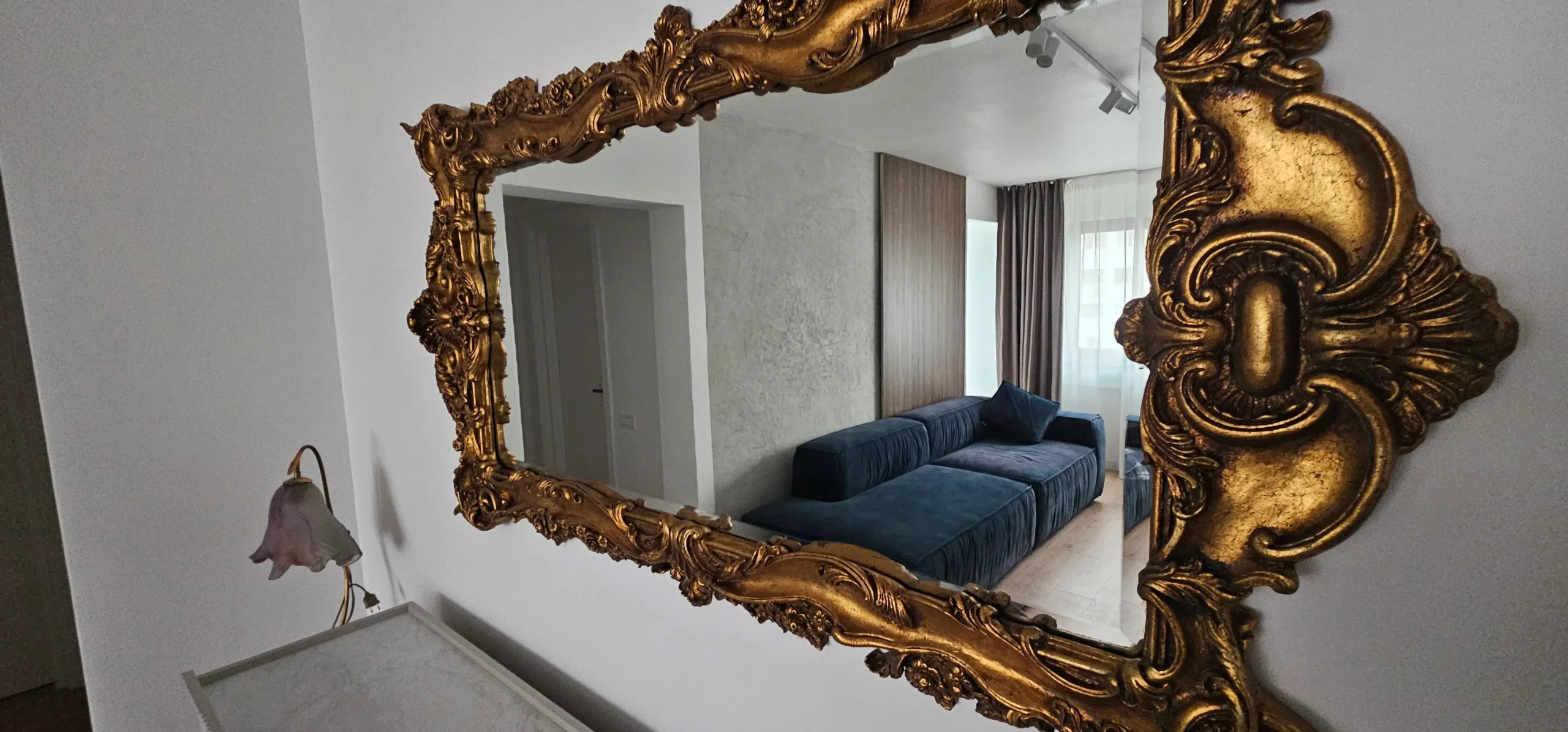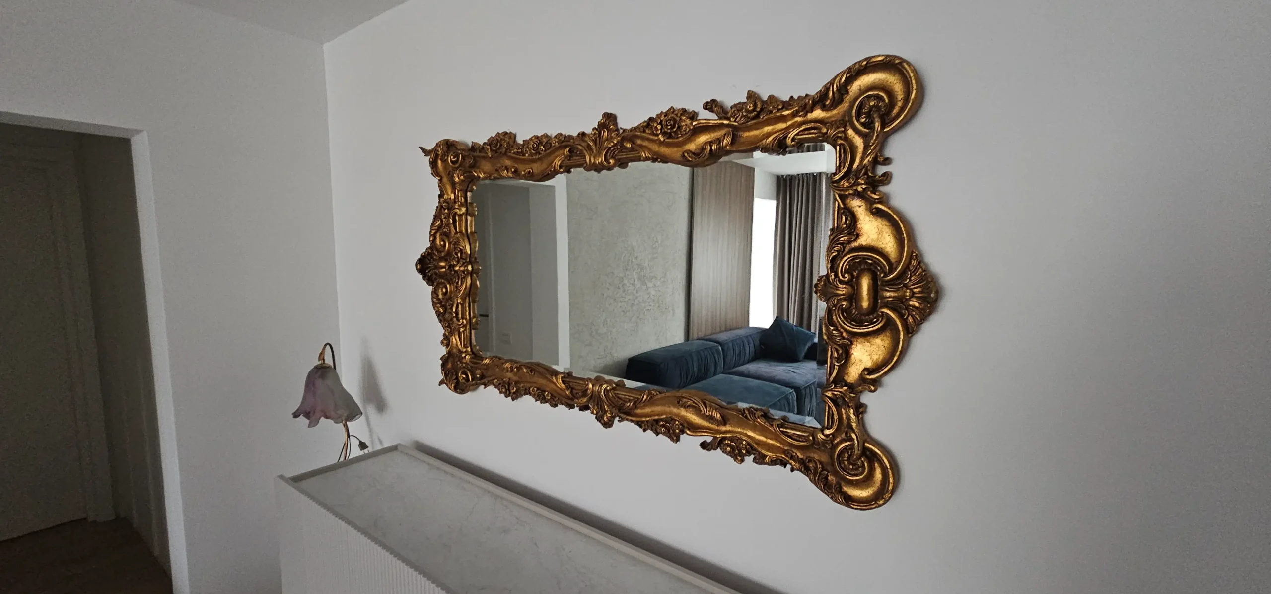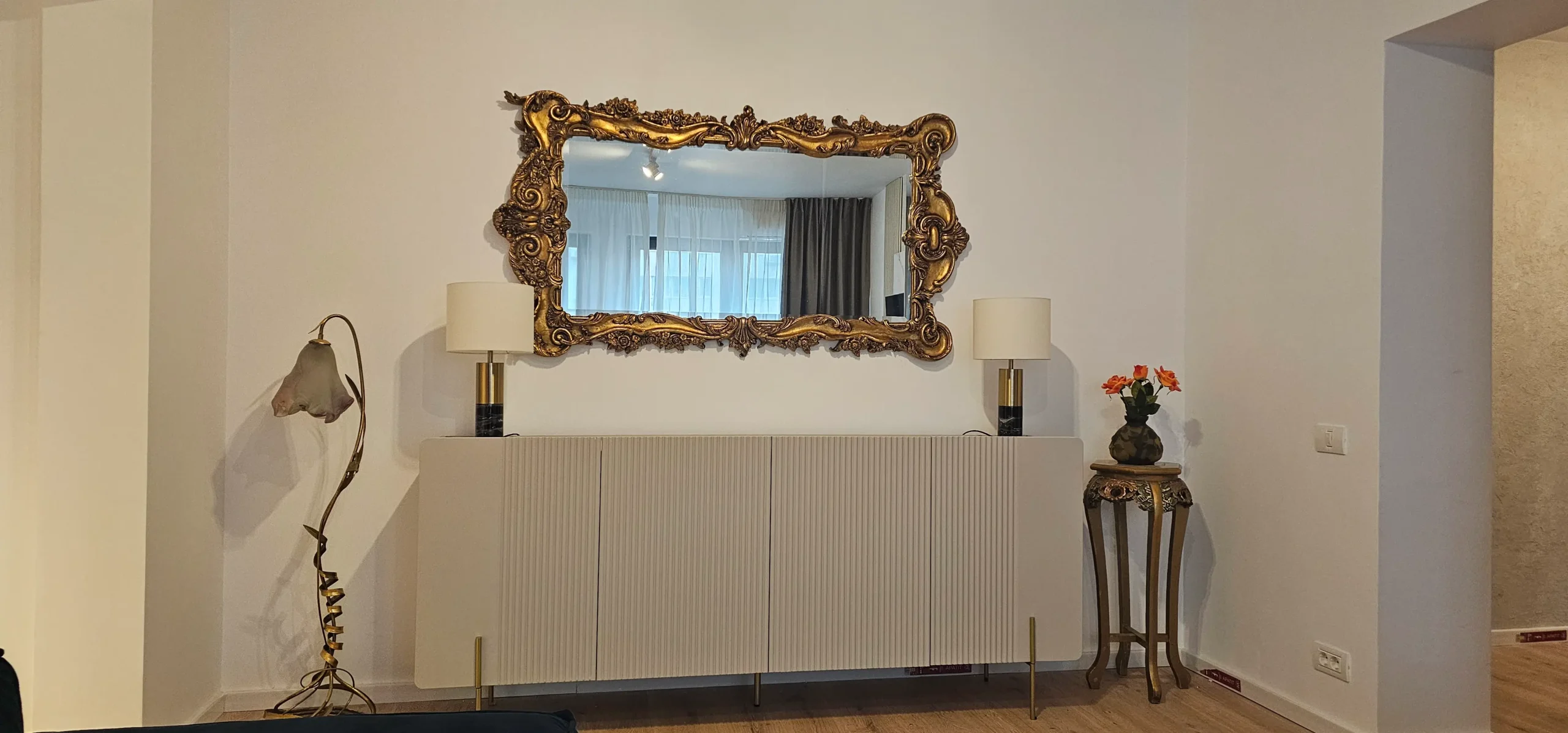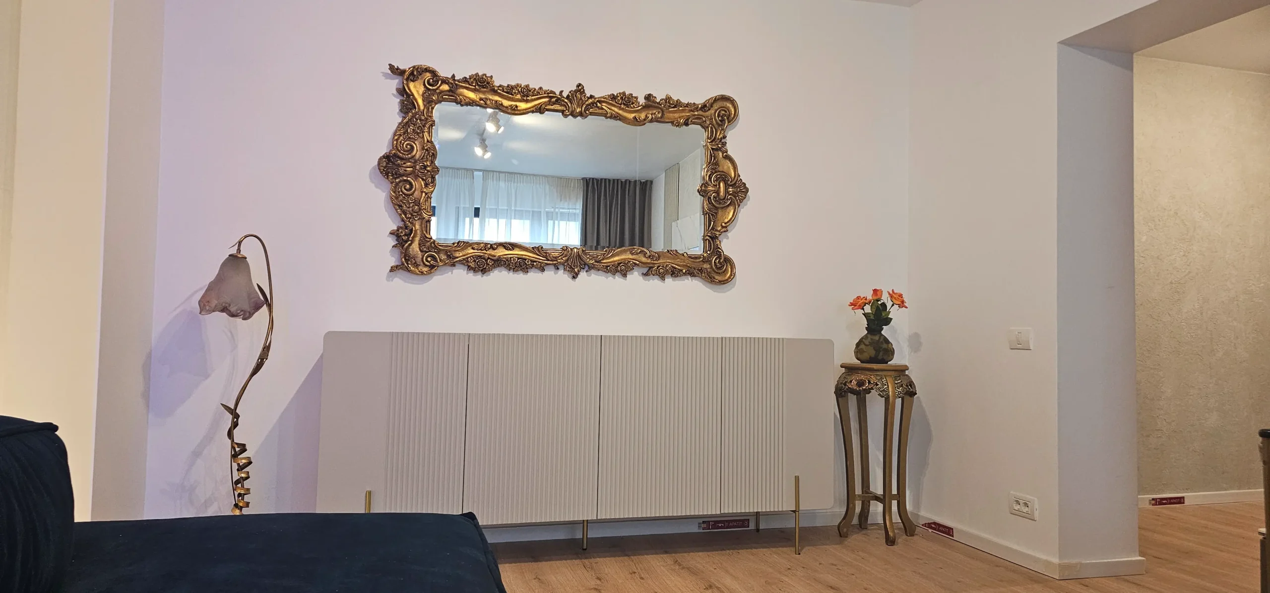 Livingul este generos și elegant, îmbinând elemente moderne cu accente clasice. Canapeaua mare, în nuanțe închise, devine punctul central al încăperii, oferind confort și stil. Un element deosebit este oglinda baroc aurie, care creează un contrast elegant cu mobilierul minimalist și conferă o notă de rafinament. Peretele decorativ din lemn și texturile naturale adaugă profunzime spațiului, contribuind la o atmosferă caldă și primitoare.