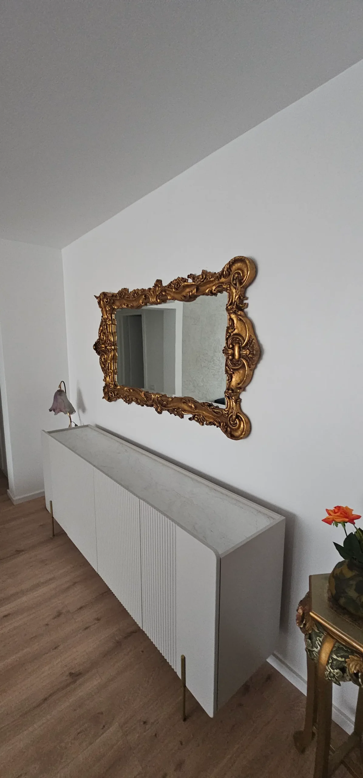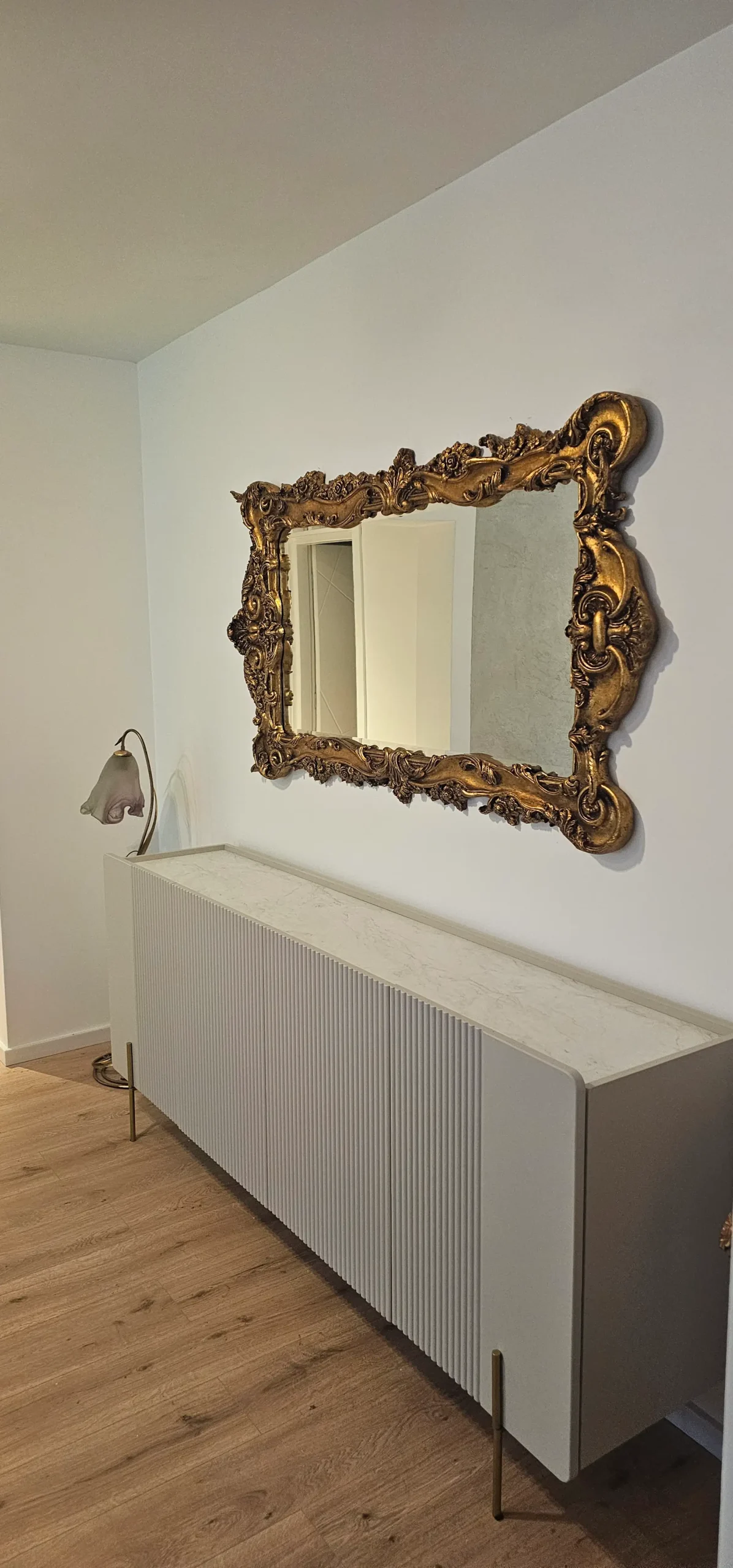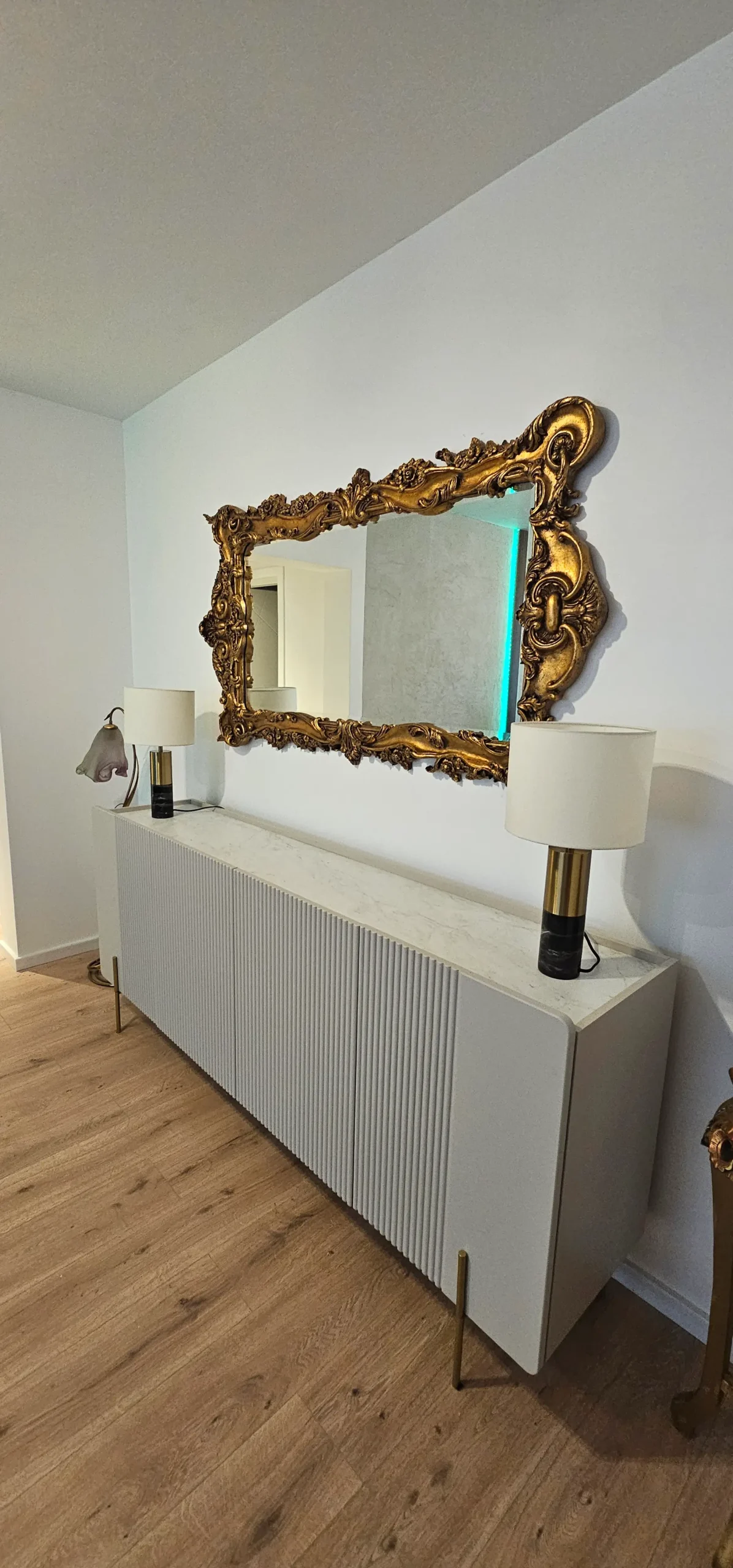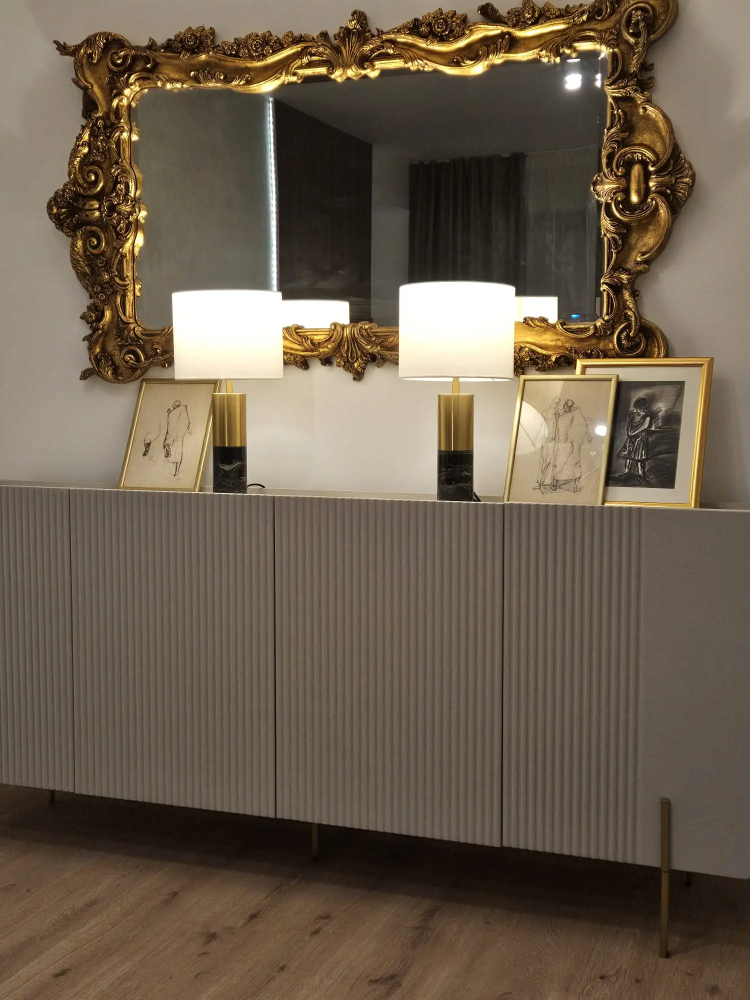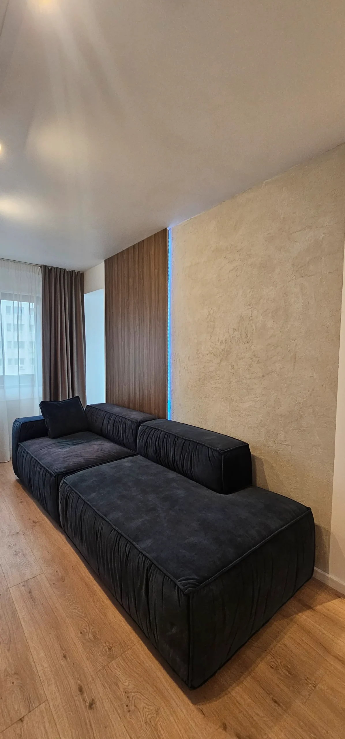 Livingul este generos și elegant, îmbinând elemente moderne cu accente clasice. Canapeaua mare, în nuanțe închise, devine punctul central al încăperii, oferind confort și stil. Un element deosebit este oglinda baroc aurie, care creează un contrast elegant cu mobilierul minimalist și conferă o notă de rafinament. Peretele decorativ din lemn și texturile naturale adaugă profunzime spațiului, contribuind la o atmosferă caldă și primitoare.