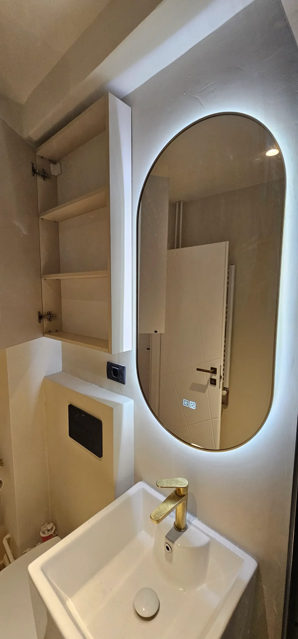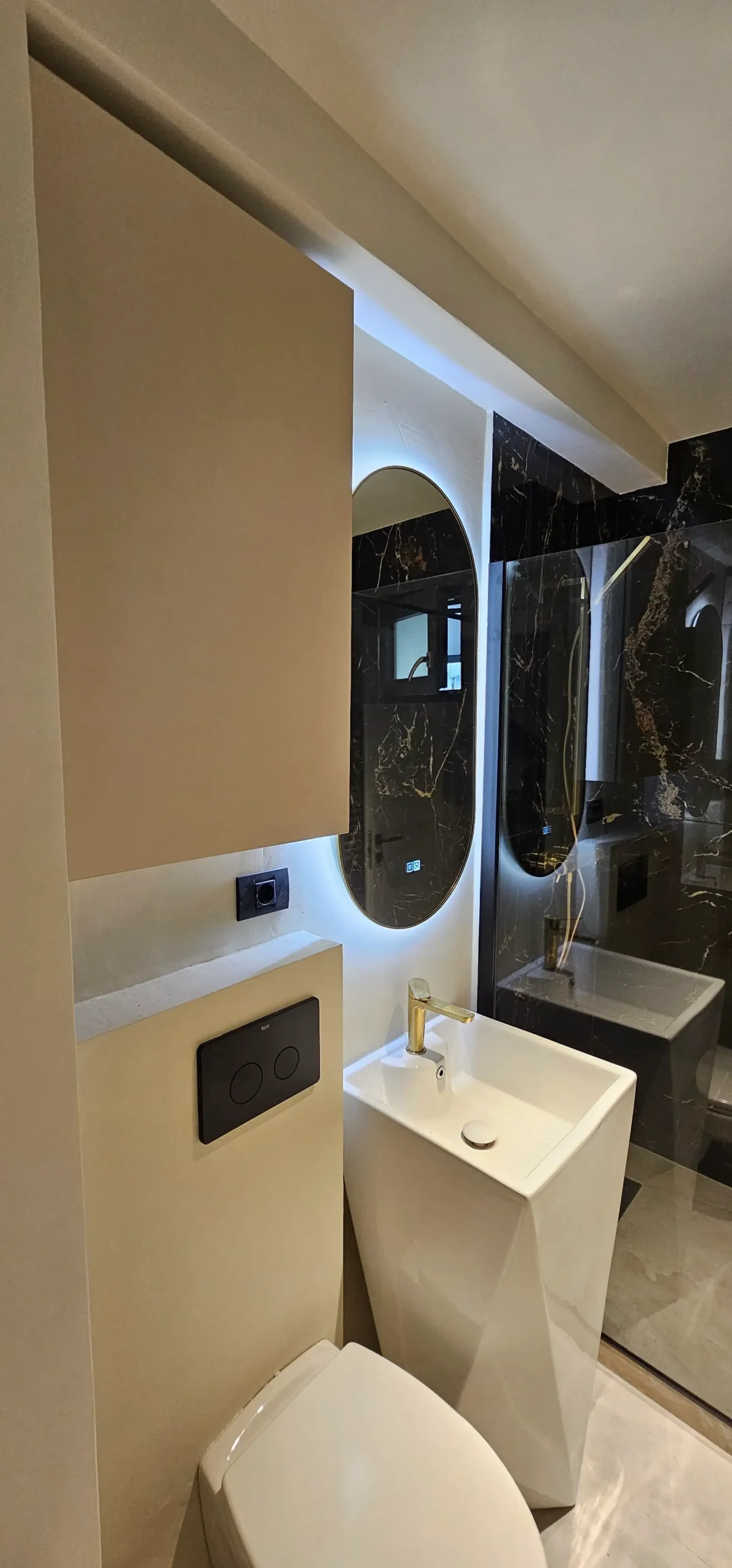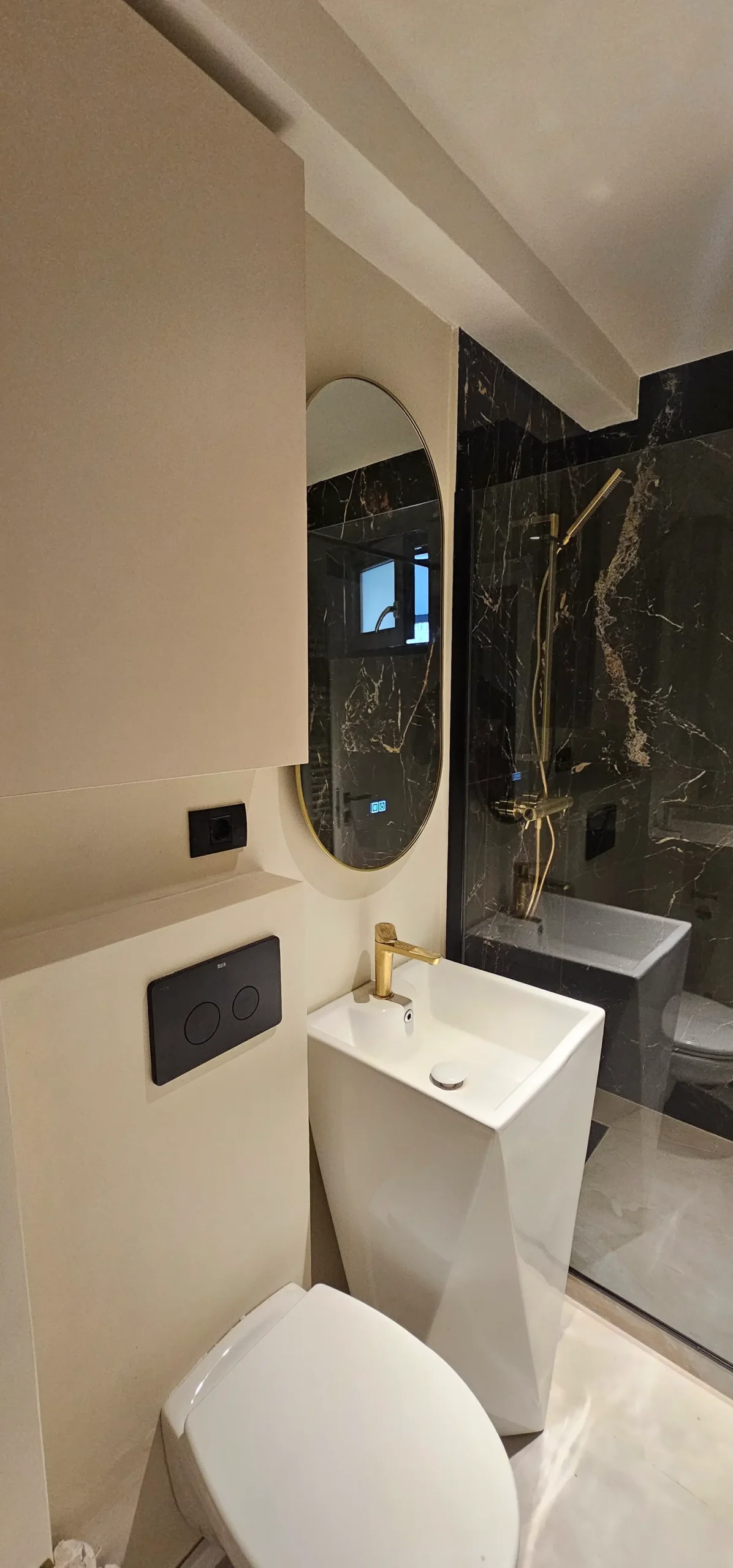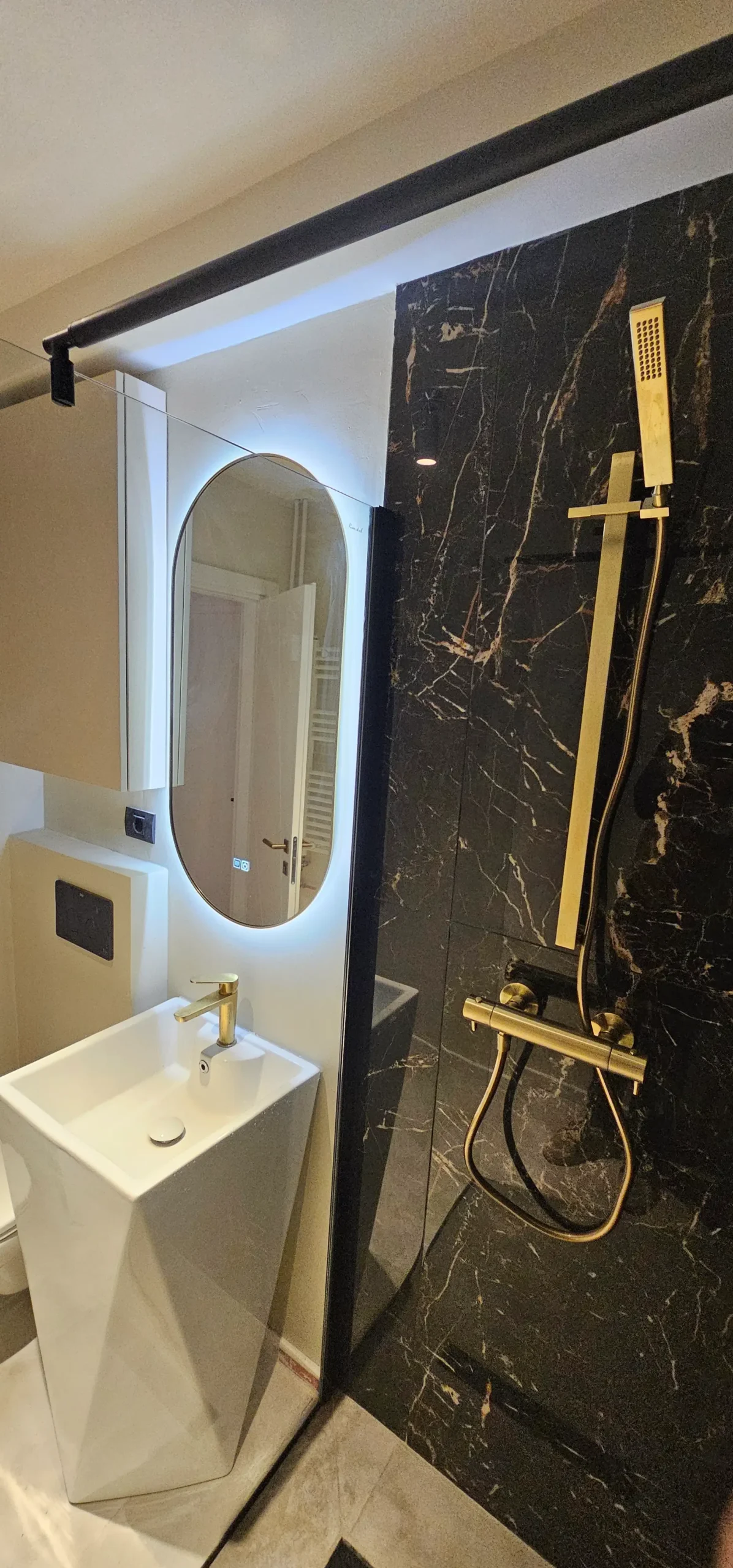 Baia este un exemplu de design sofisticat și funcțional, având finisaje premium din marmură neagră cu inserții aurii. Obiectele sanitare moderne includ un lavoar geometric alb și o baterie aurie, care completează designul rafinat. Oglinda iluminată LED adaugă un plus de eleganță, iar dușul tip walk-in, delimitat de sticlă fumurie, transformă baia într-un spațiu luxos și practic.