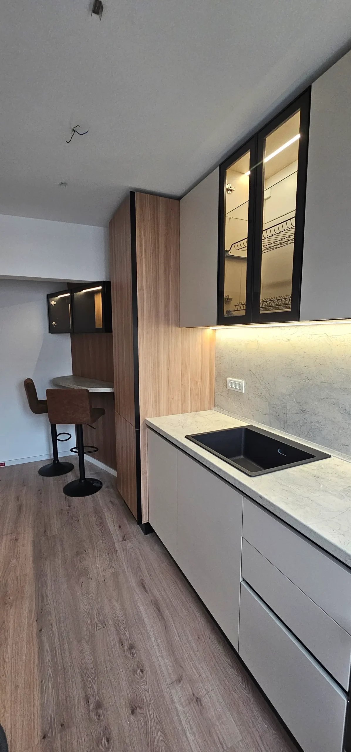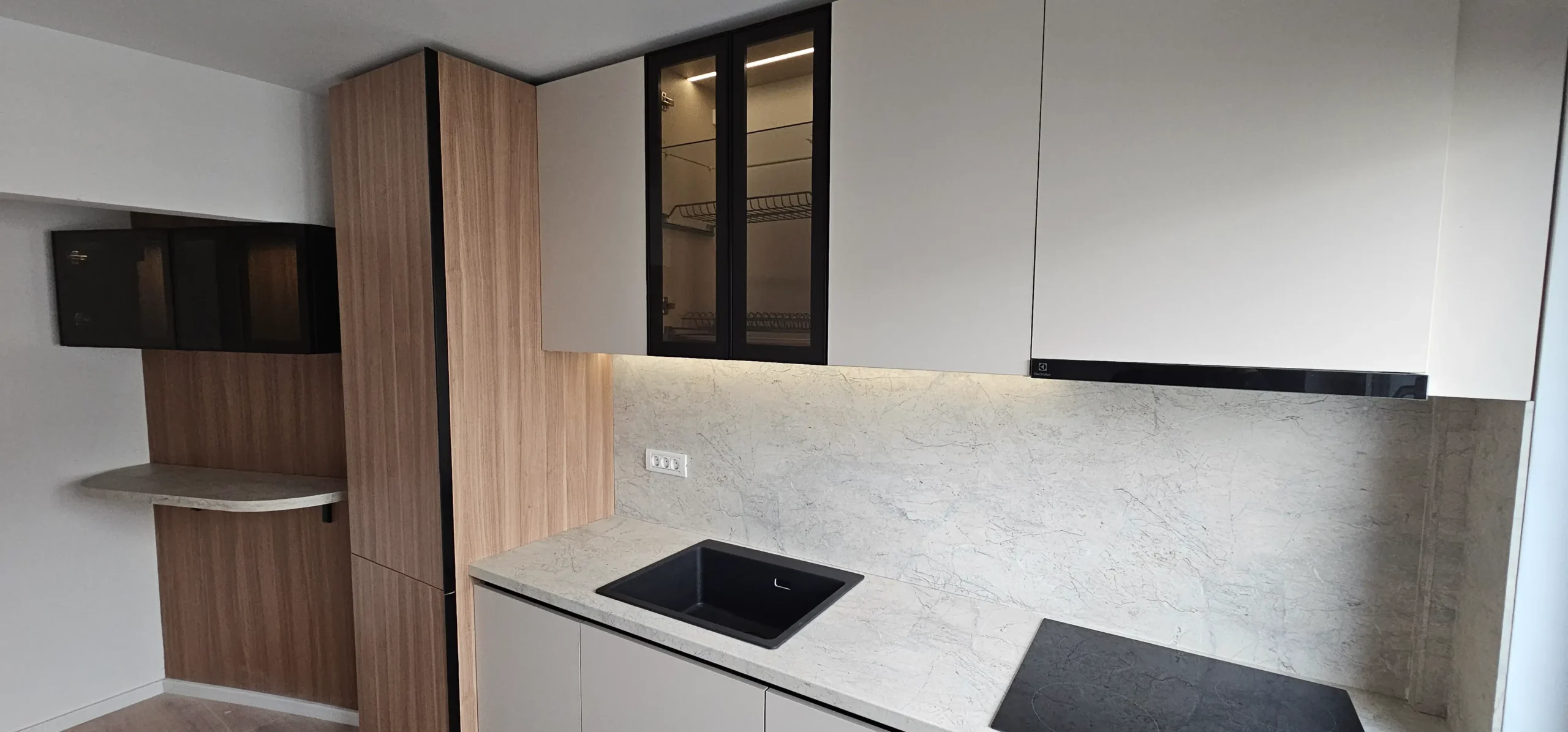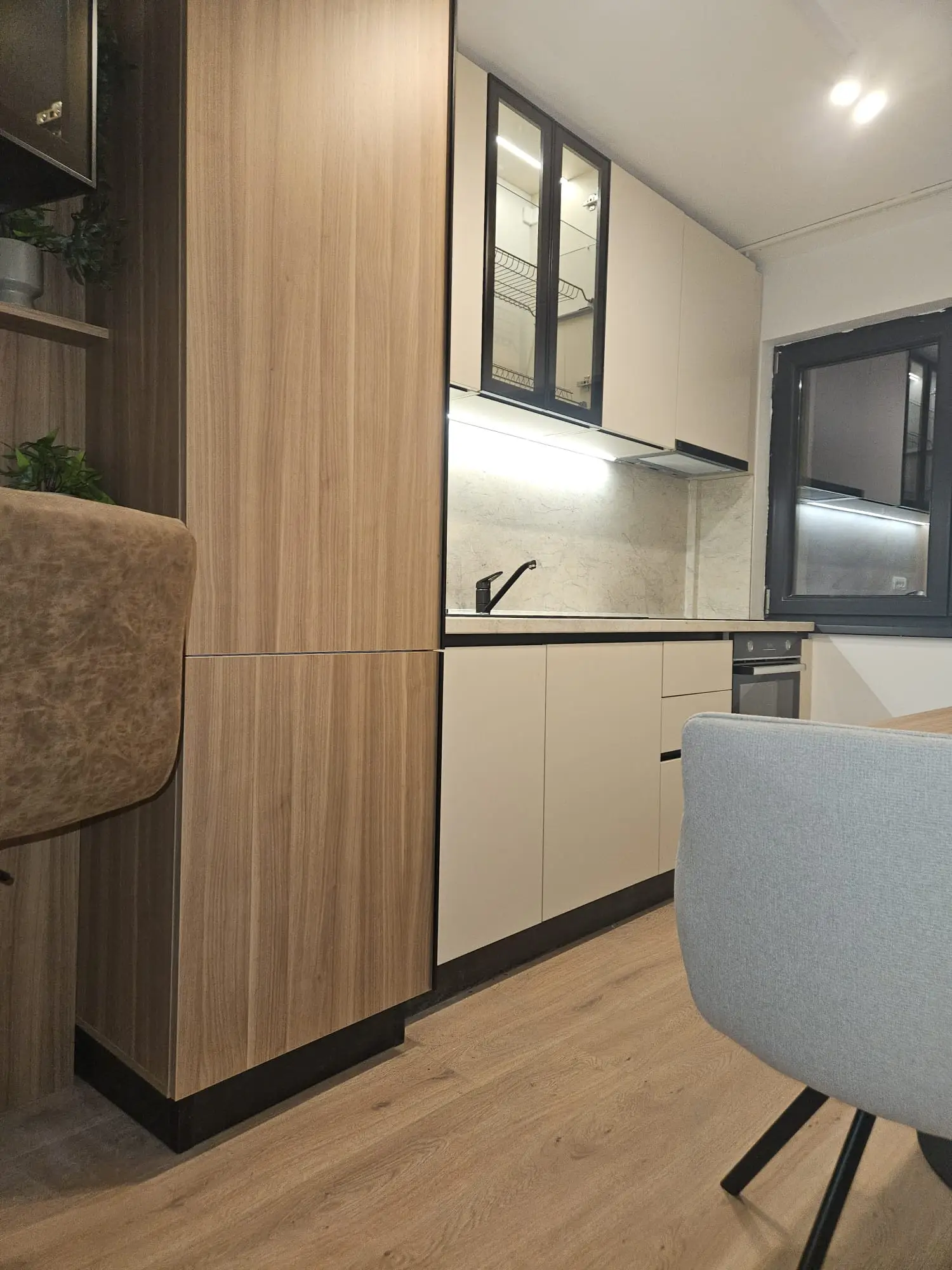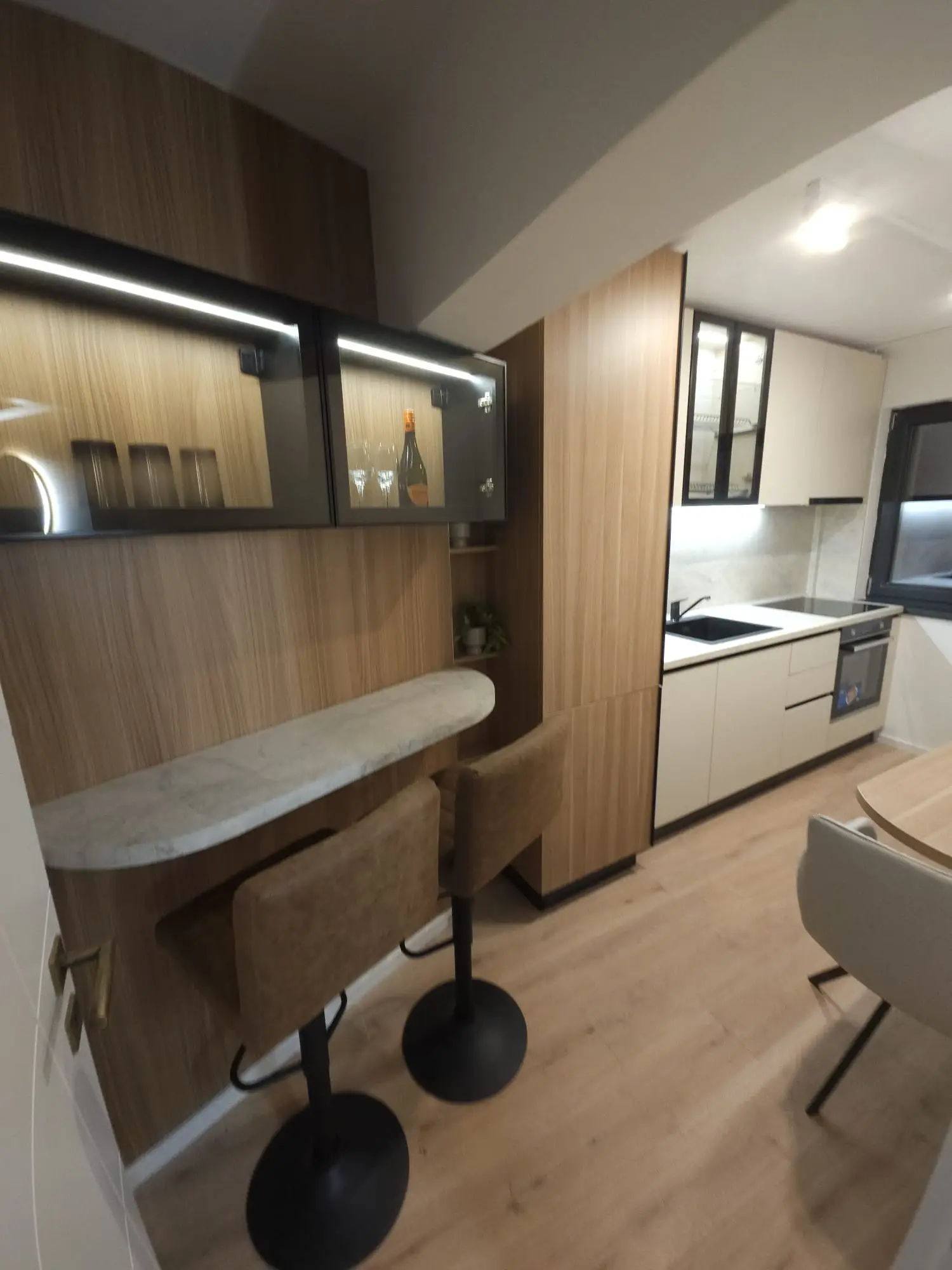 Bucătăria este proiectată într-un stil contemporan și eficient, utilizând mobilier din MDF mat, accente de lemn natural și sticlă fumurie pentru un aspect sofisticat și modern. Zona de bar, cu un blat din piatră naturală, este un spațiu ideal pentru mic-dejunuri rapide sau socializare. Electrocasnicele încorporate, iluminarea LED subtilă și organizarea inteligentă a spațiului contribuie la crearea unei bucătării funcționale și rafinate, adaptate stilului de viață modern.