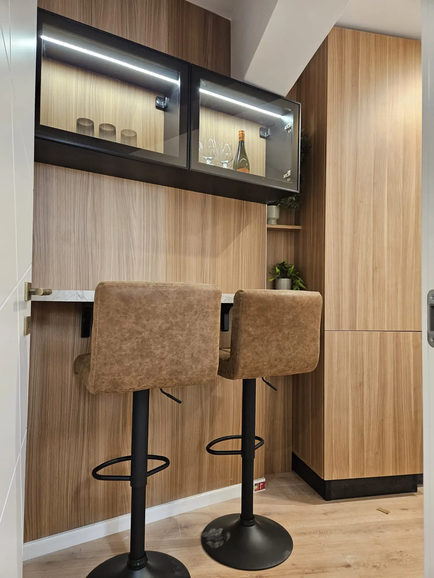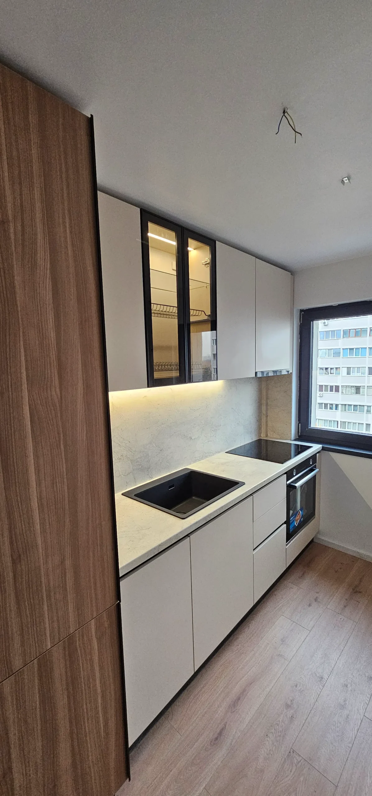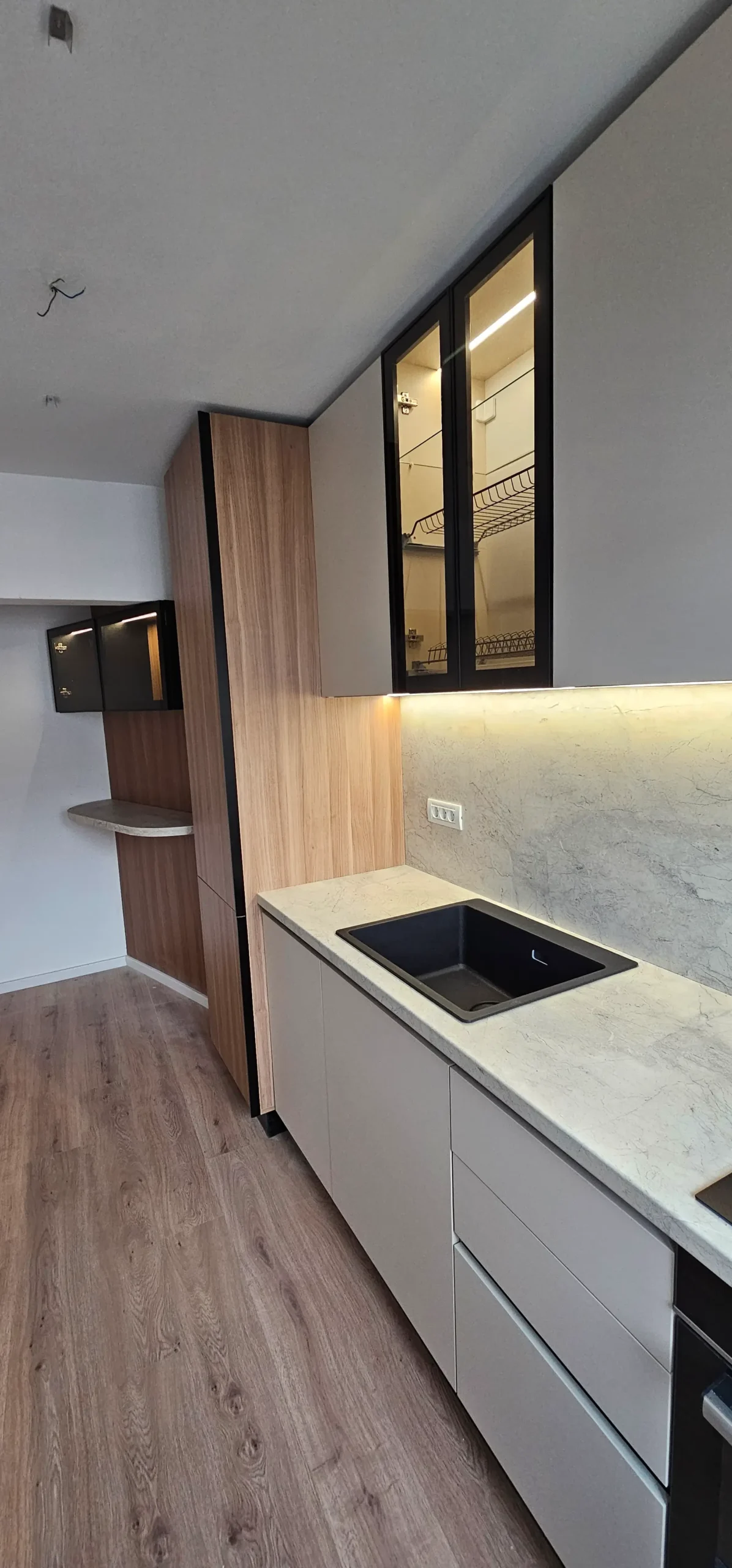 Bucătăria este proiectată într-un stil contemporan și eficient, utilizând mobilier din MDF mat, accente de lemn natural și sticlă fumurie pentru un aspect sofisticat și modern. Zona de bar, cu un blat din piatră naturală, este un spațiu ideal pentru mic-dejunuri rapide sau socializare. Electrocasnicele încorporate, iluminarea LED subtilă și organizarea inteligentă a spațiului contribuie la crearea unei bucătării funcționale și rafinate, adaptate stilului de viață modern.