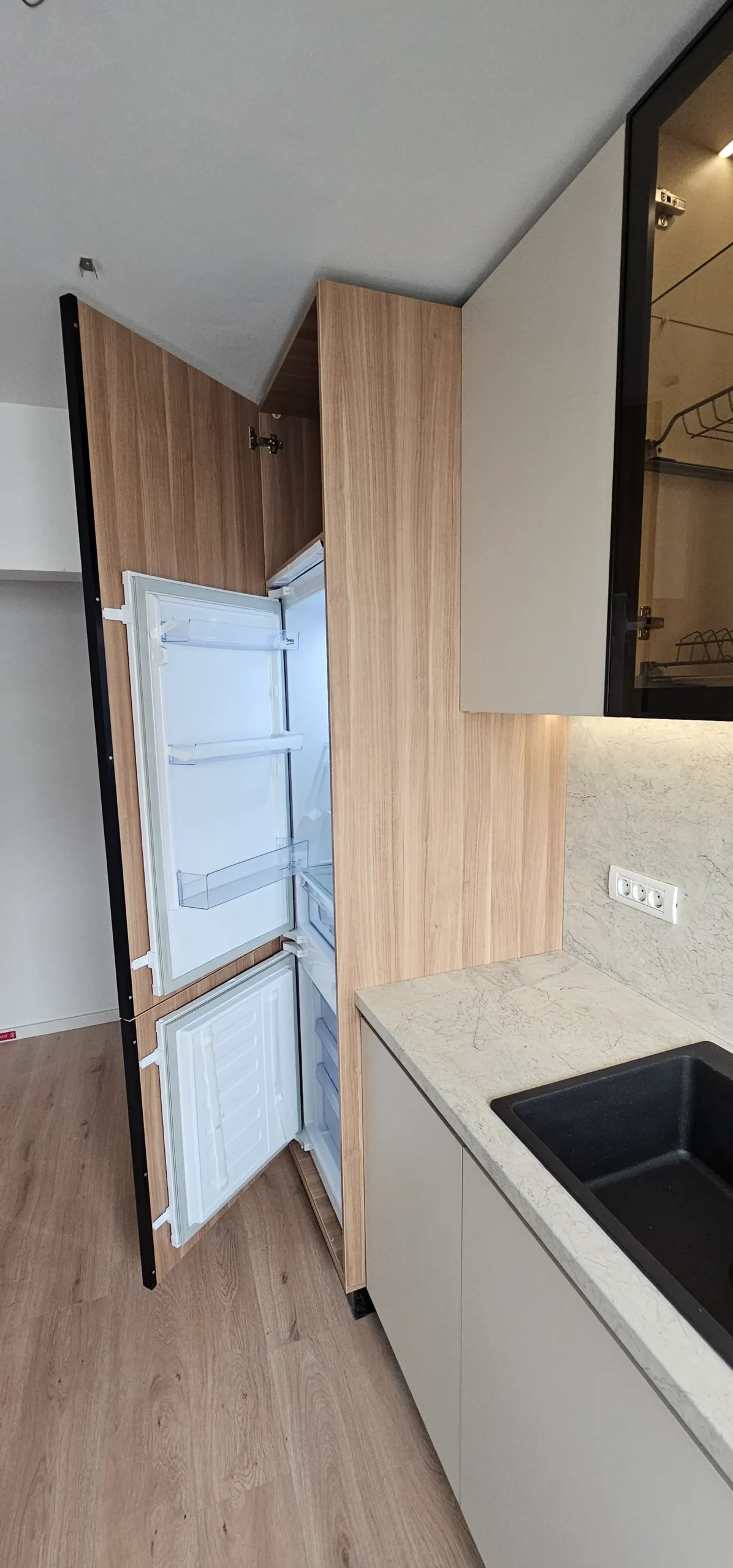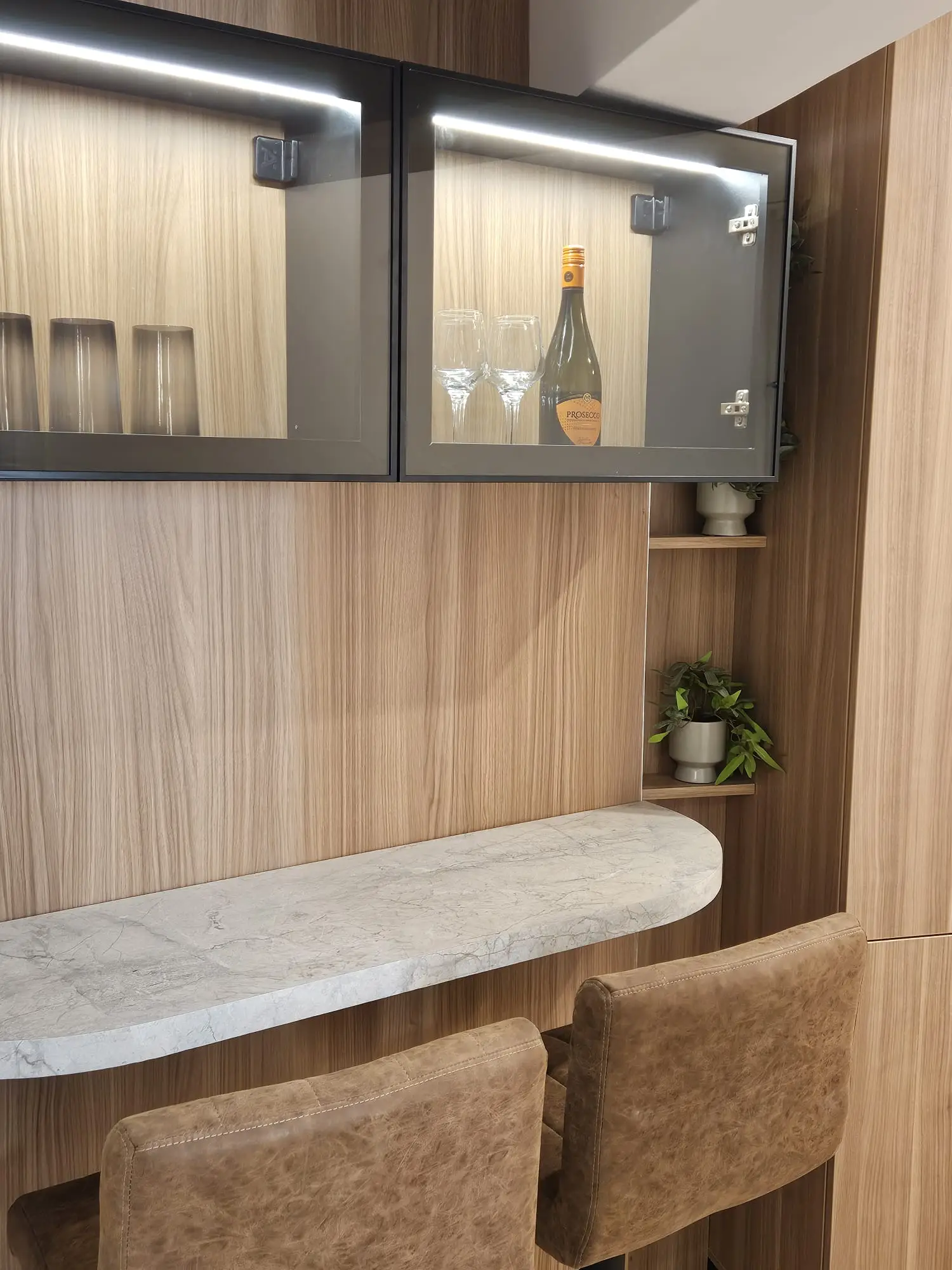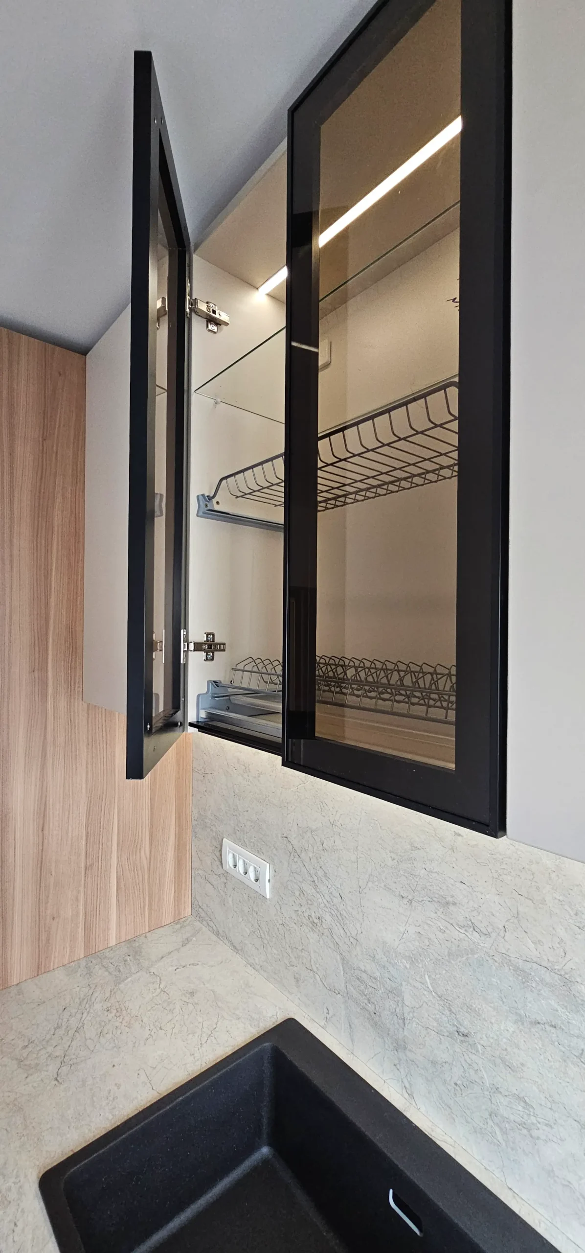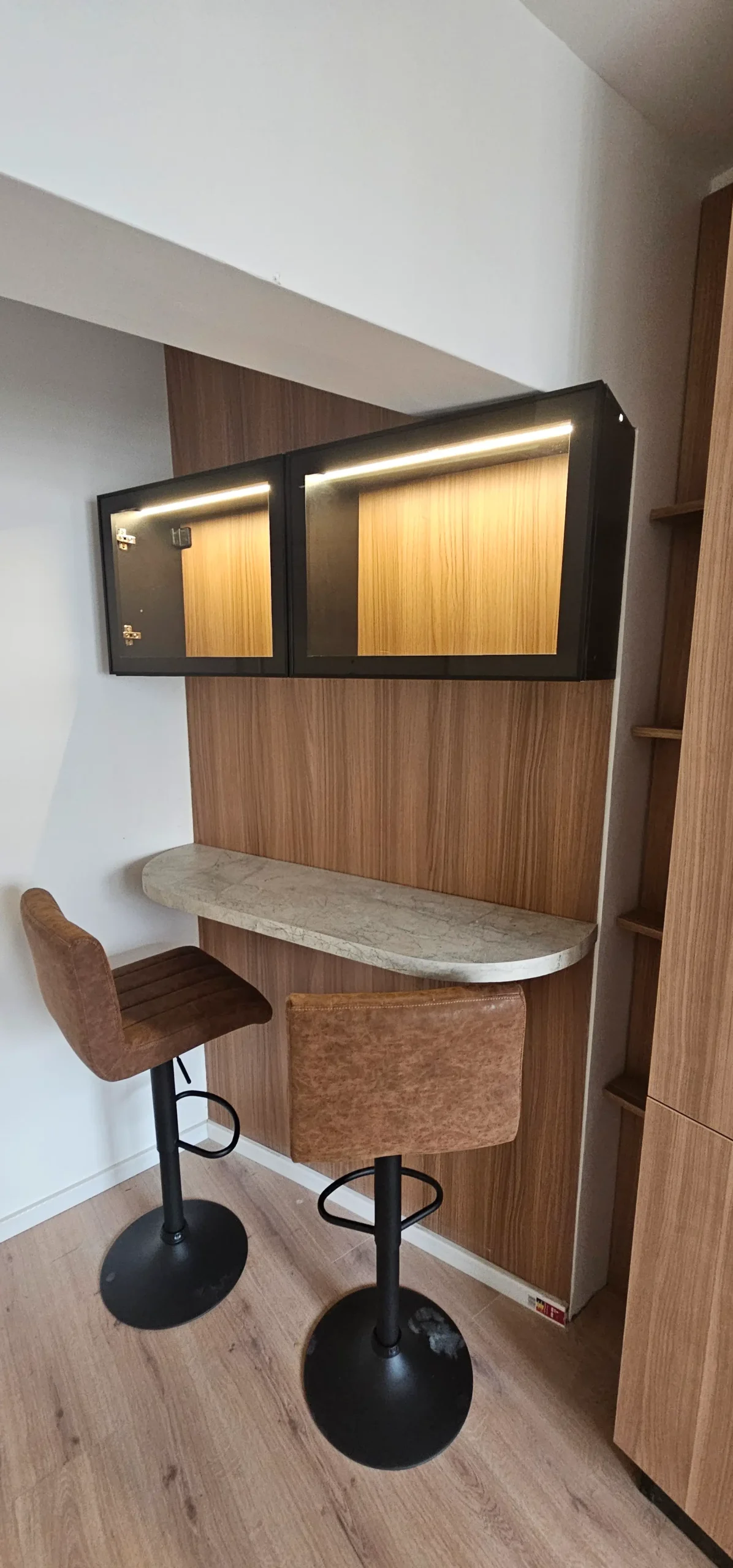Bucătăria este proiectată într-un stil contemporan și eficient, utilizând mobilier din MDF mat, accente de lemn natural și sticlă fumurie pentru un aspect sofisticat și modern. Zona de bar, cu un blat din piatră naturală, este un spațiu ideal pentru mic-dejunuri rapide sau socializare. Electrocasnicele încorporate, iluminarea LED subtilă și organizarea inteligentă a spațiului contribuie la crearea unei bucătării funcționale și rafinate, adaptate stilului de viață modern.