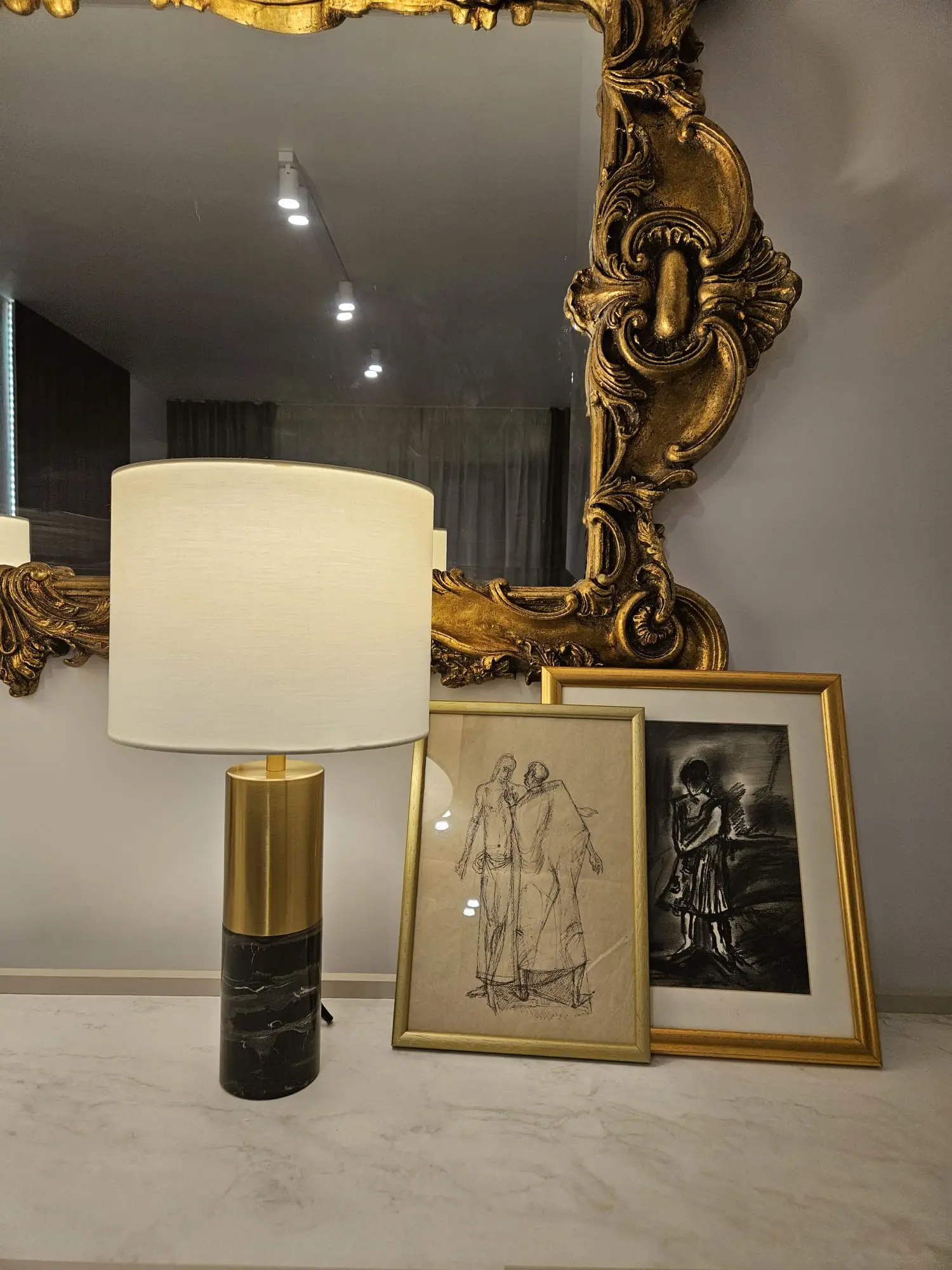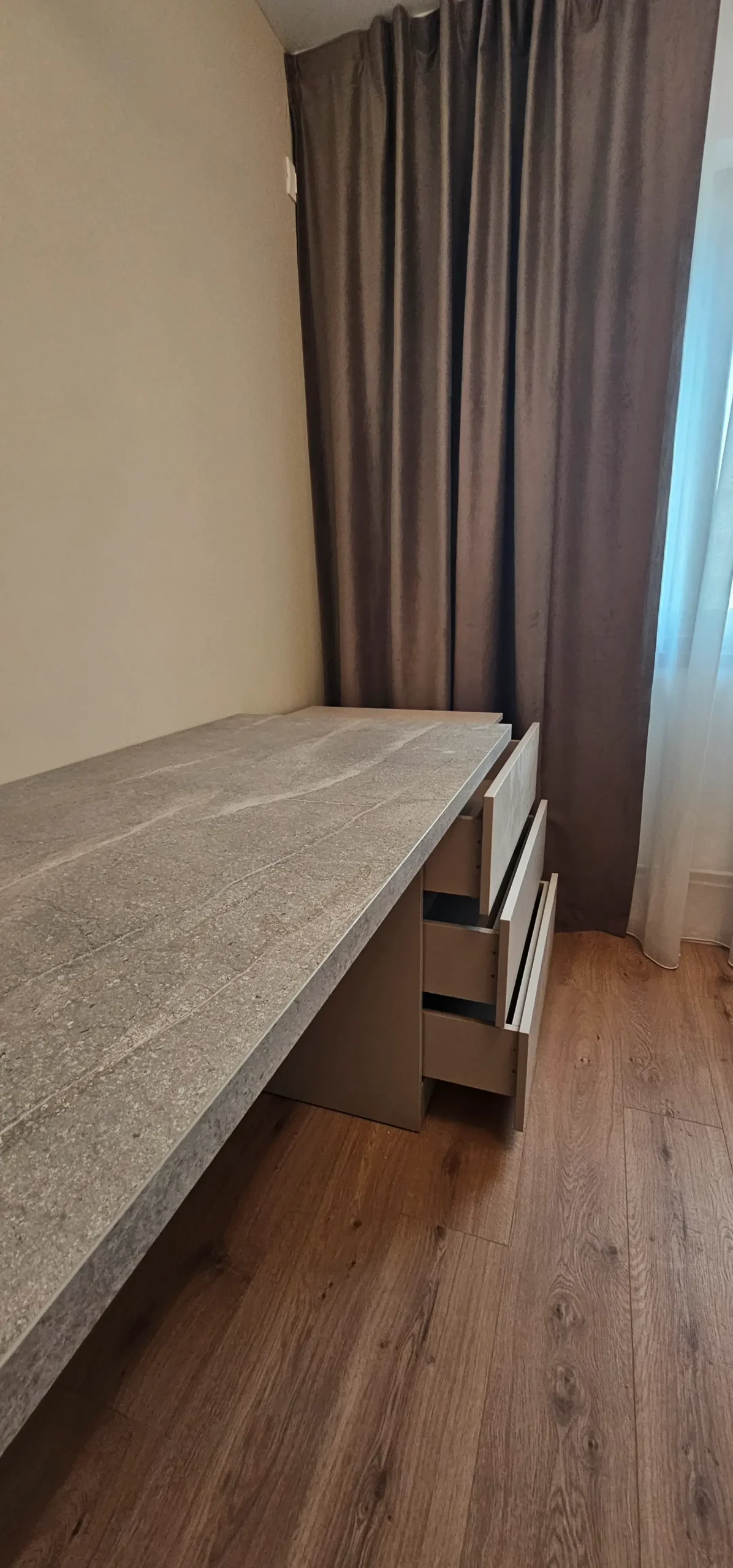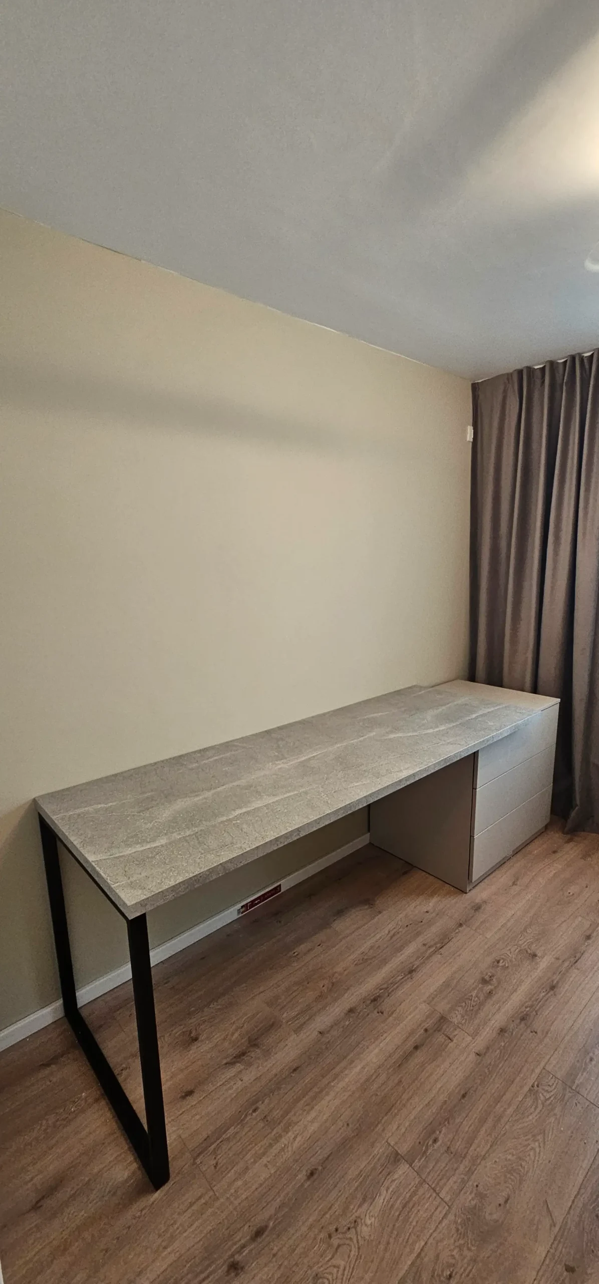 Această cameră este ideală pentru munca de acasă sau pentru studiu, fiind amenajată simplu și elegant. Biroul lung, cu blat din piatră naturală și picioare metalice negre, oferă o suprafață generoasă de lucru, adaptată nevoilor profesionale. Sertarele integrate asigură depozitarea organizată a documentelor și accesoriilor de birou. Draperiile lungi în nuanțe neutre creează un ambient relaxant și productiv, oferind în același timp intimitate și confort vizual.