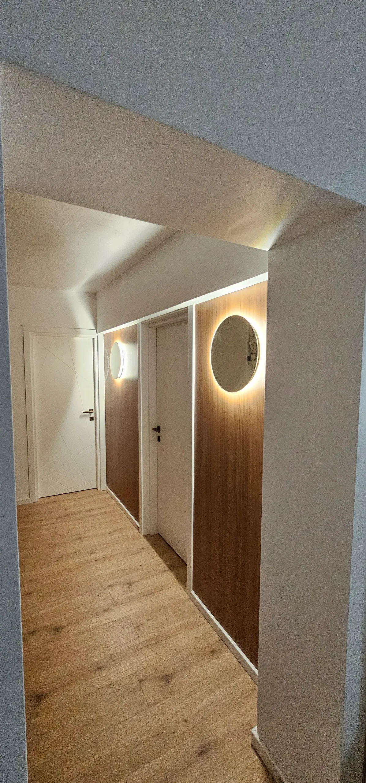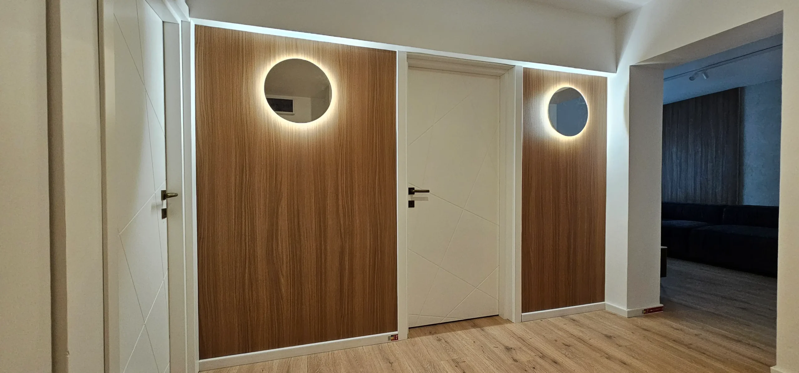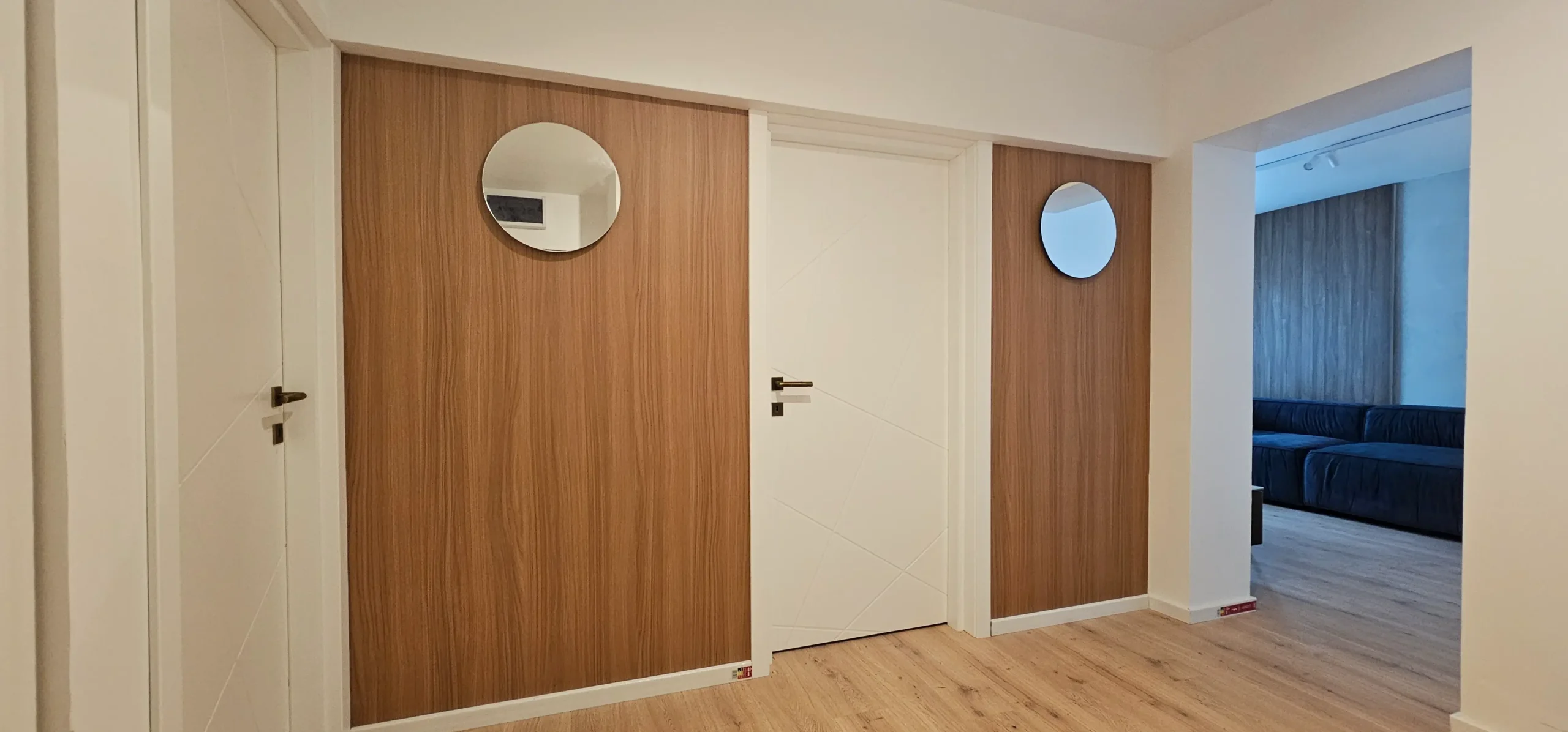 Holul apartamentului este primitor și bine iluminat, având un design contemporan ce combină panouri decorative din lemn natural cu oglinzi iluminate LED, amplificând senzația de spațiu și adăugând un efect vizual sofisticat. Dressingul generos este perfect integrat, oferind un spațiu de depozitare organizat și accesibil pentru haine și accesorii. Pardoseala din lemn în tonuri calde creează continuitate vizuală între spații, iar ușile albe cu detalii geometrice subtile contribuie la estetica modernă și minimalistă a locuinței.