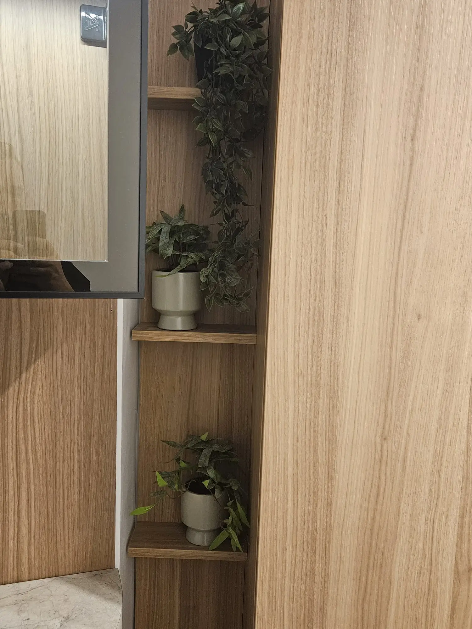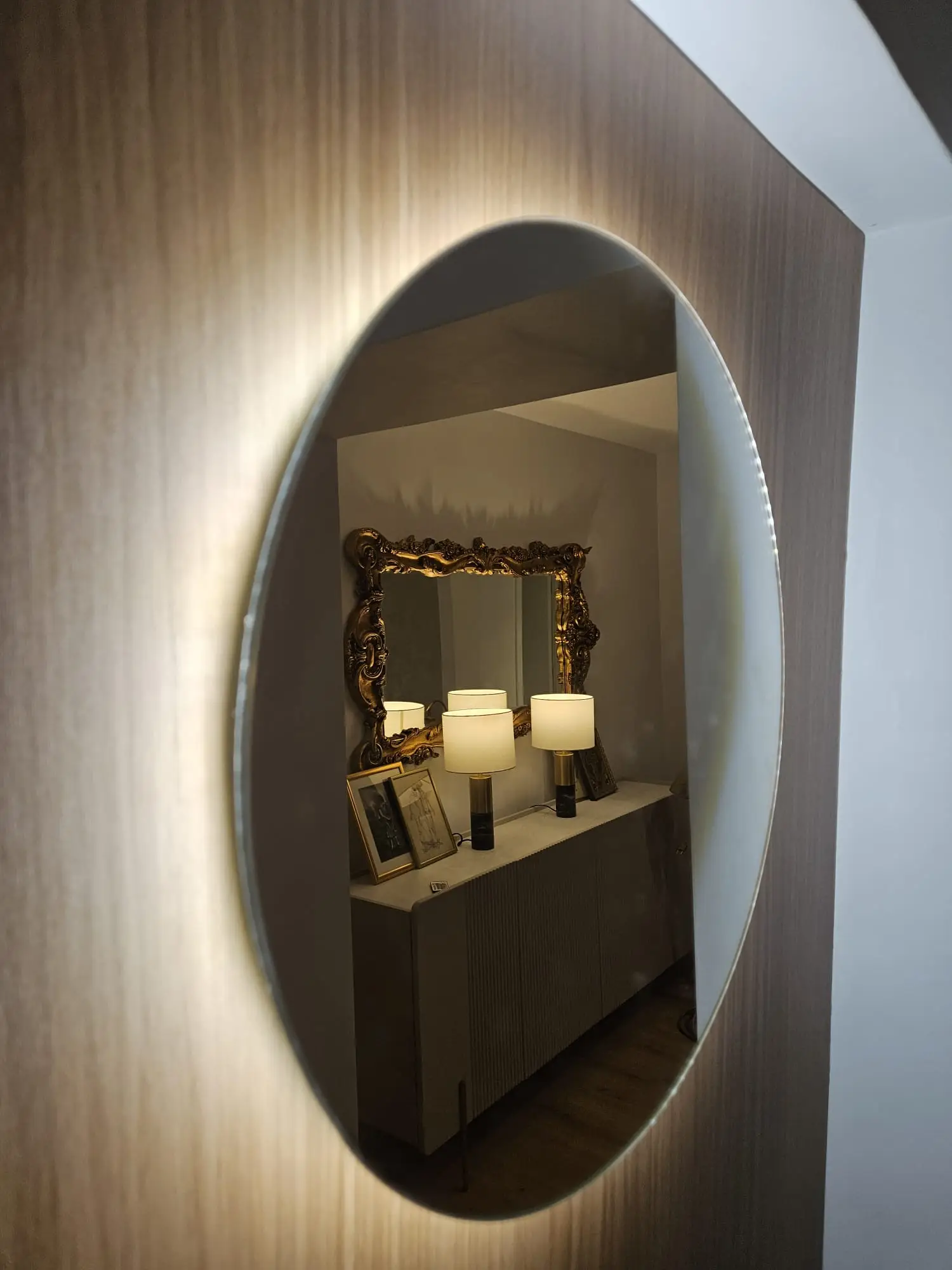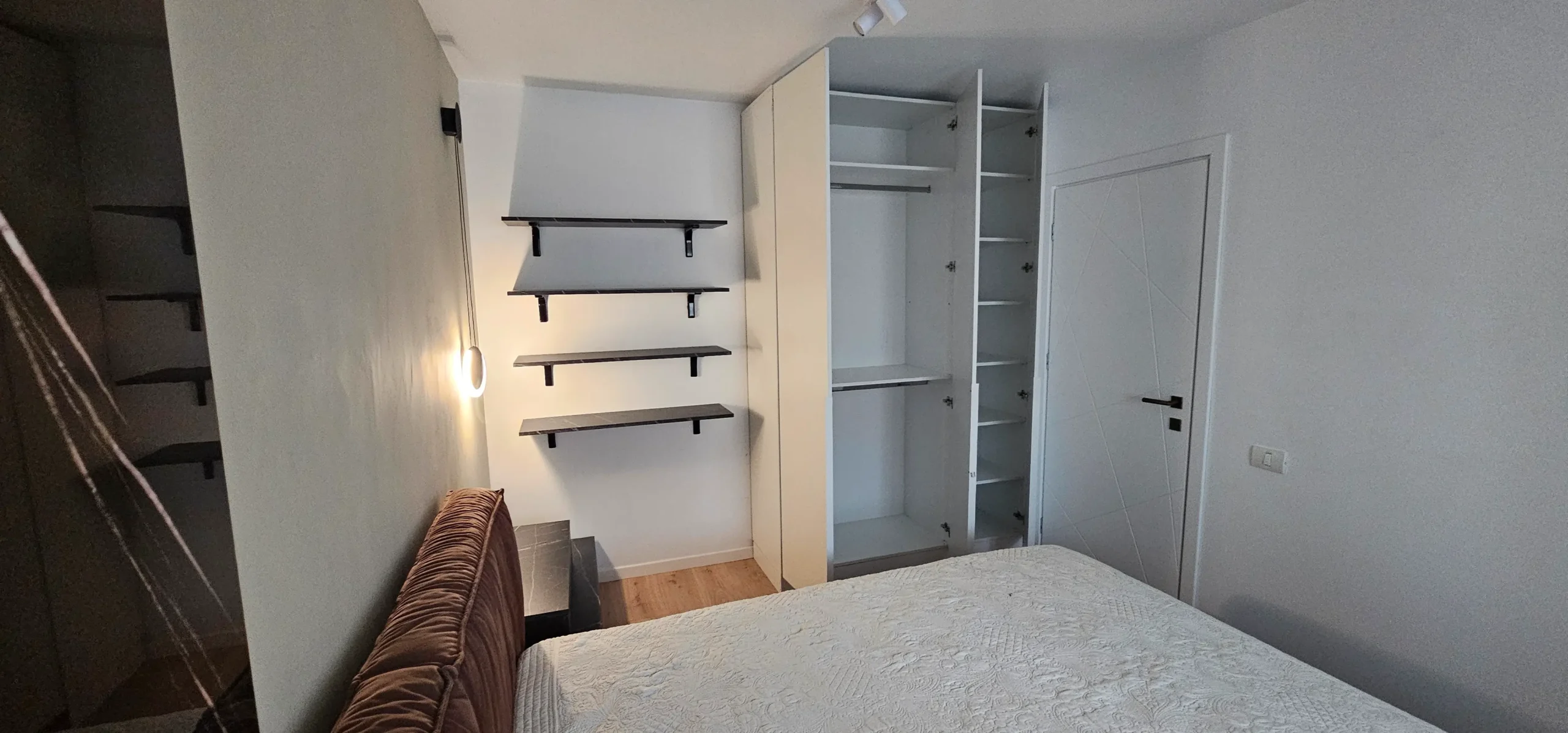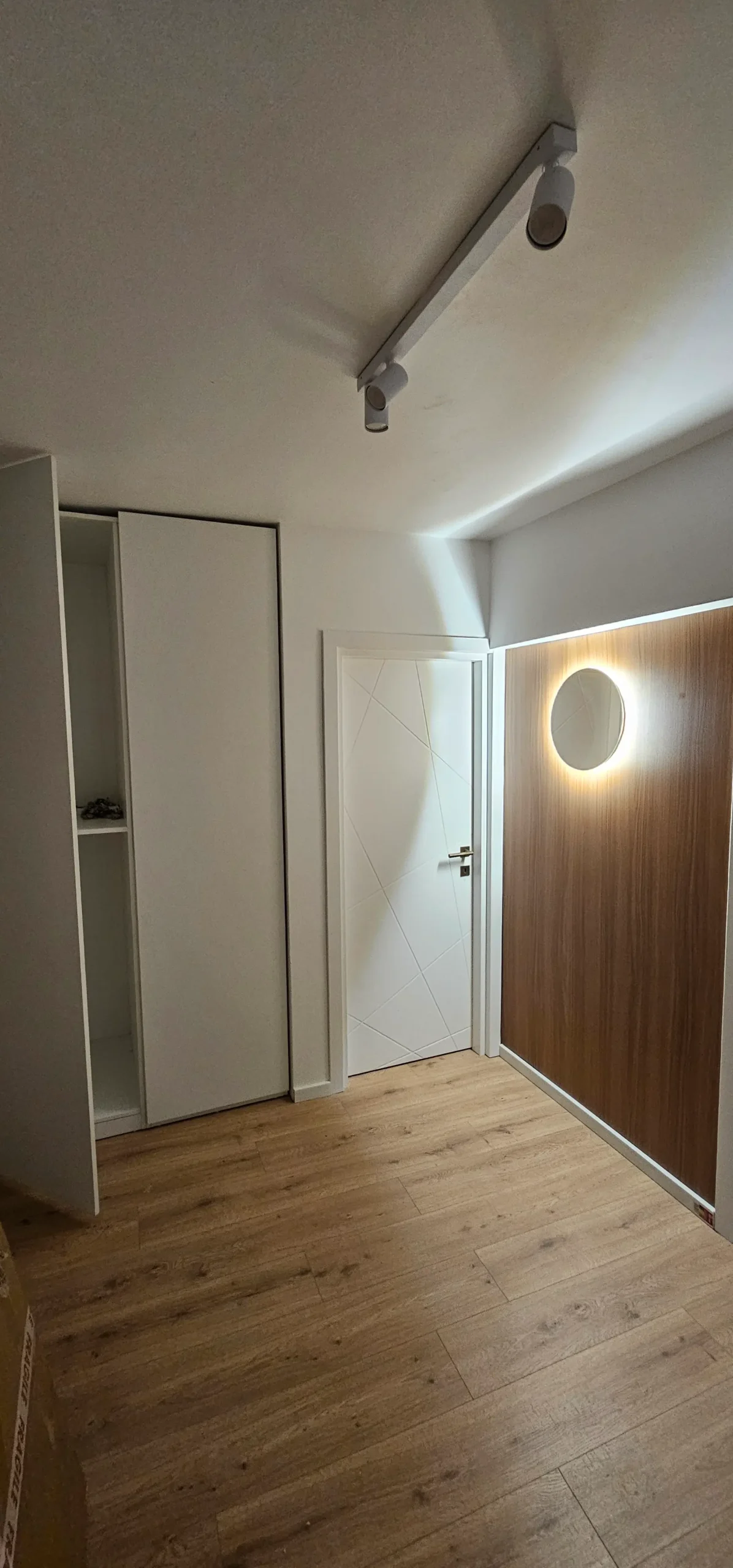 Holul apartamentului este primitor și bine iluminat, având un design contemporan ce combină panouri decorative din lemn natural cu oglinzi iluminate LED, amplificând senzația de spațiu și adăugând un efect vizual sofisticat. Dressingul generos este perfect integrat, oferind un spațiu de depozitare organizat și accesibil pentru haine și accesorii. Pardoseala din lemn în tonuri calde creează continuitate vizuală între spații, iar ușile albe cu detalii geometrice subtile contribuie la estetica modernă și minimalistă a locuinței.