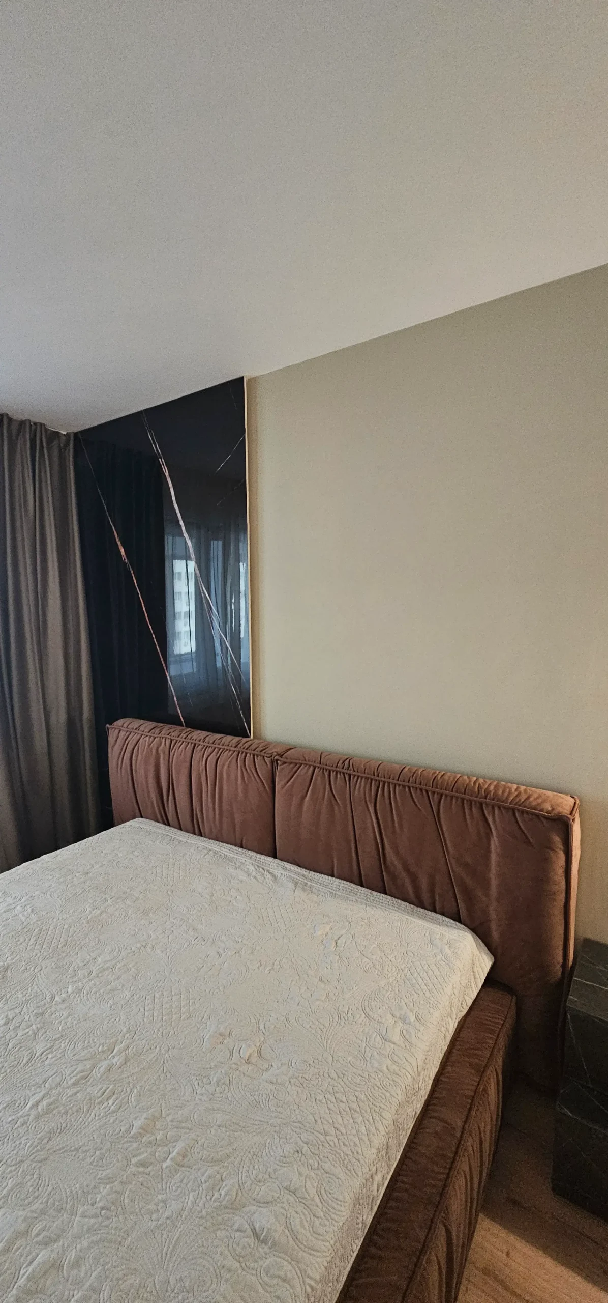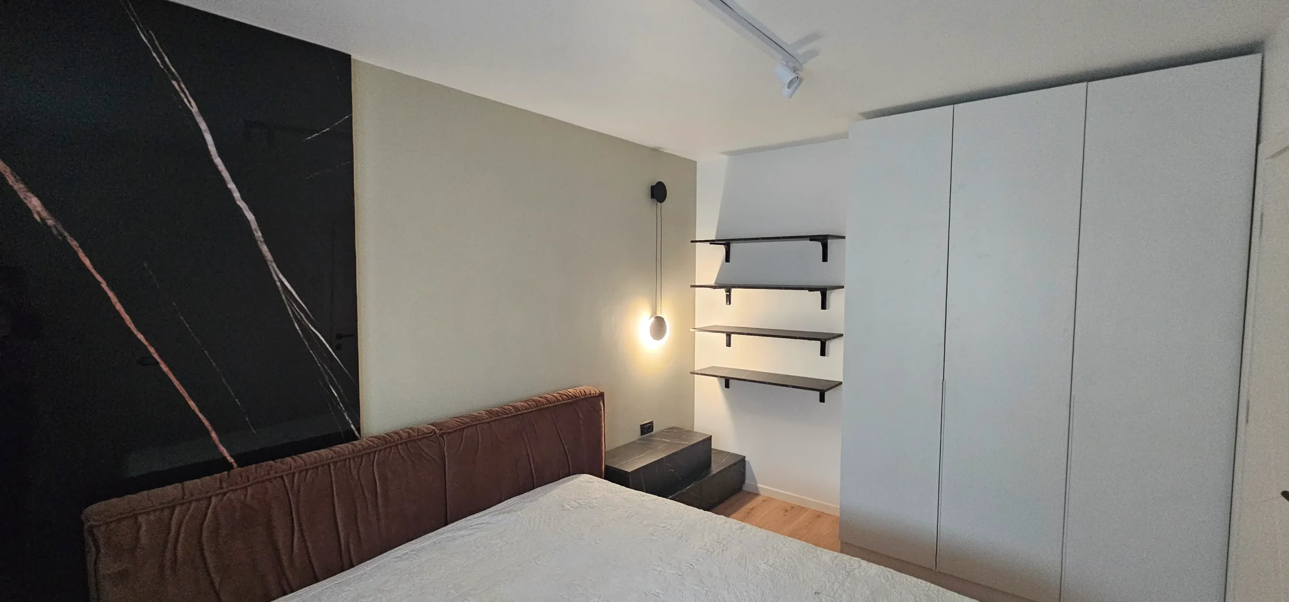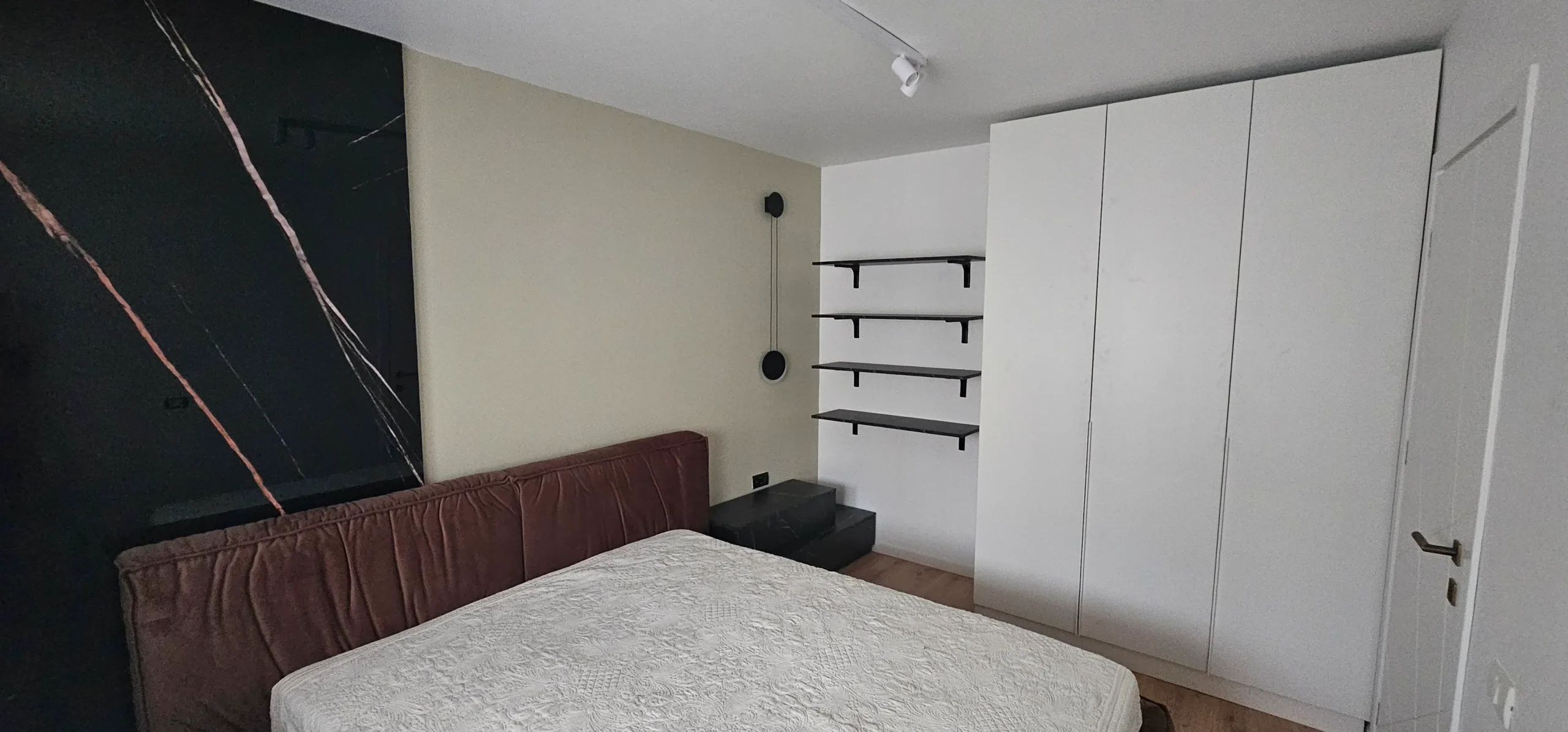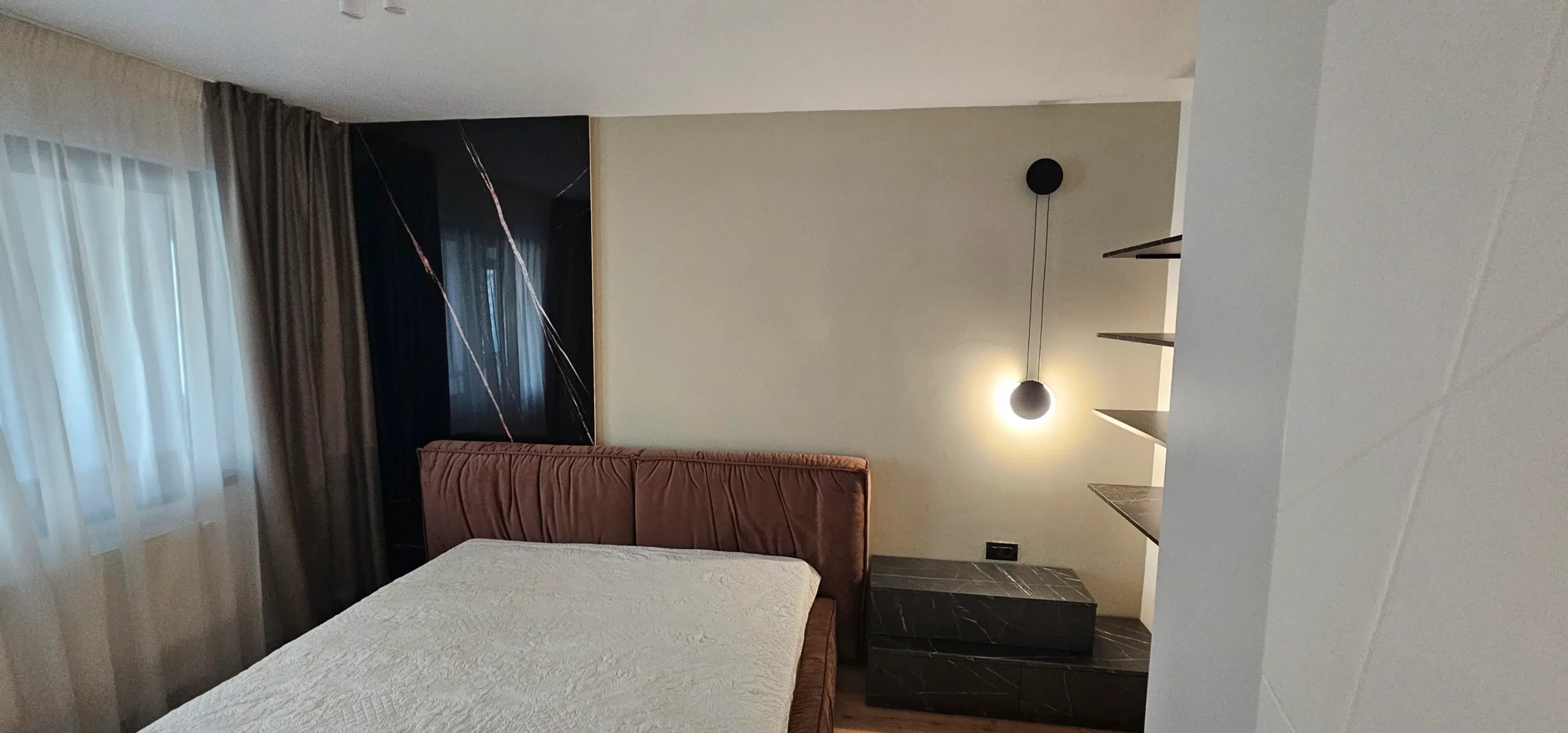 Dormitorul este amenajat pentru relaxare maximă, având un perete accent din marmură neagră cu vinișoare aurii, care adaugă un efect sofisticat și luxos. Patul tapițat în catifea maro, în combinație cu iluminatul ambiental discret, creează o atmosferă intimă și odihnitoare. Dulapul alb, încăpător și cu un design minimalist, oferă suficient spațiu de depozitare, iar rafturile suspendate negre completează armonios decorul, oferind funcționalitate și stil.