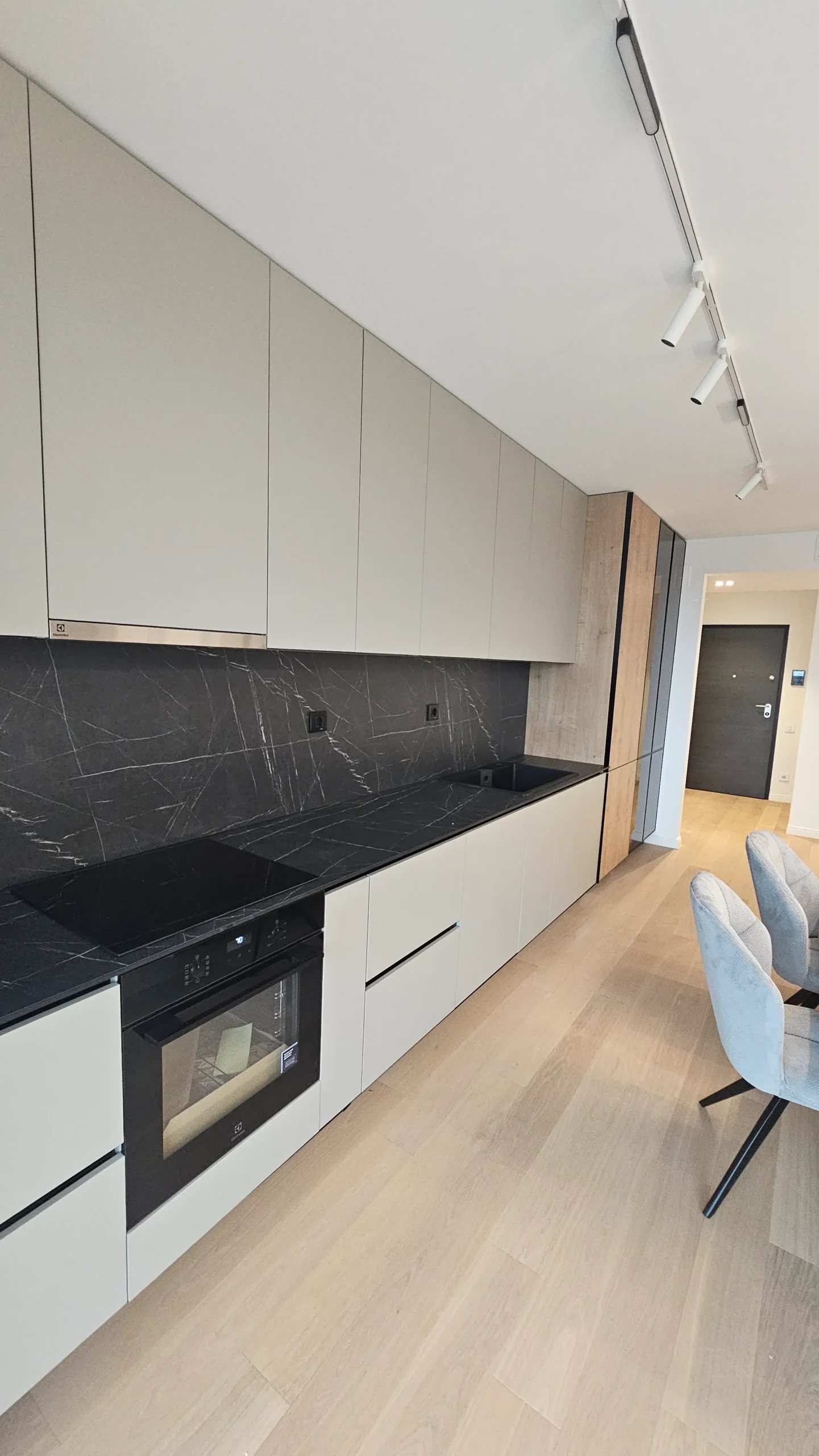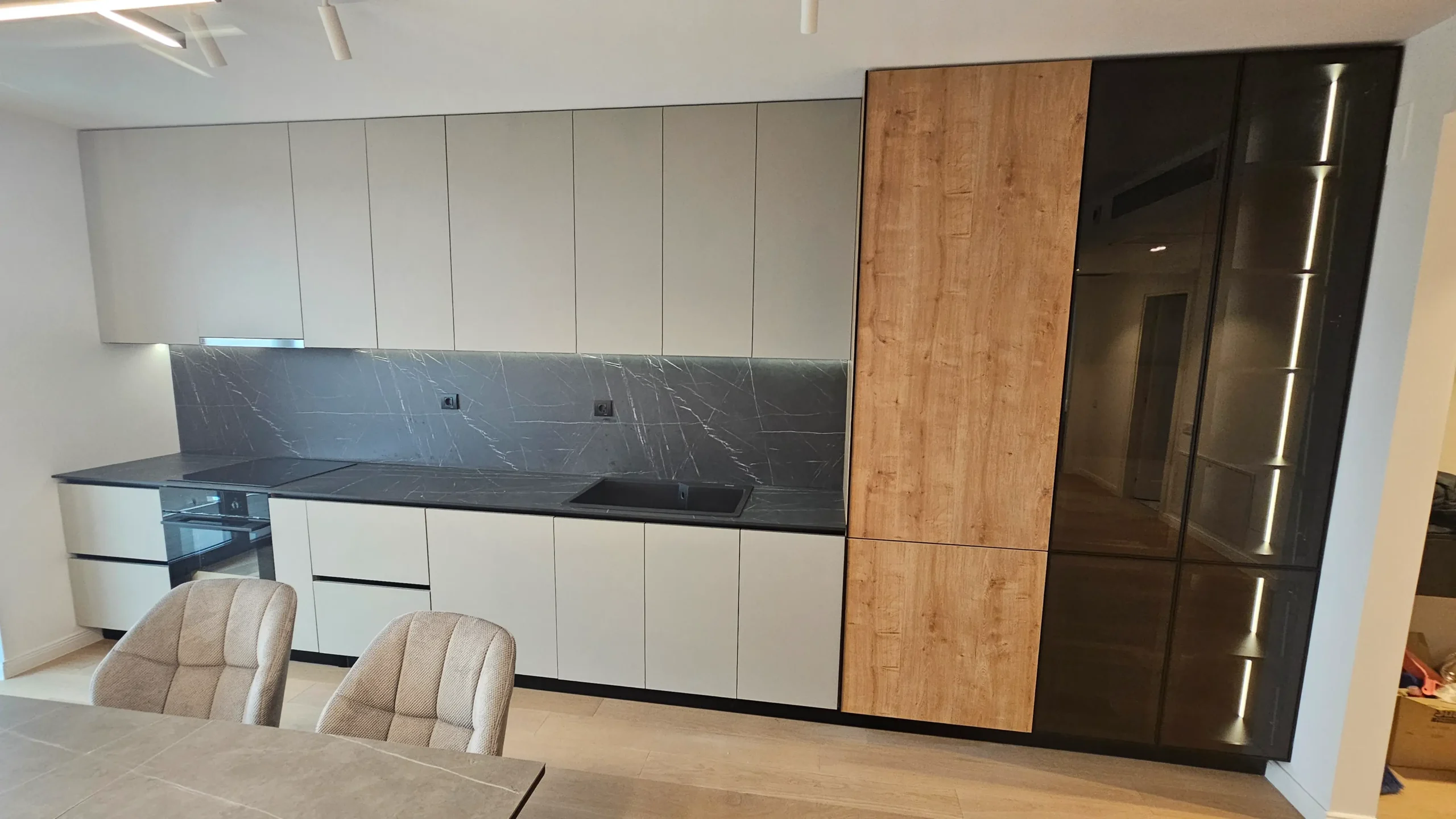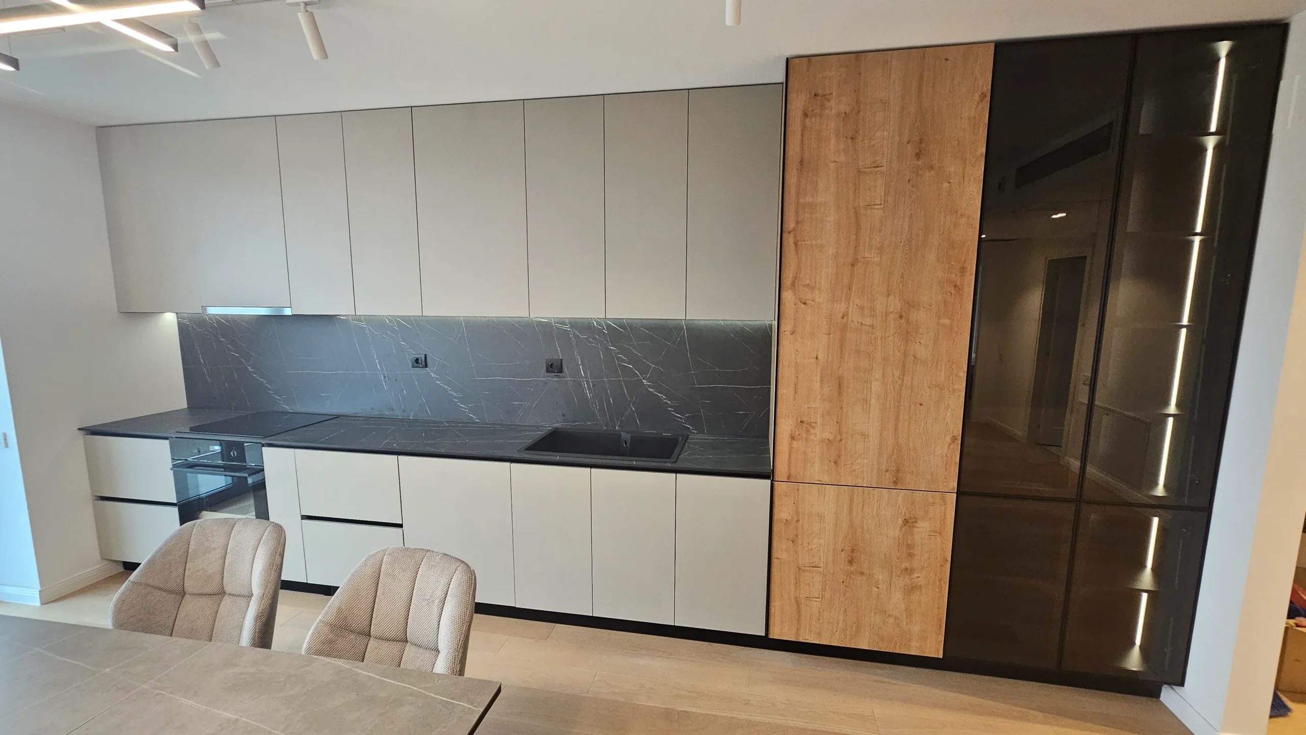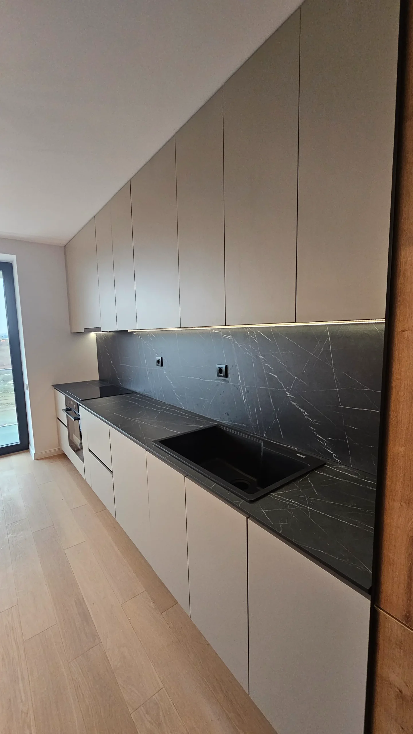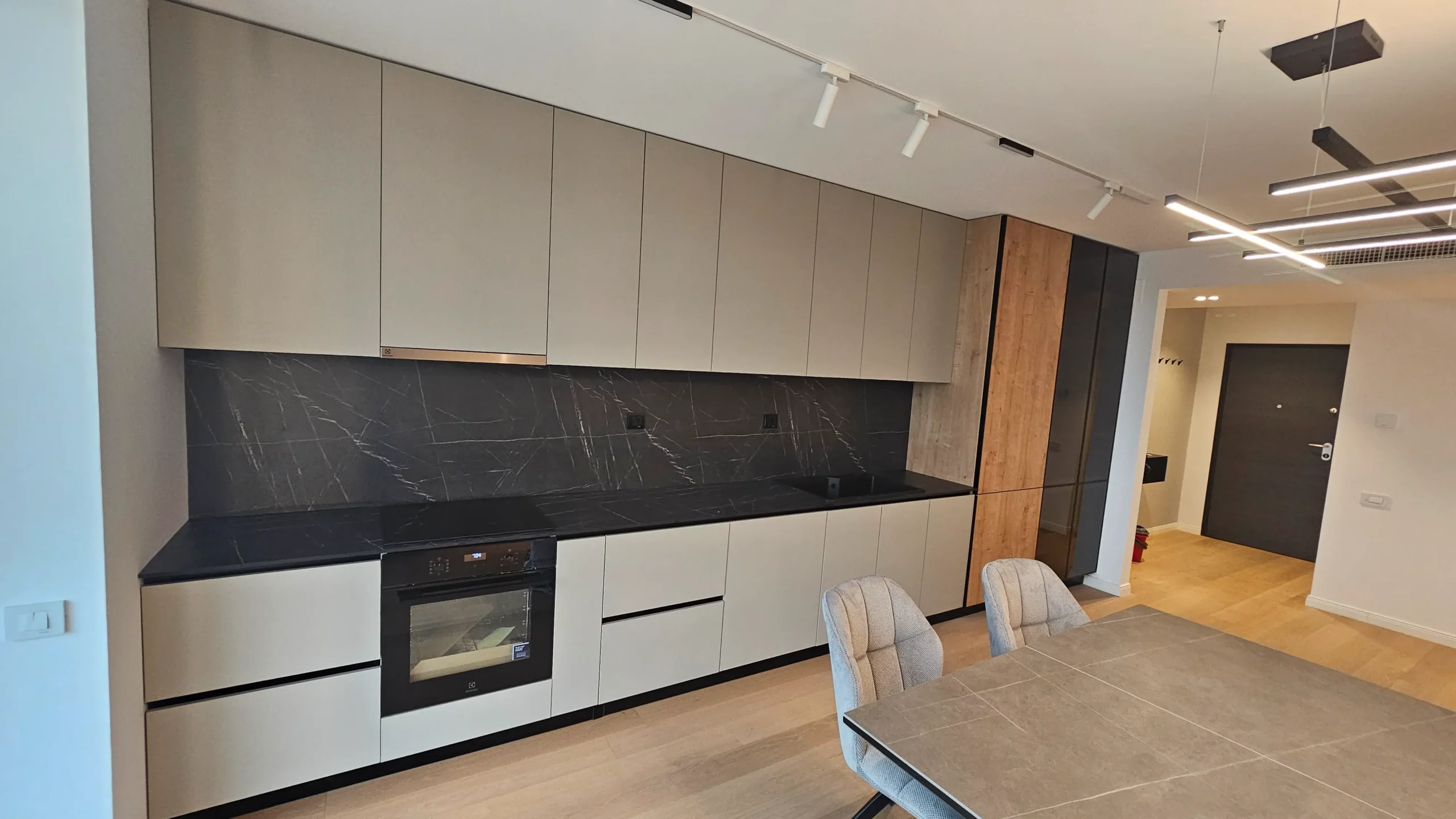 Mobilier de bucătărie pe toată lungimea peretelui, cu fronturi mate în nuanțe de bej și negru.