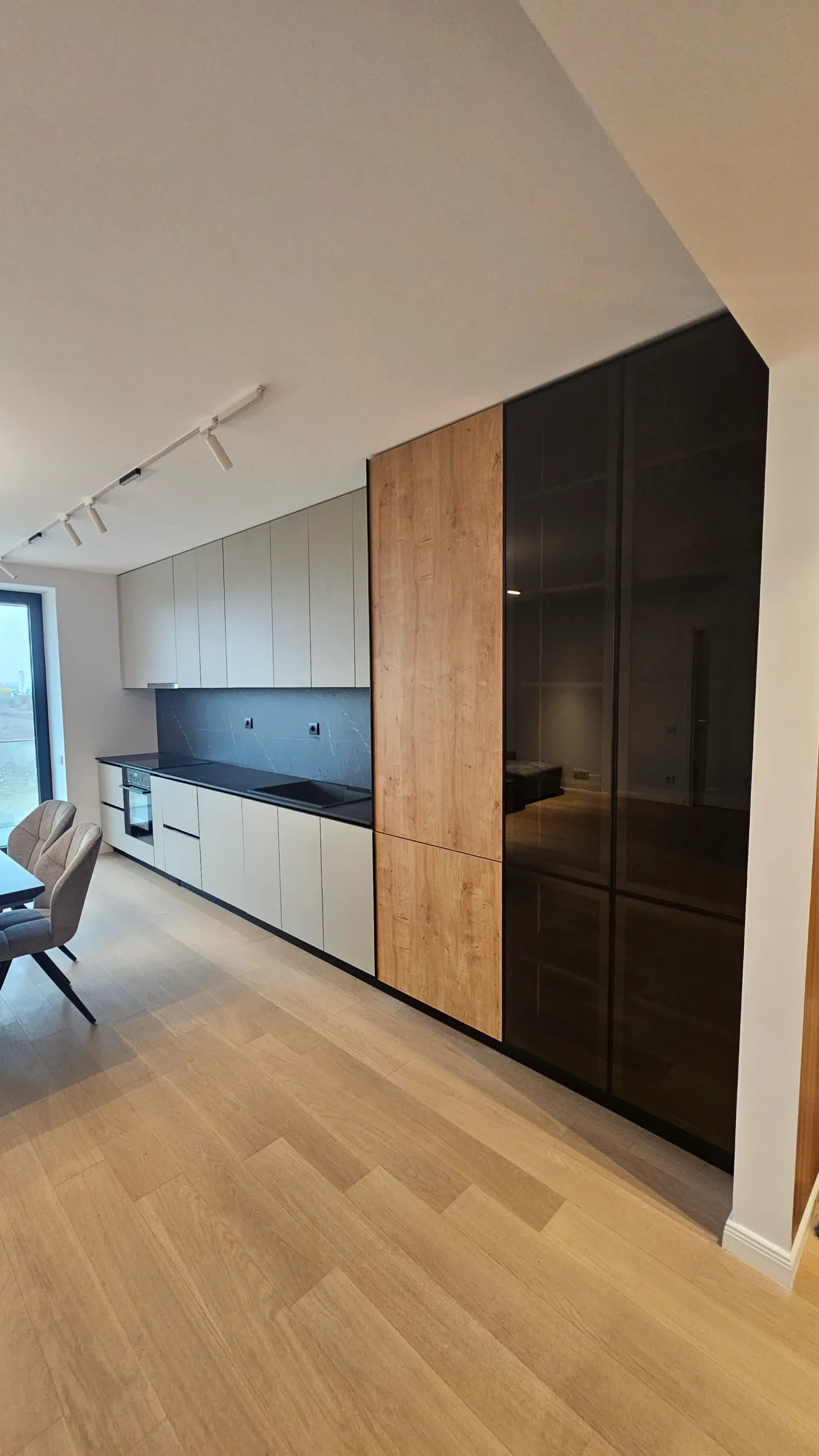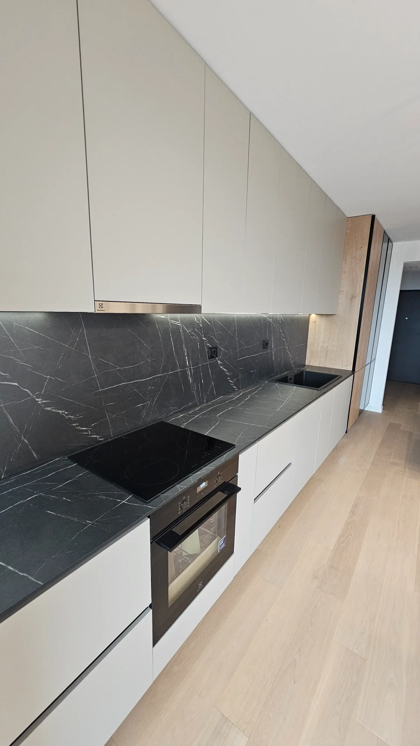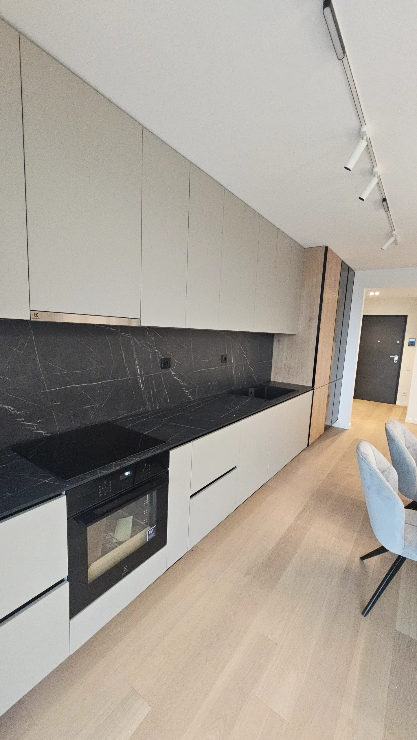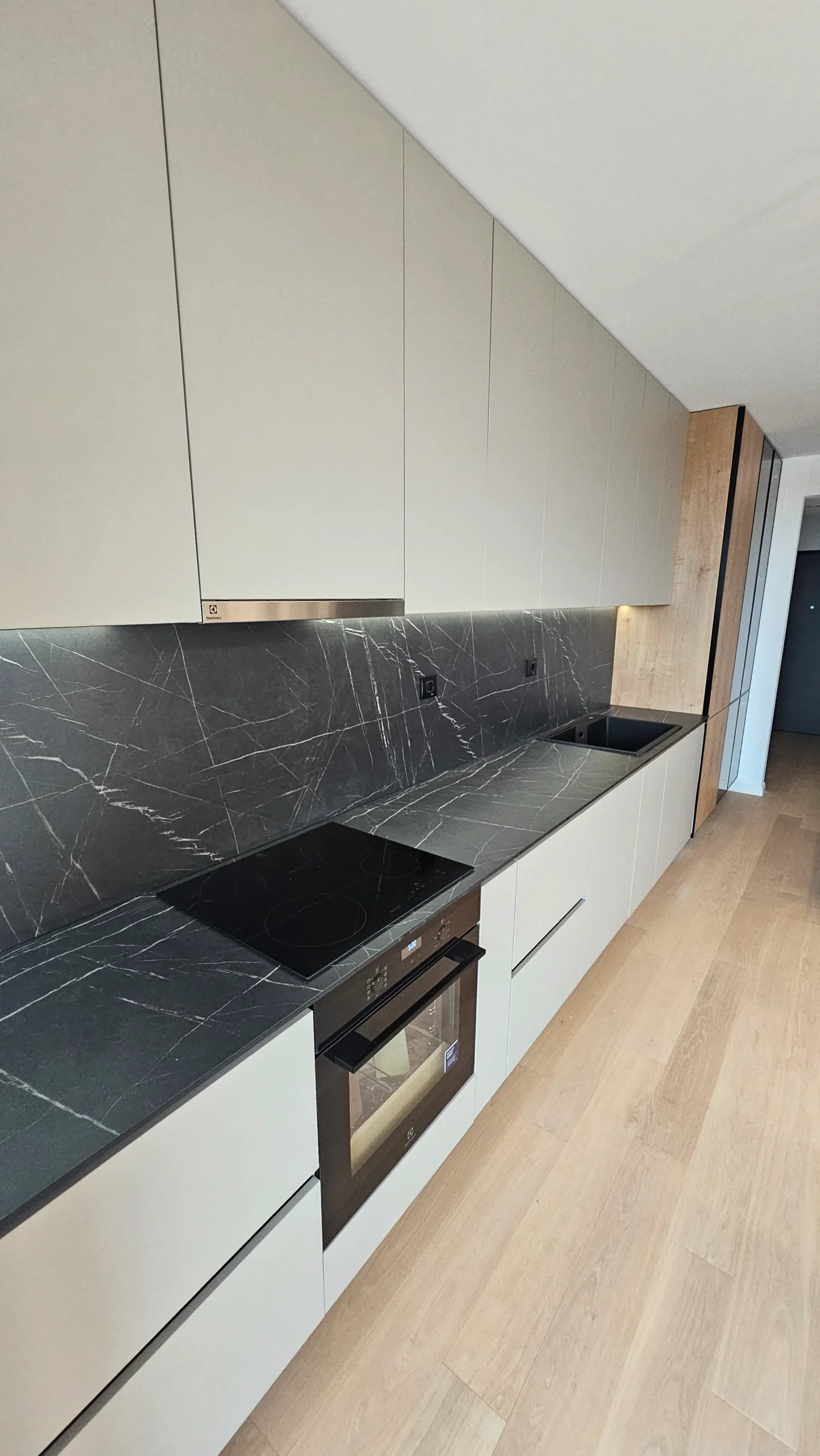 Mobilier de bucătărie pe toată lungimea peretelui, cu fronturi mate în nuanțe de bej și negru.