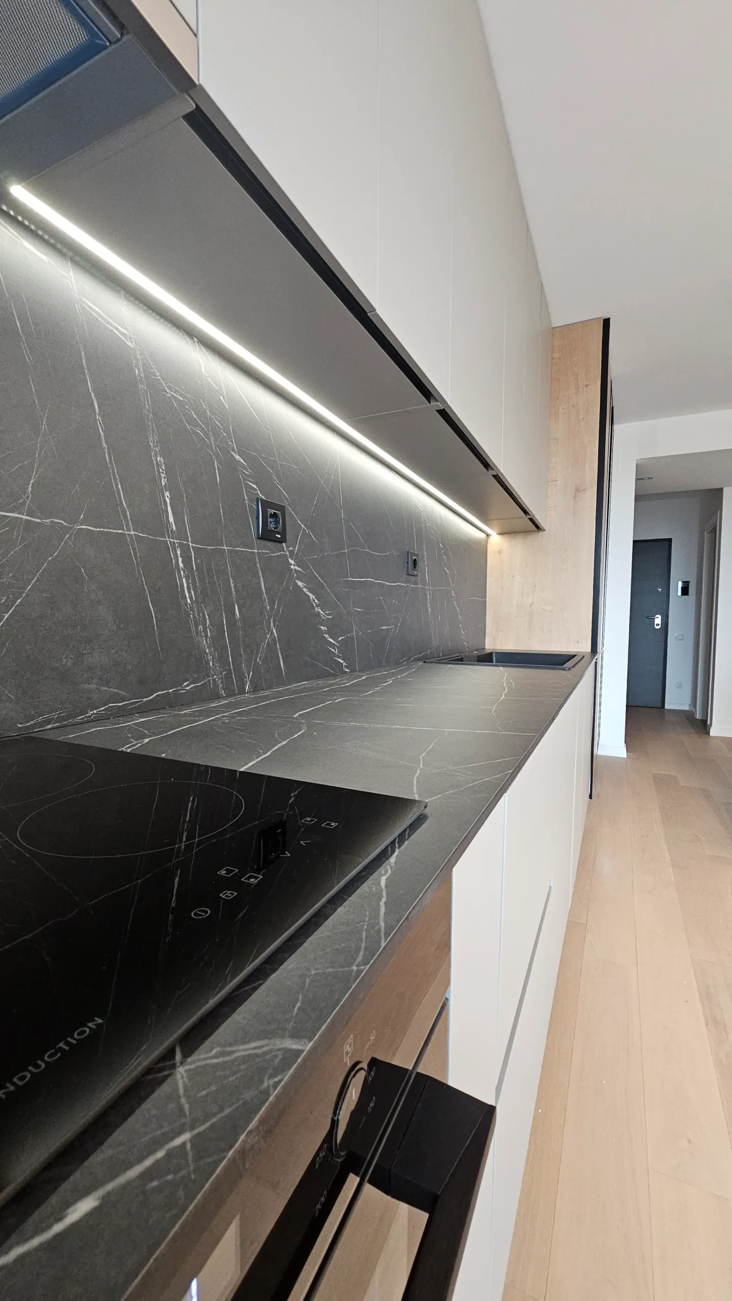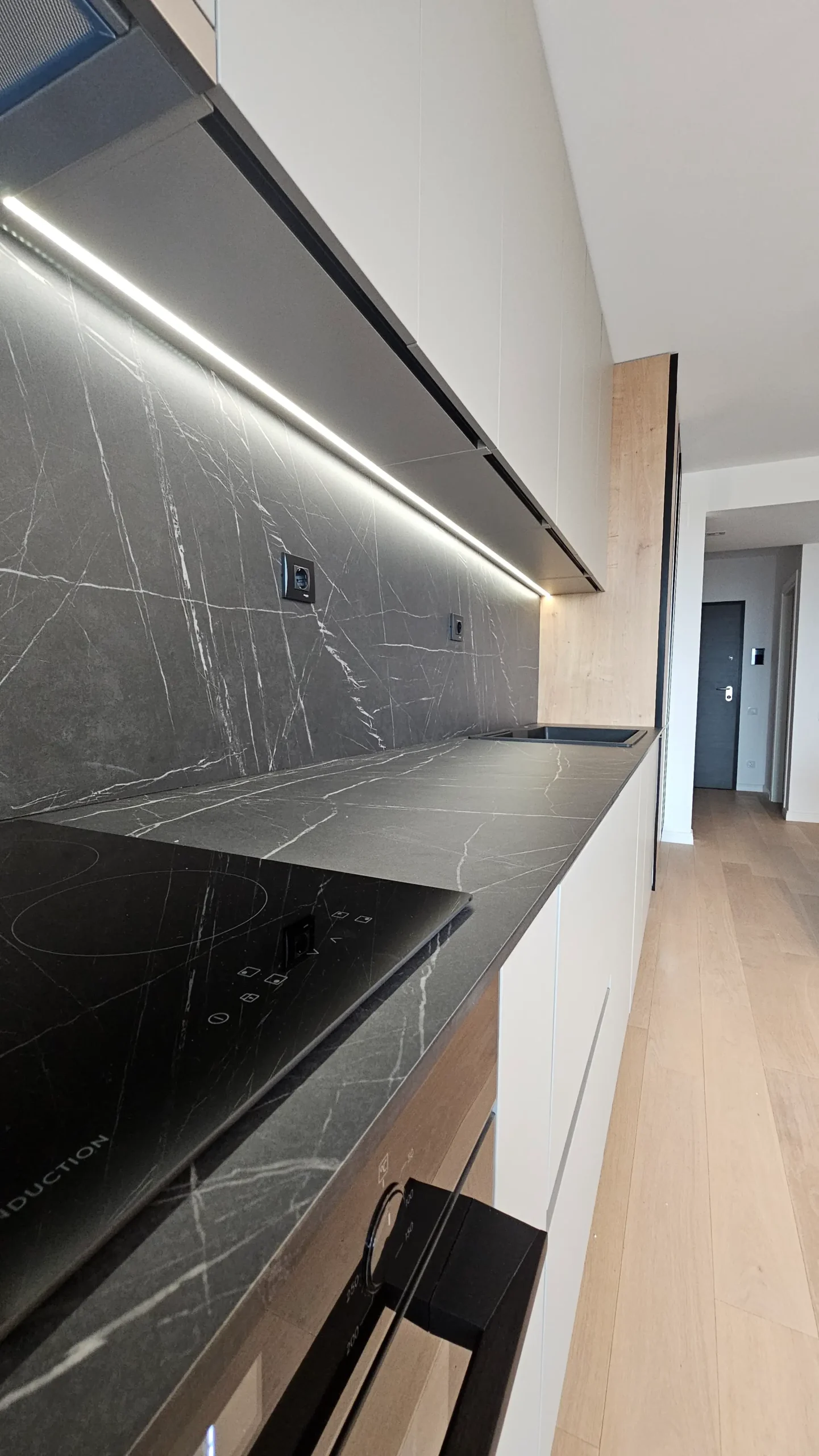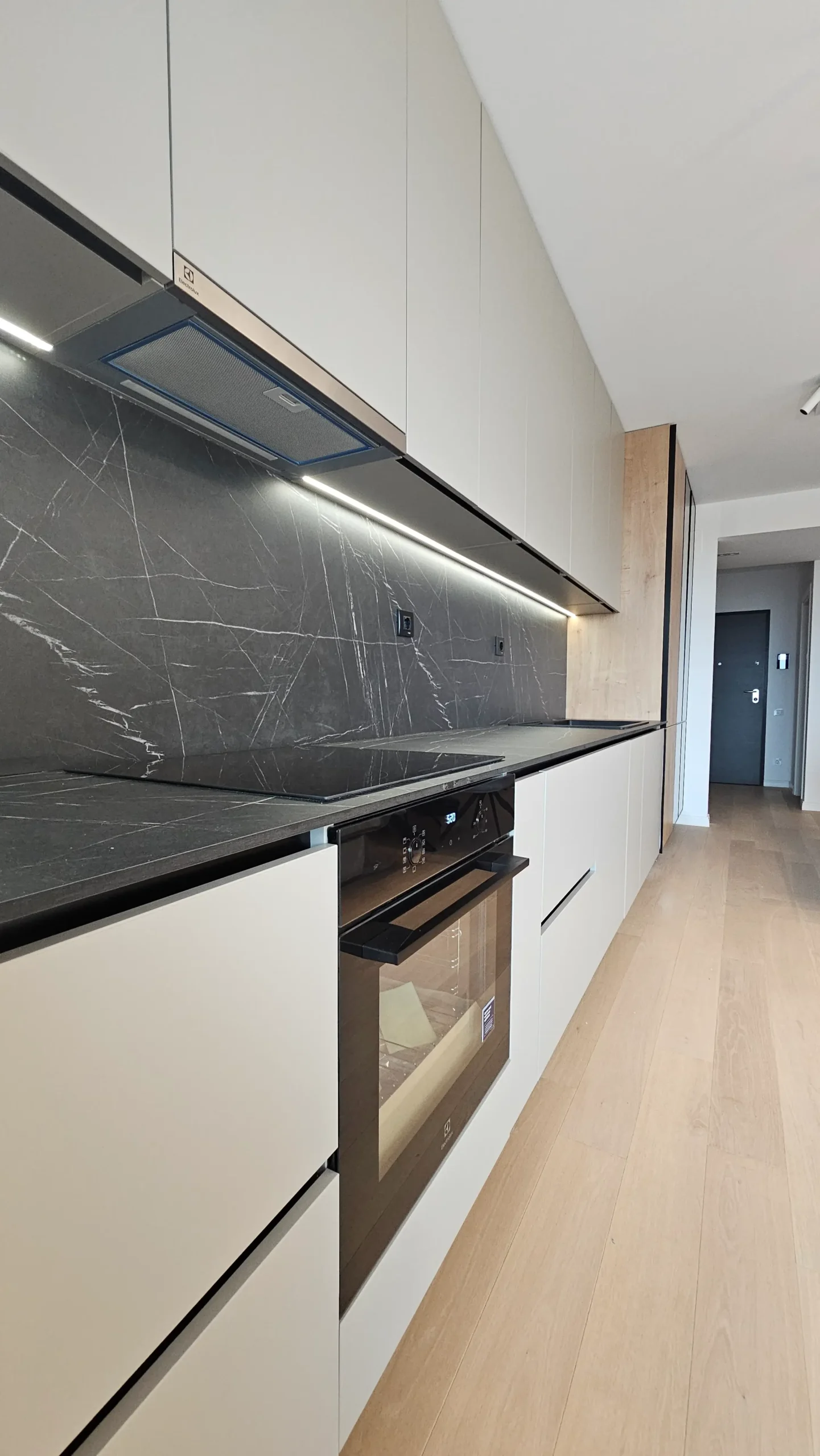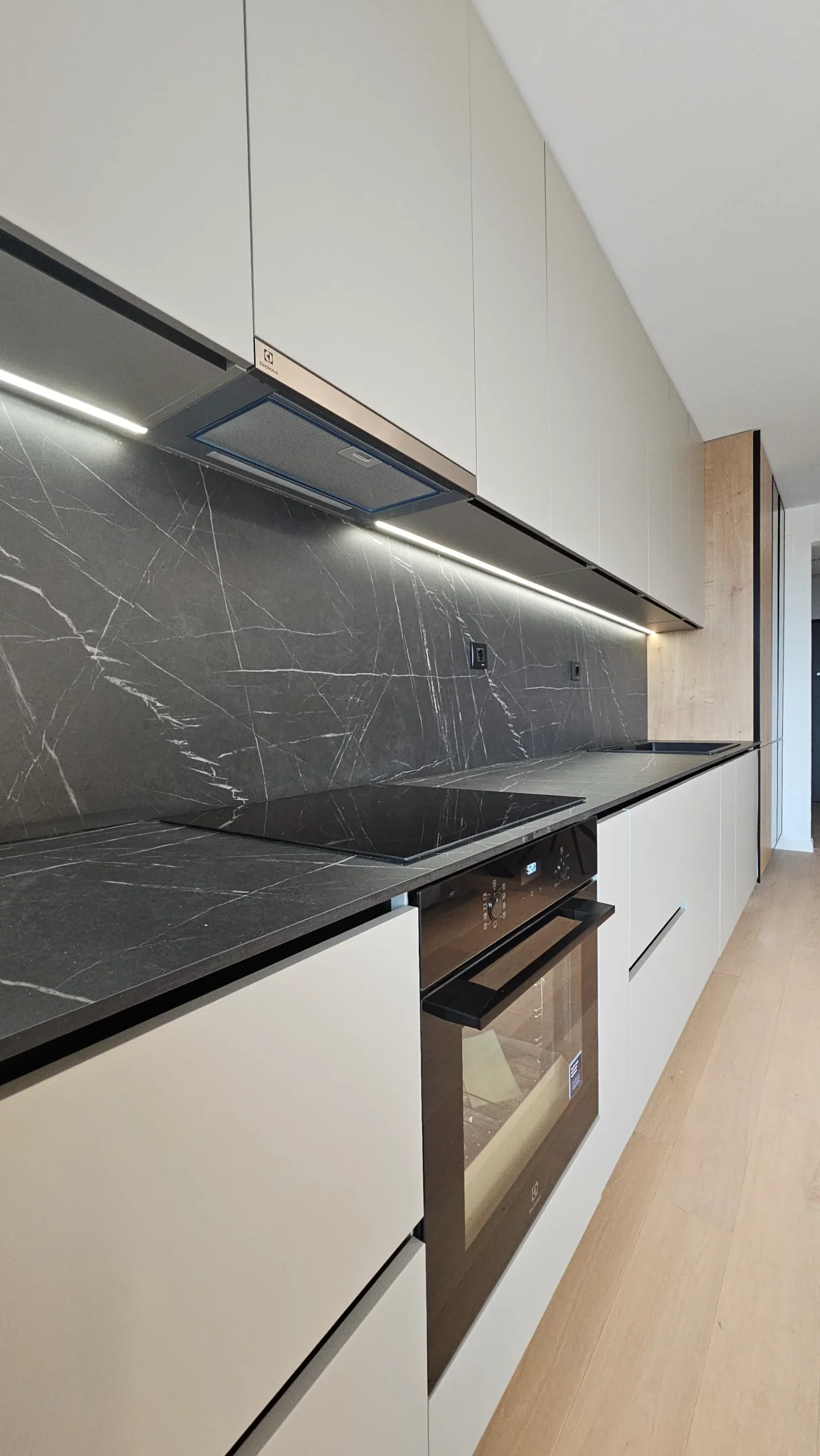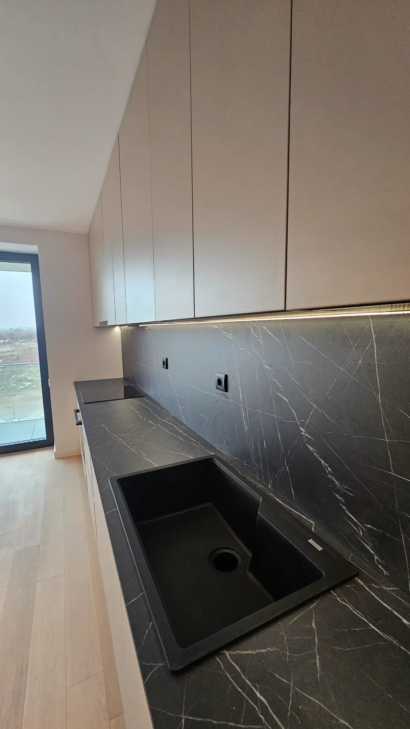 Mobilier de bucătărie pe toată lungimea peretelui, cu fronturi mate în nuanțe de bej și negru.