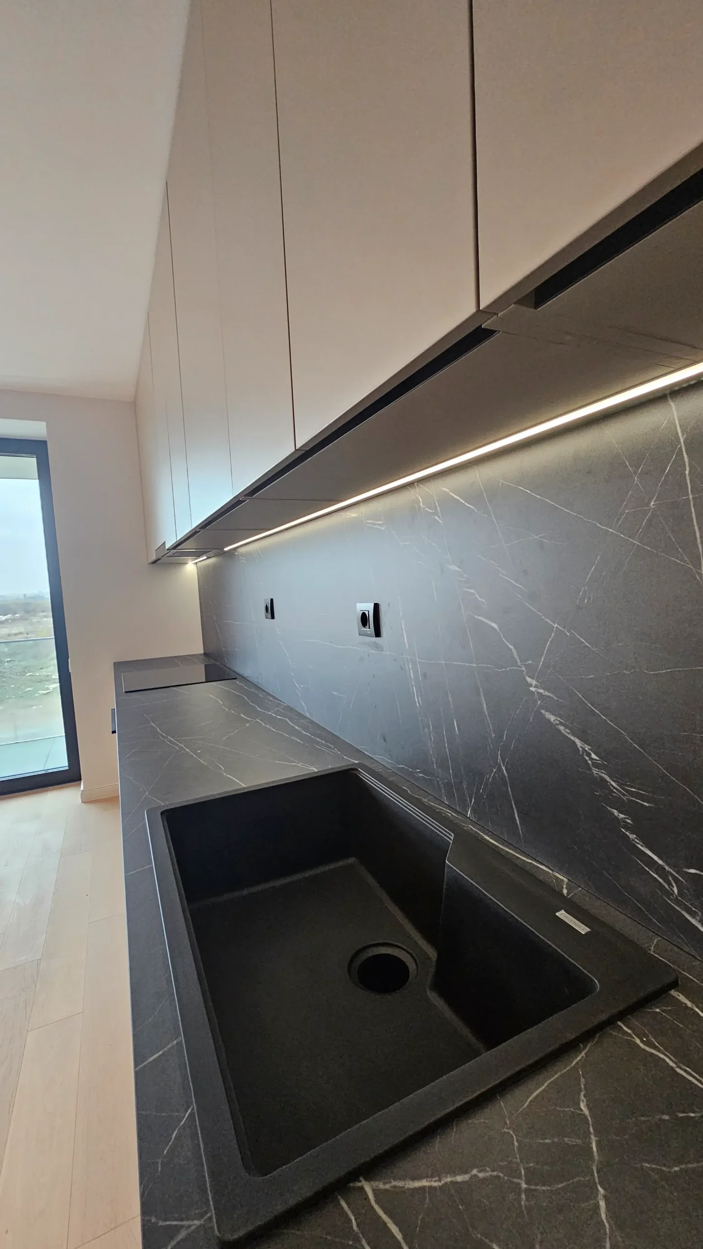Blat de lucru din material cu aspect de marmură neagră, oferind un contrast elegant.