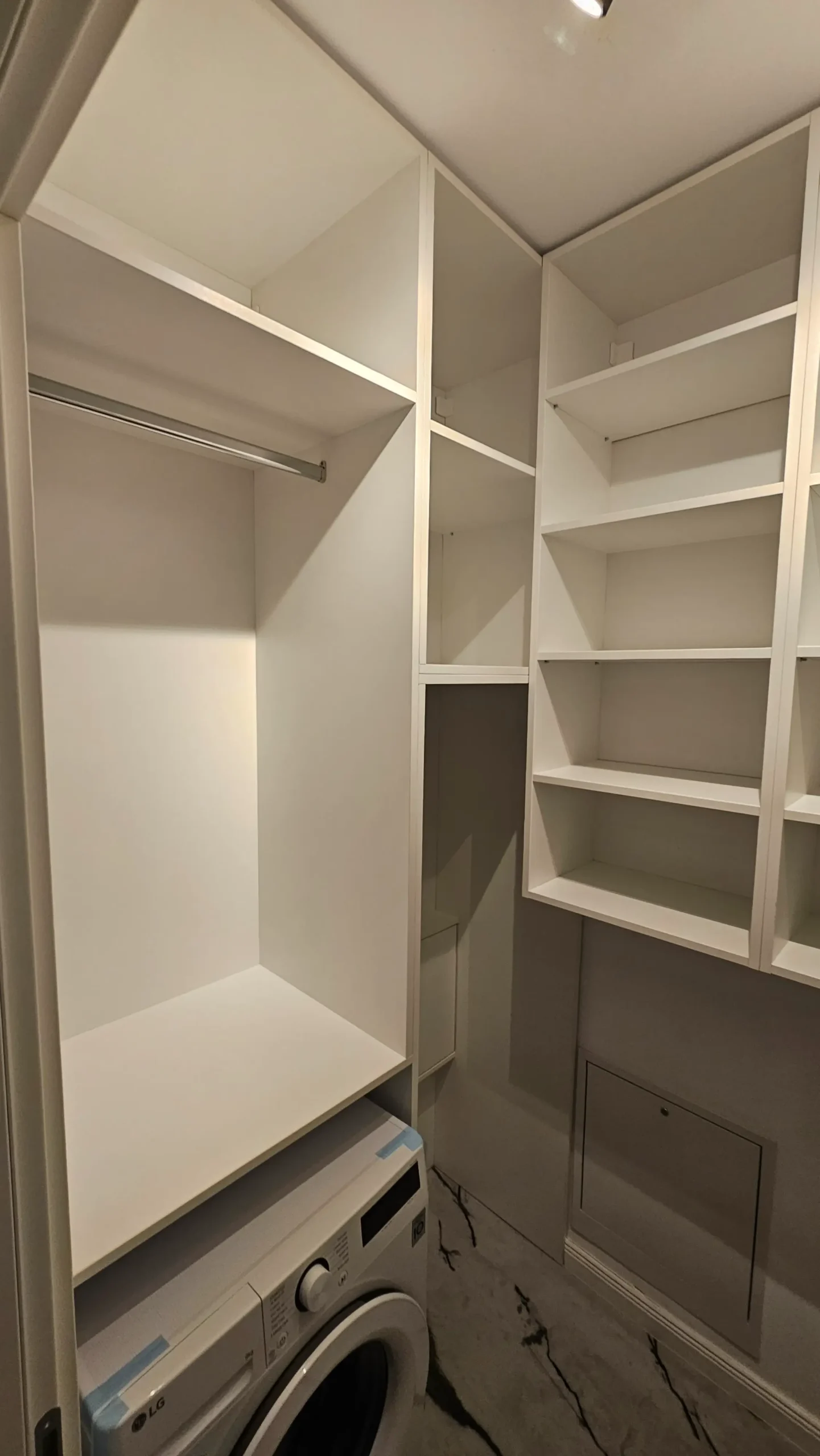 Spațiu de depozitare mare, cu uși albe mate, fără mânere vizibile, aliniat perfect cu designul modern al camerei.