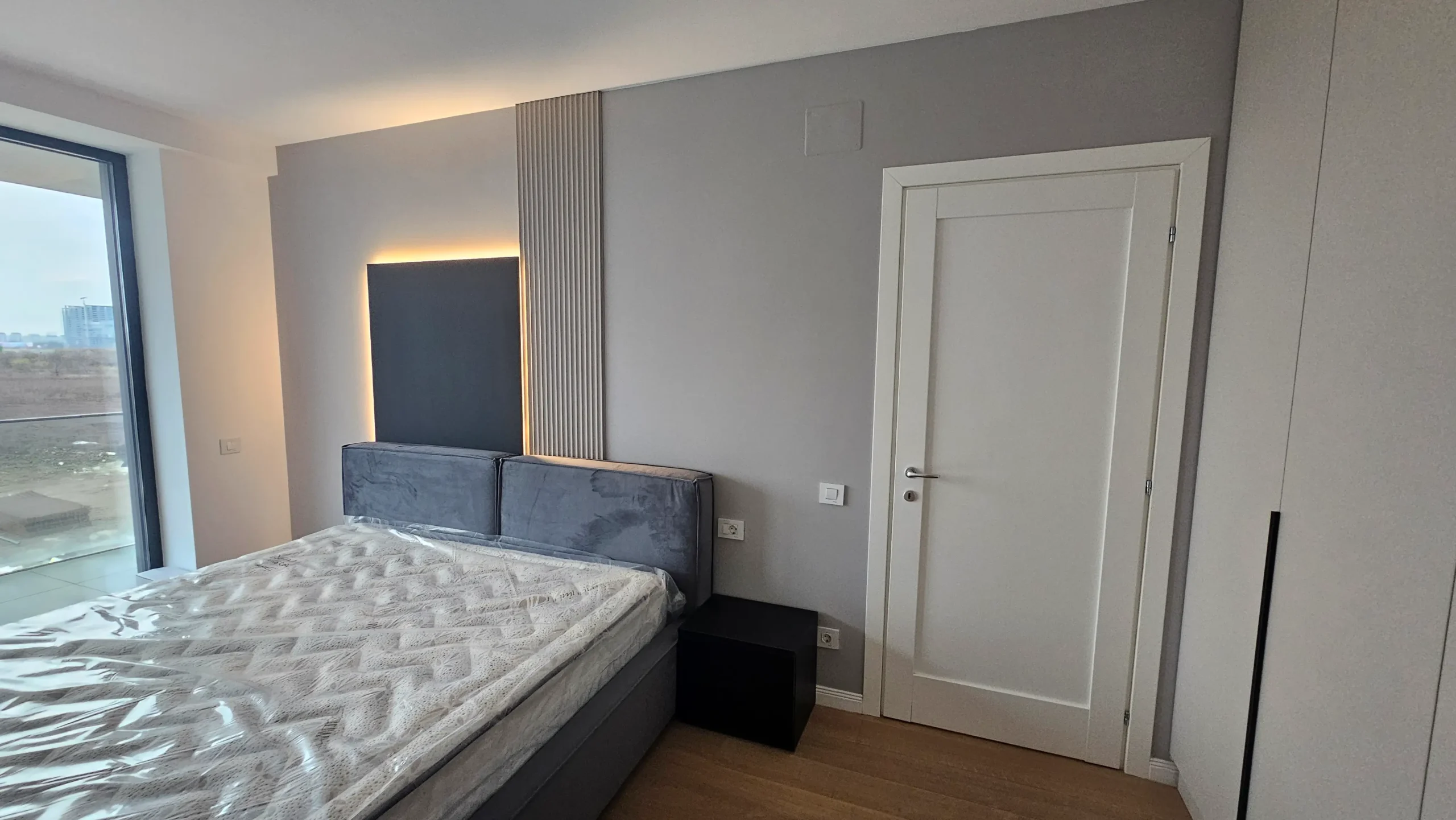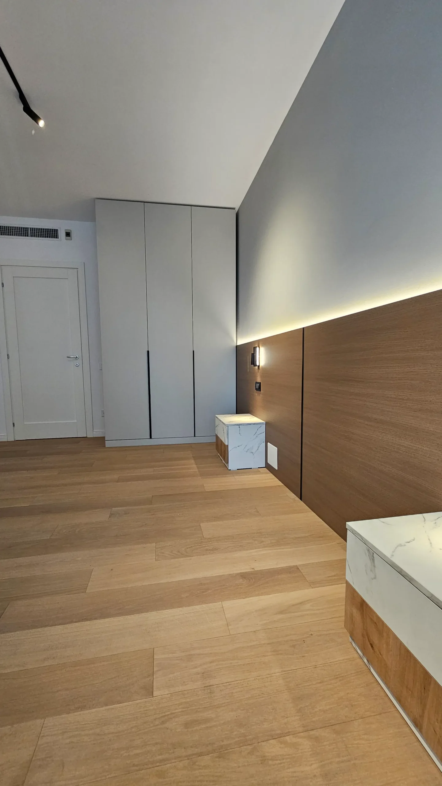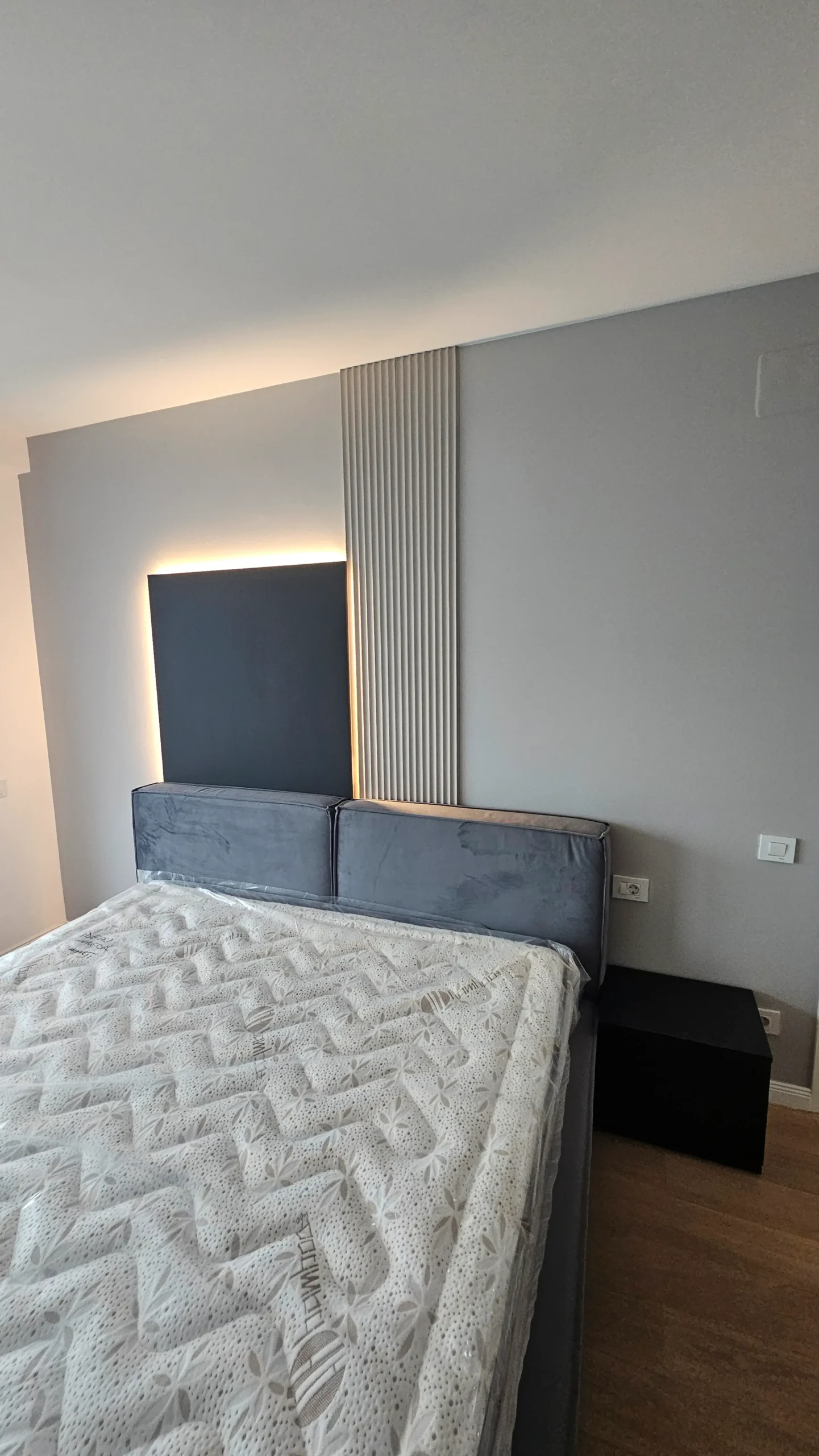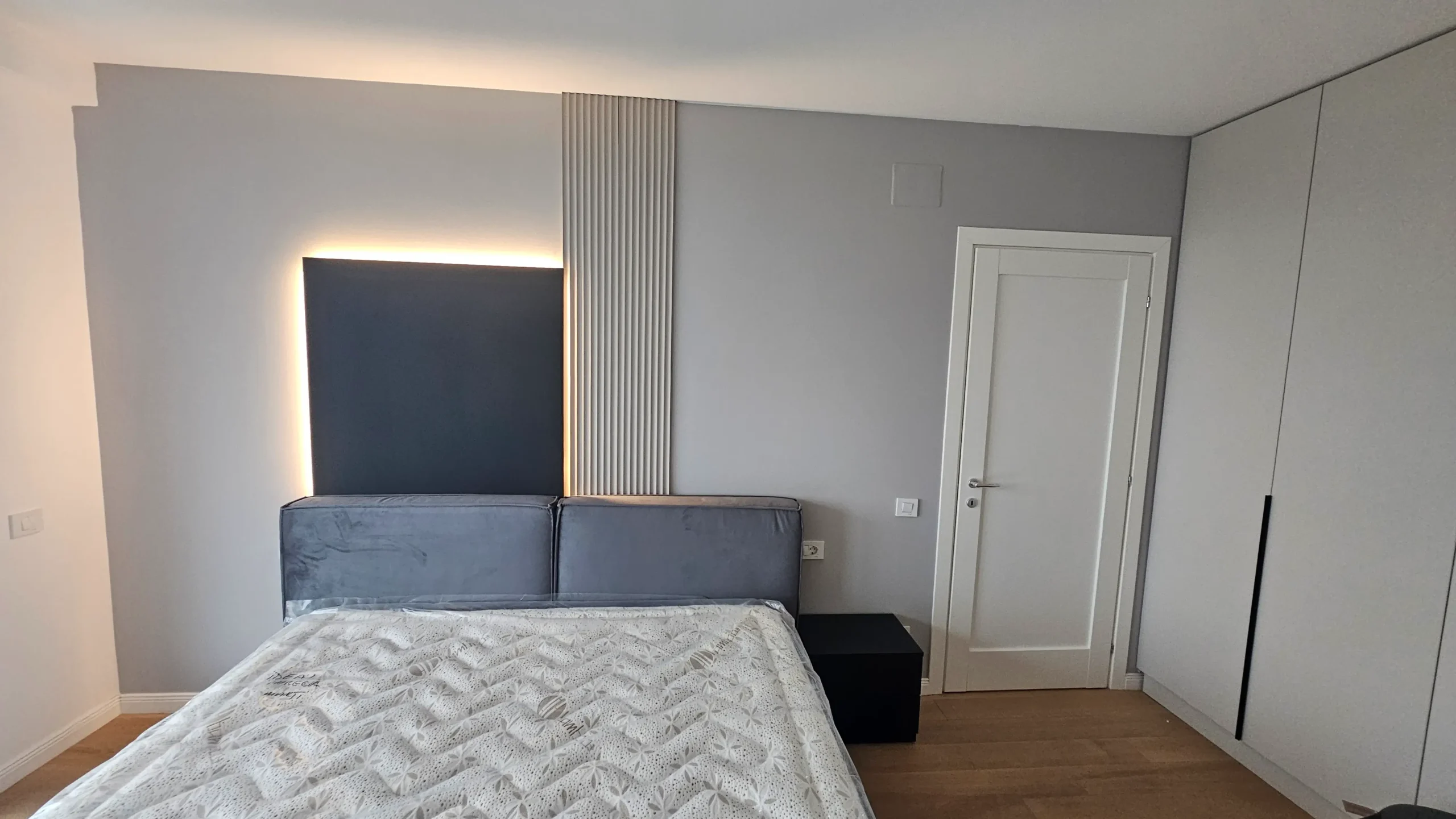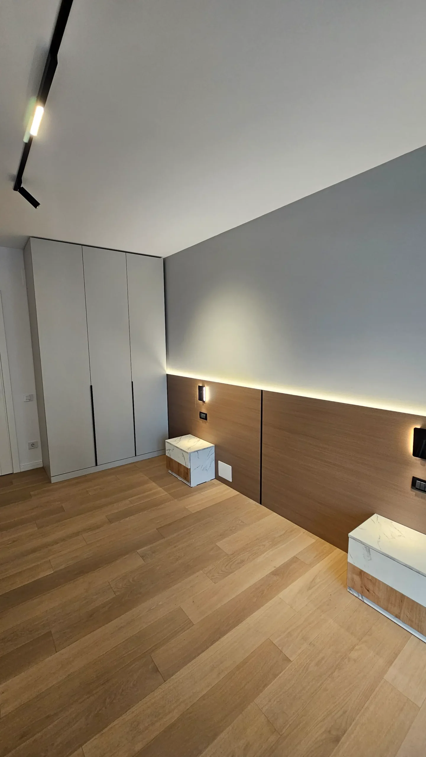 Peretele de la pat are un panou din lemn natural, completat de o bandă LED subtilă, care adaugă profunzime și căldură camerei.