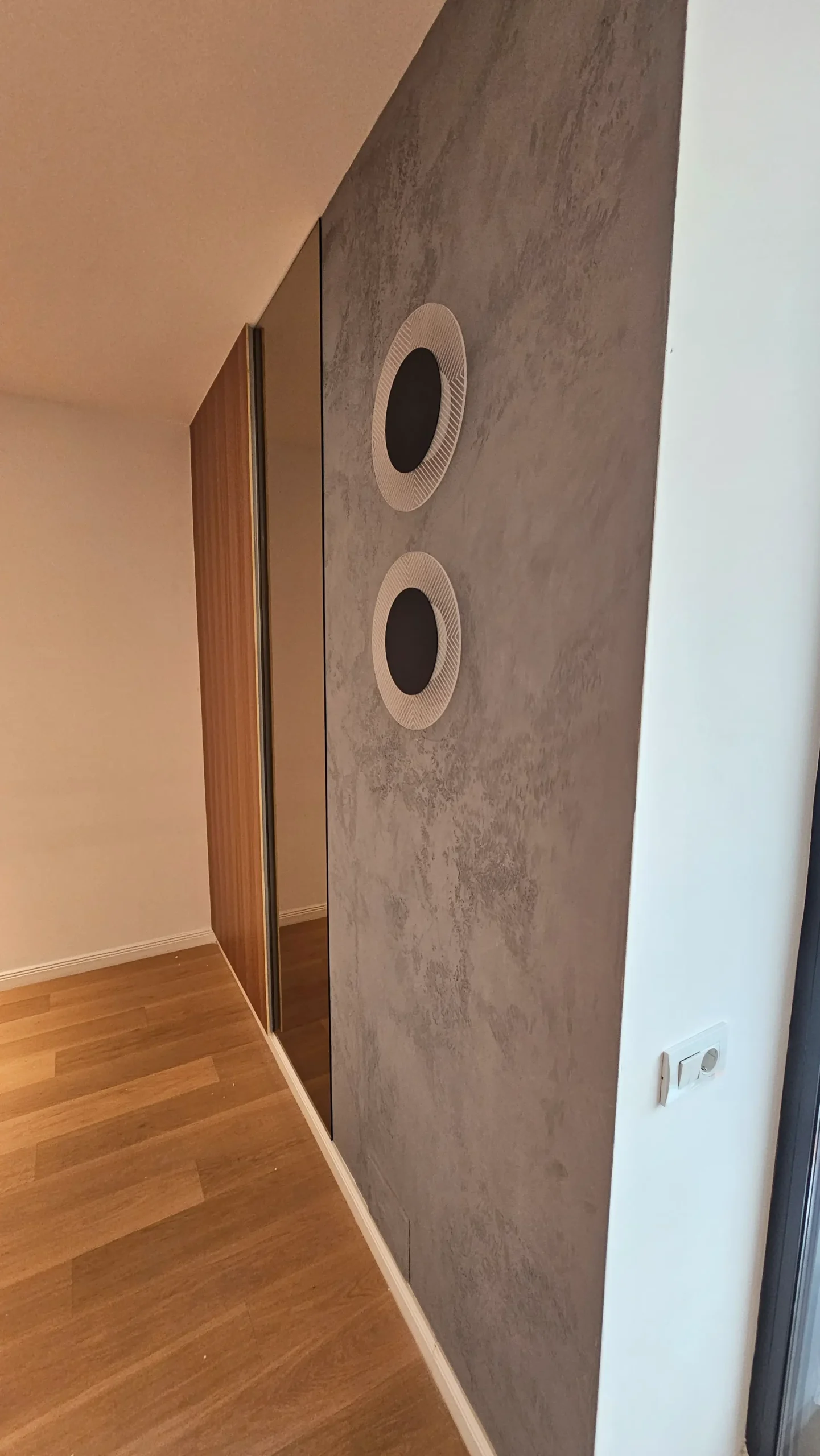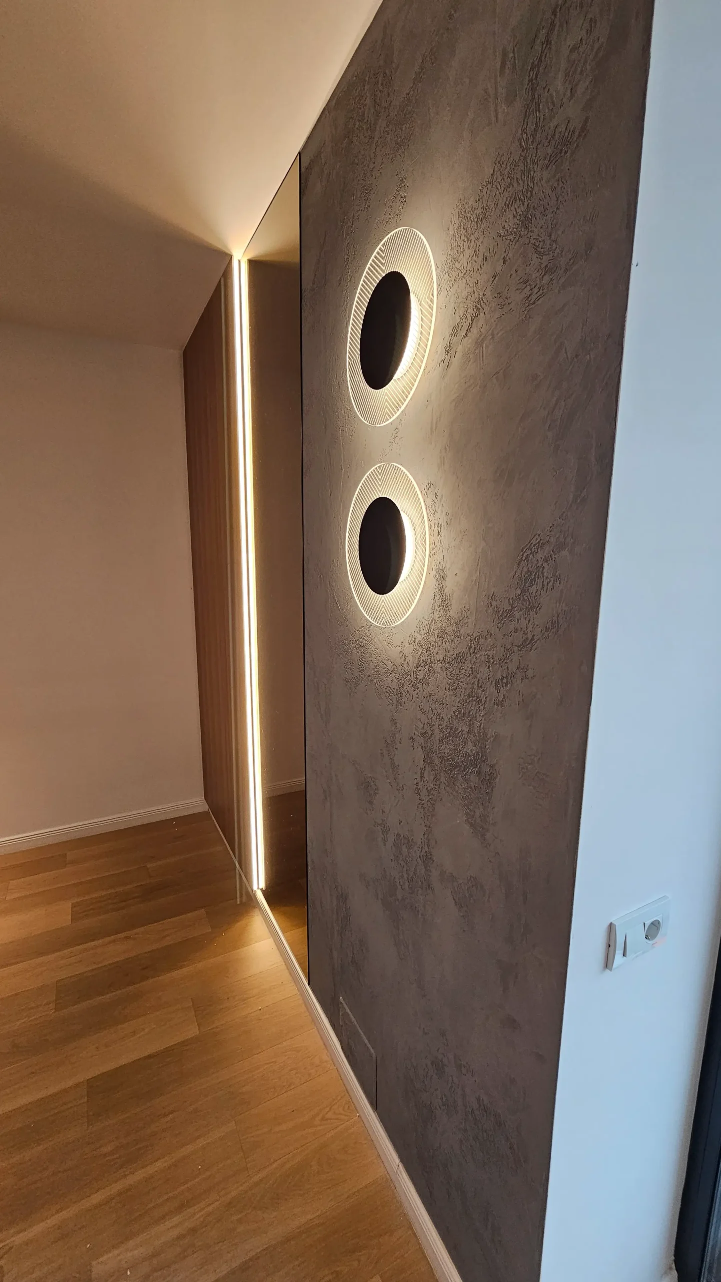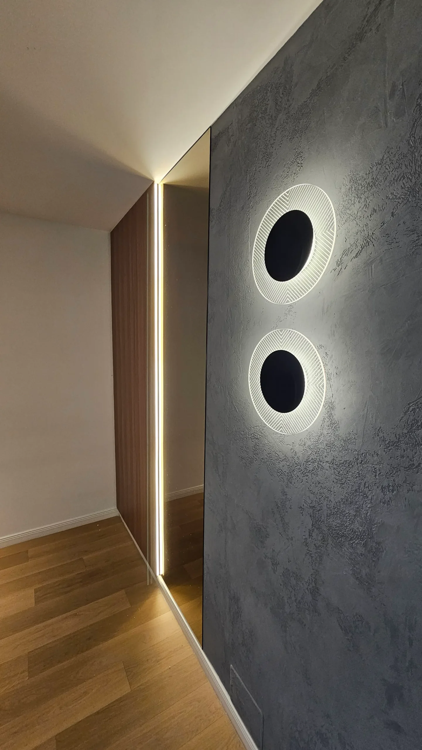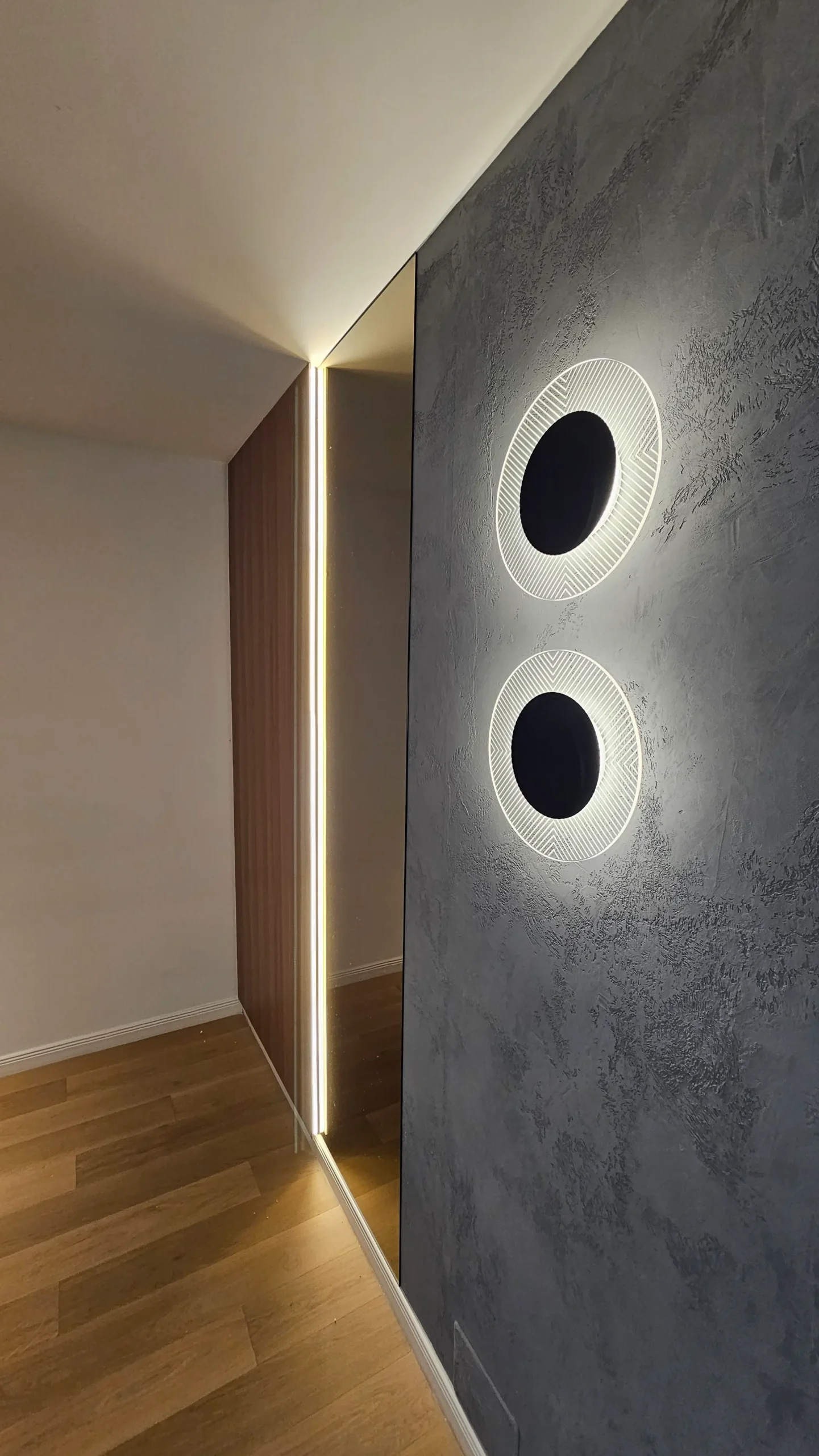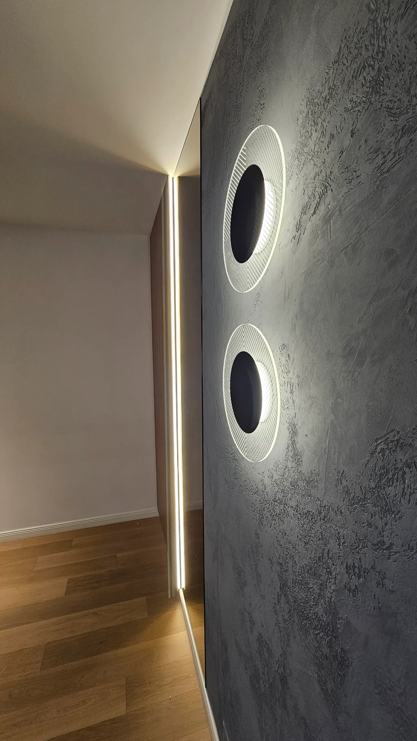 Panouri cu textură betonată și două corpuri de iluminat circulare, integrate pe perete, care adaugă un efect vizual dramatic și modern.