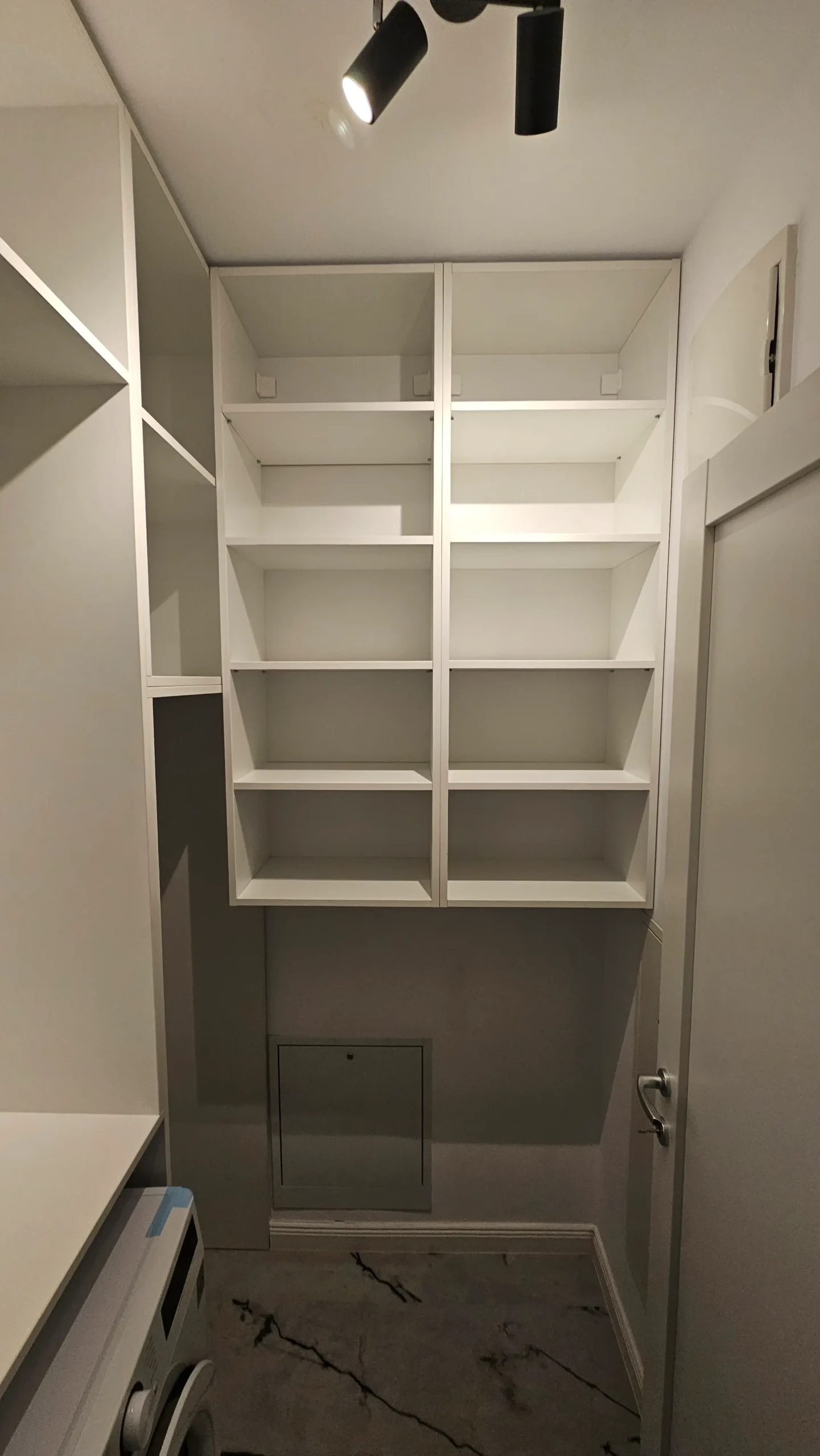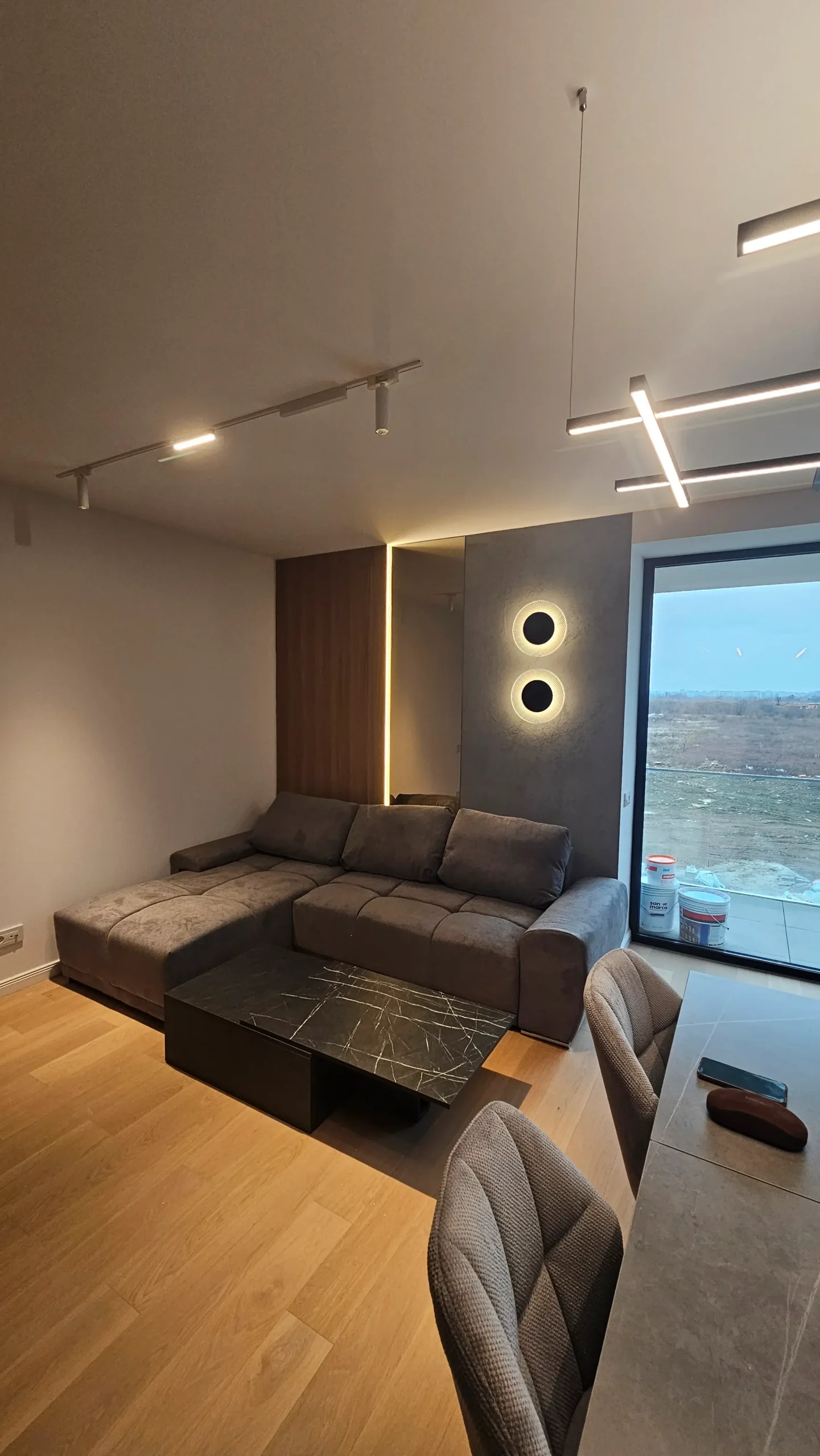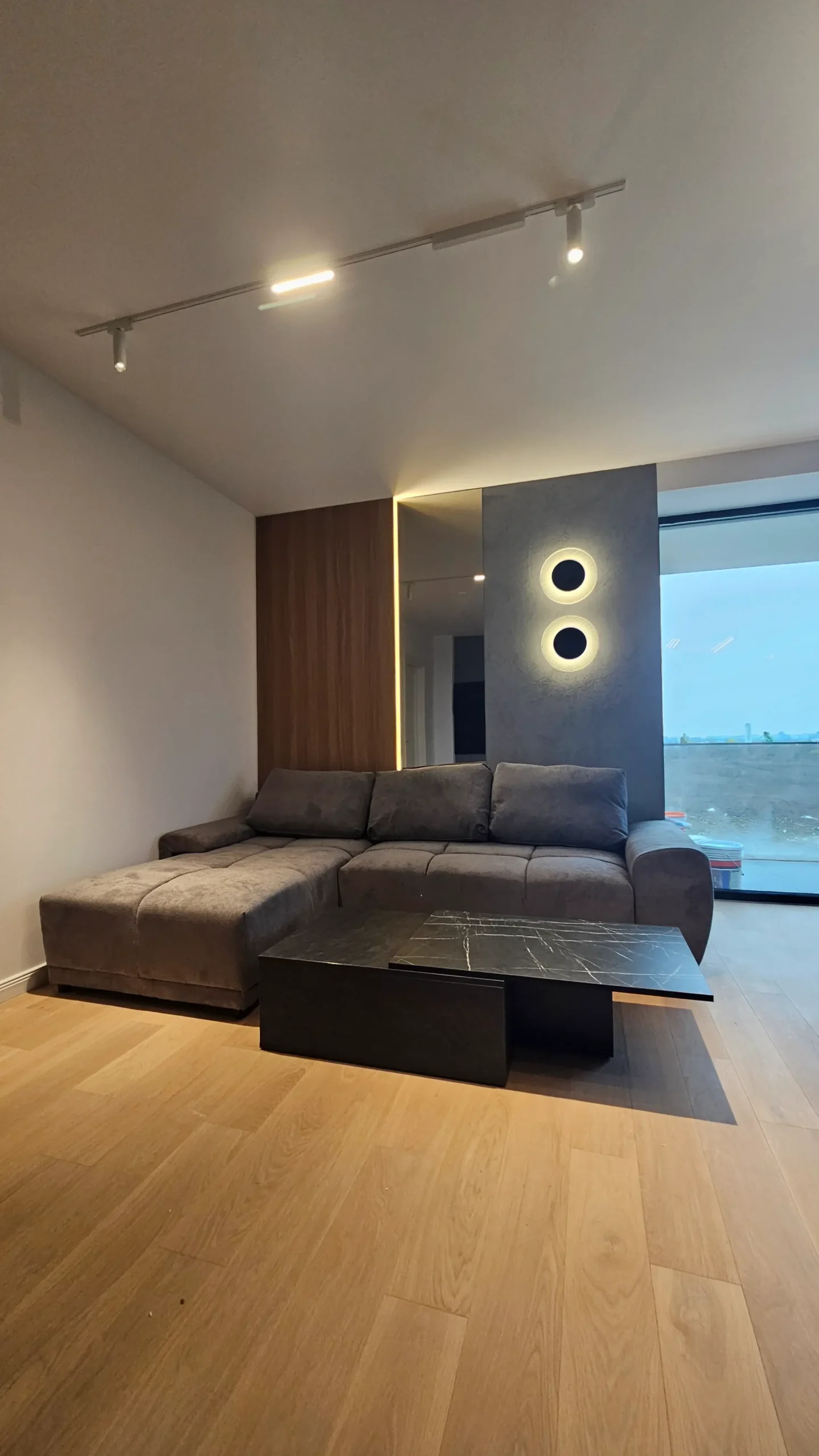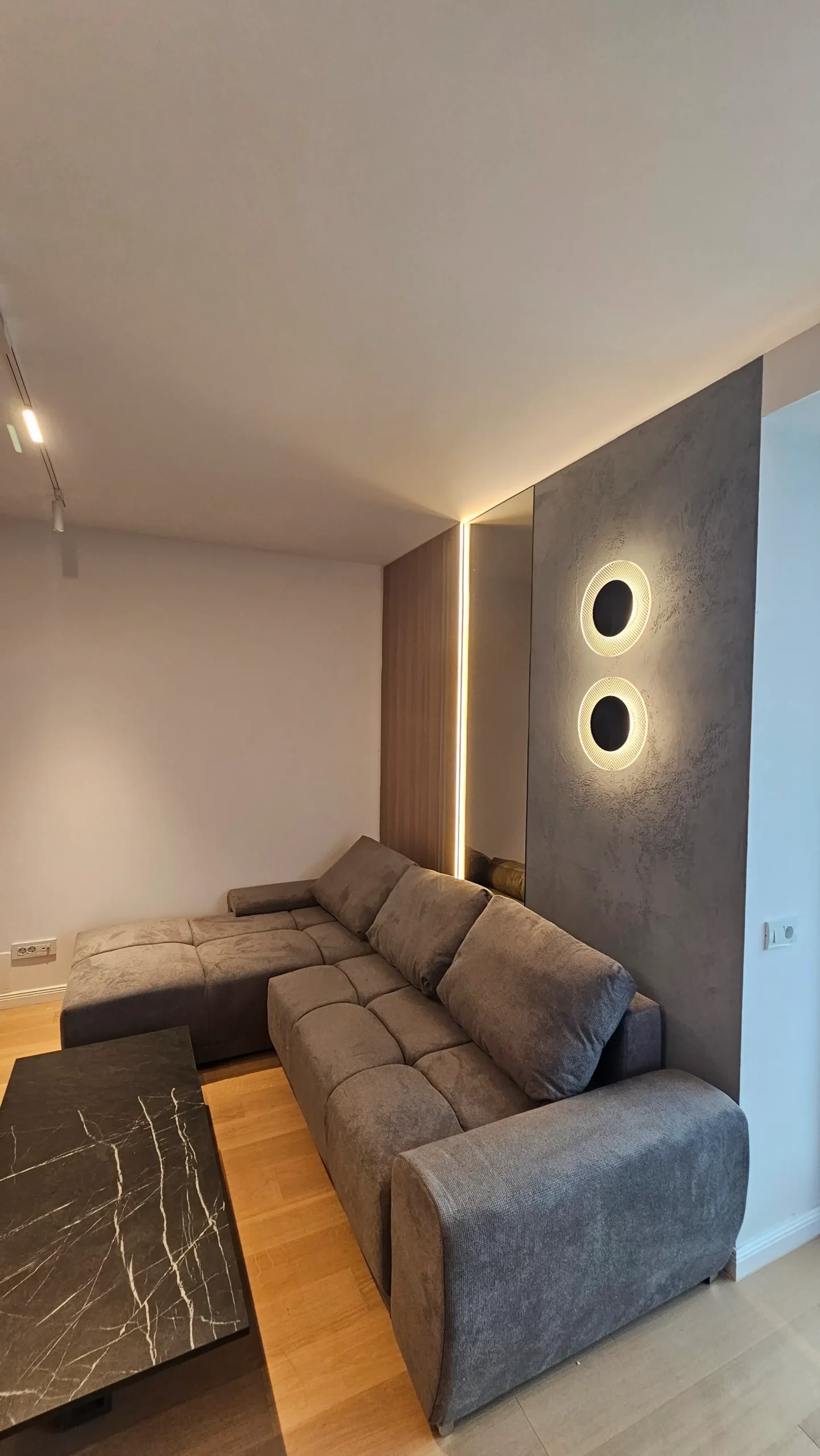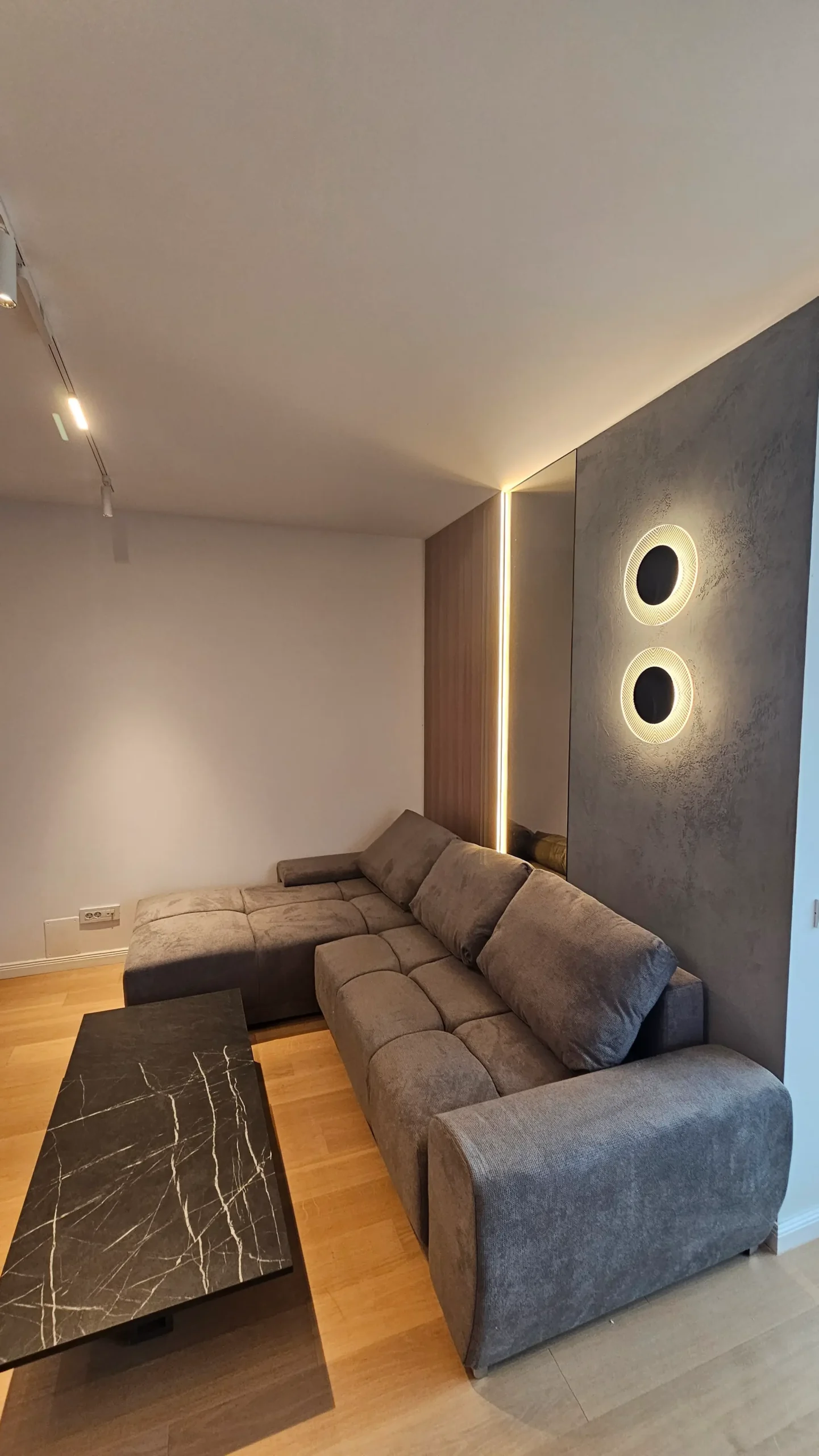 Panouri cu textură betonată și două corpuri de iluminat circulare, integrate pe perete, care adaugă un efect vizual dramatic și modern.