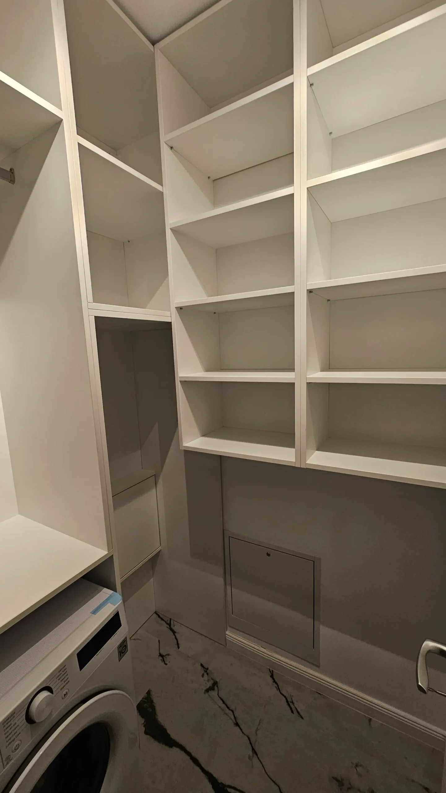 Sertare și spații de depozitare cu mânere discrete, integrate în mobilier.
