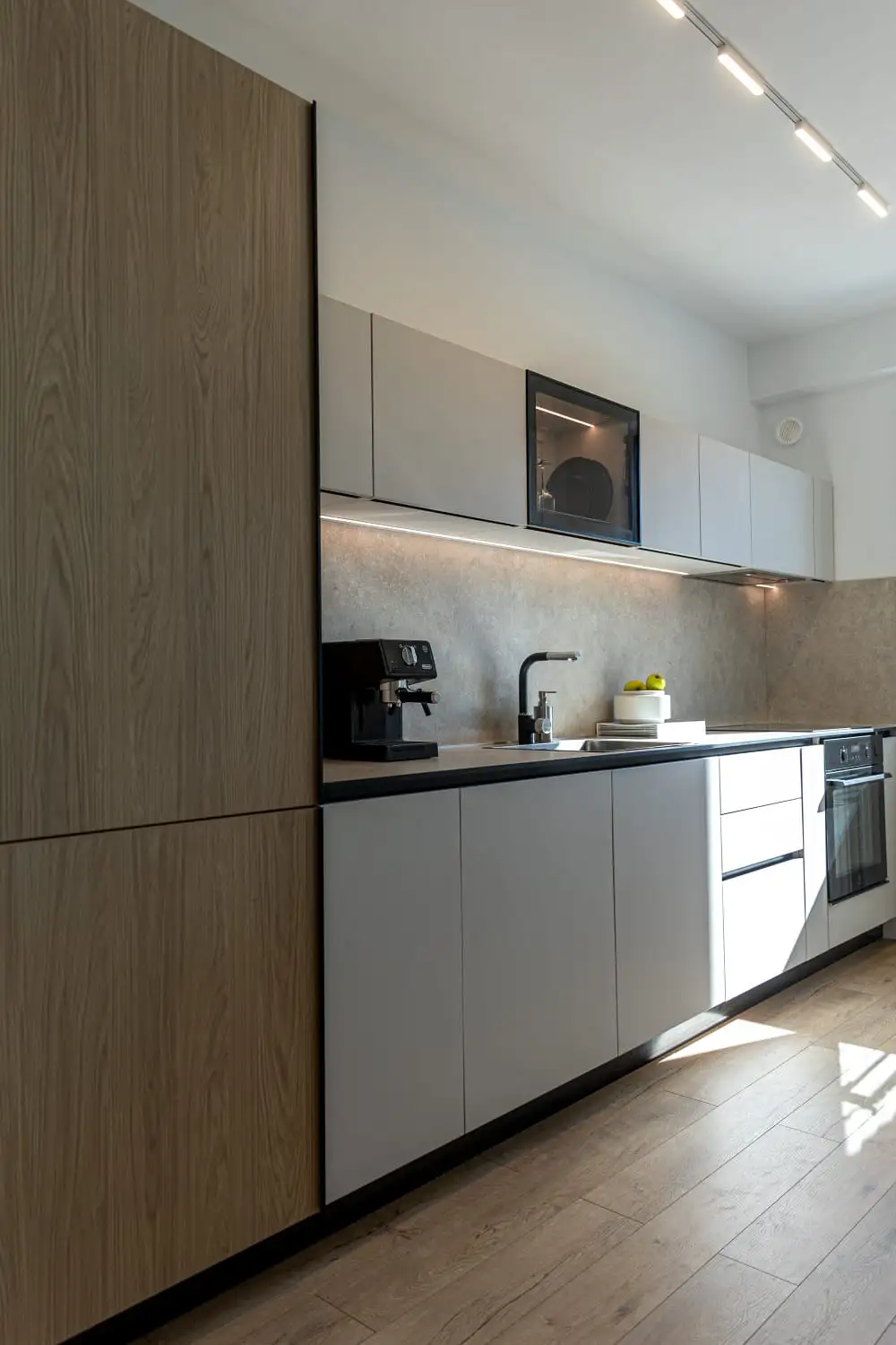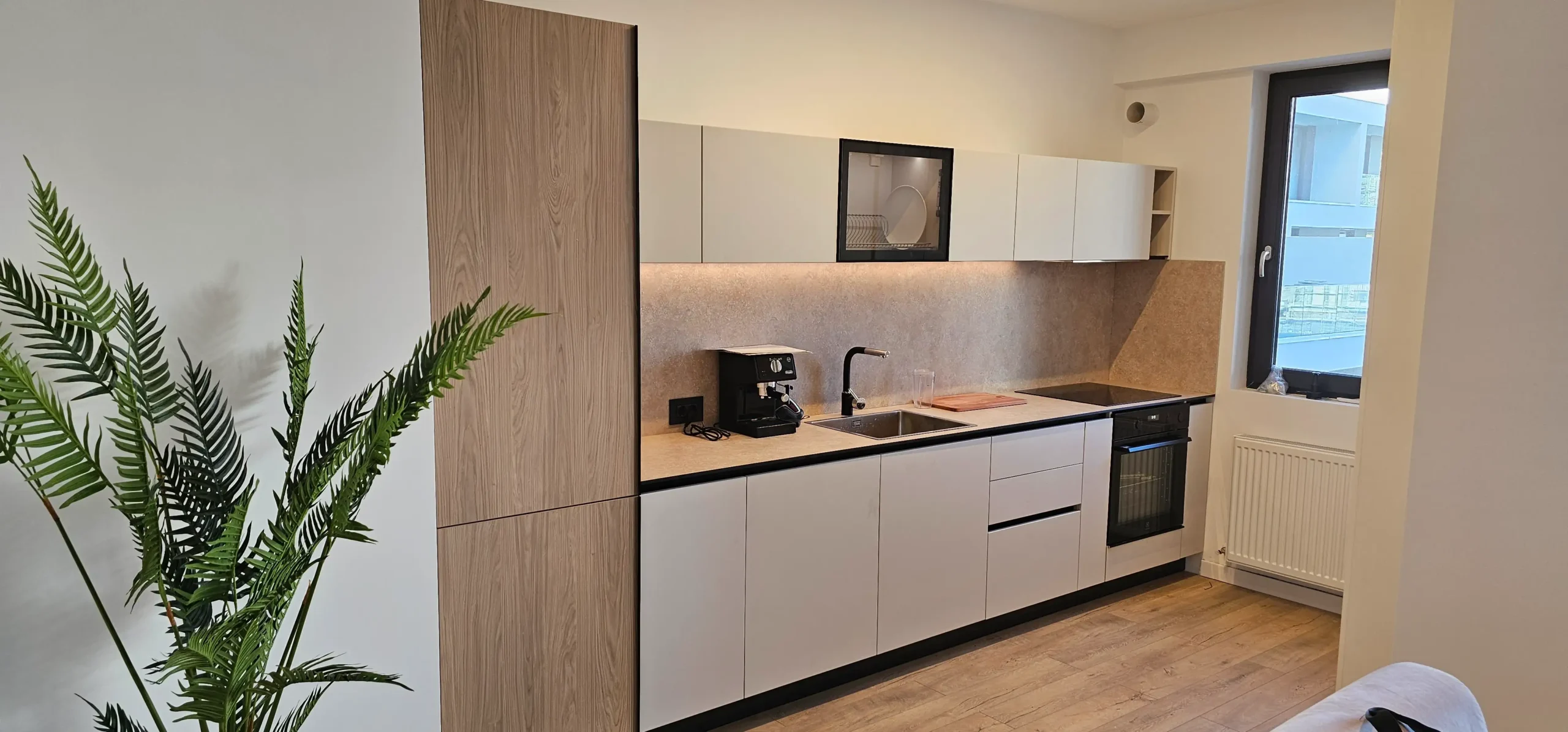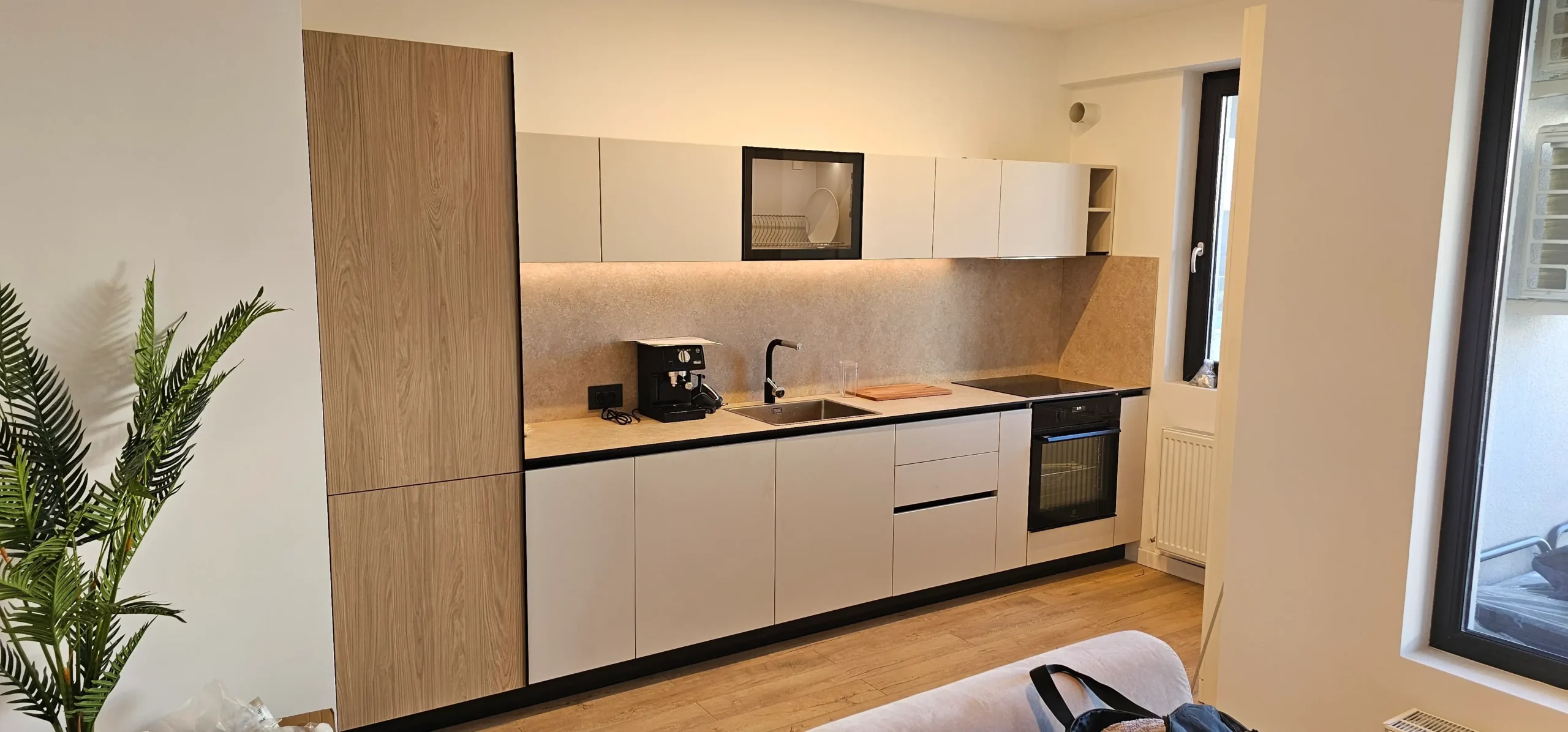 Electrocasnice integrate: Designul mobilierului permite o integrare armonioasă a electrocasnicelor, păstrând spațiul ordonat.