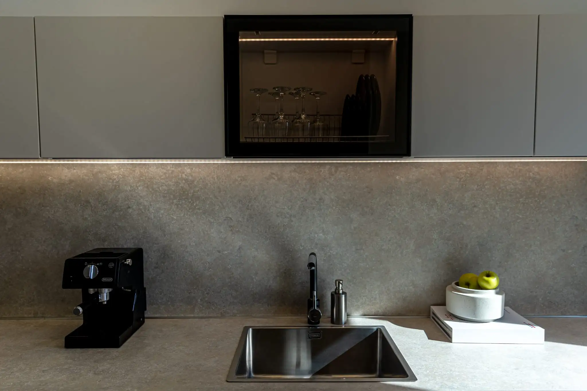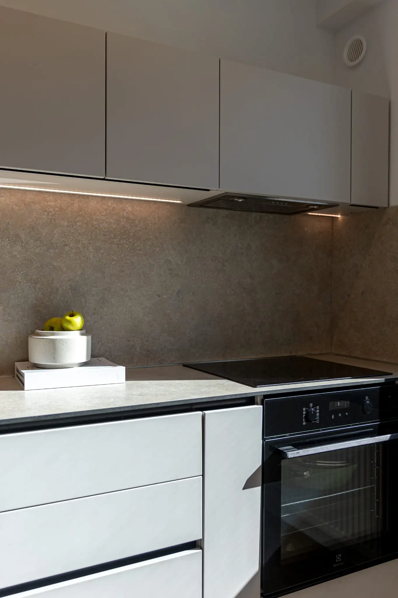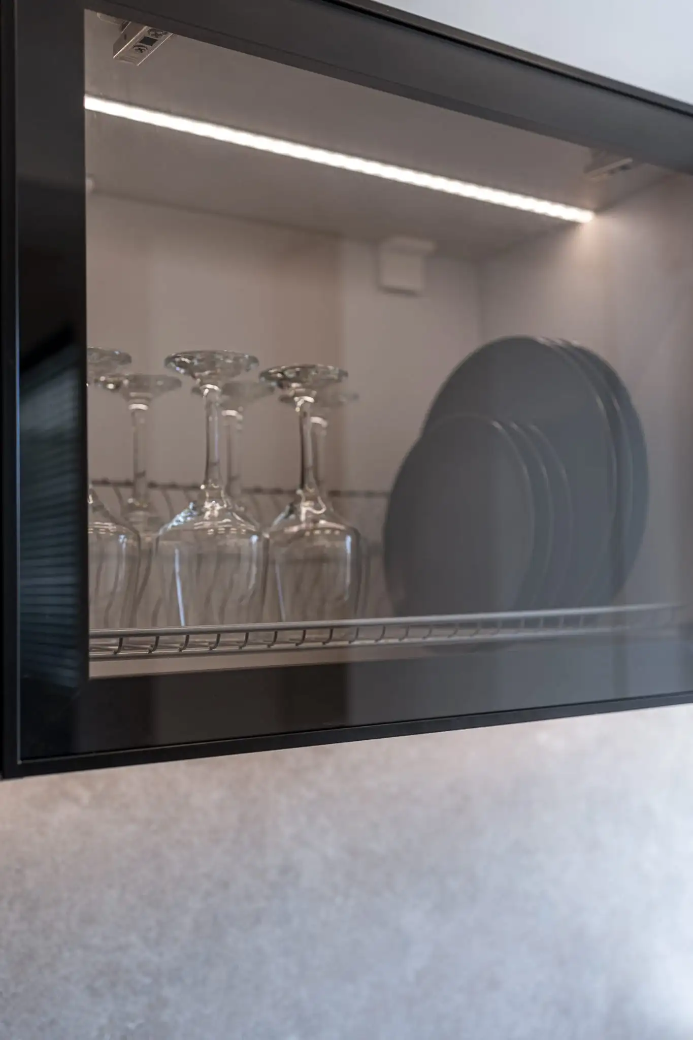 Electrocasnice integrate: Designul mobilierului permite o integrare armonioasă a electrocasnicelor, păstrând spațiul ordonat.