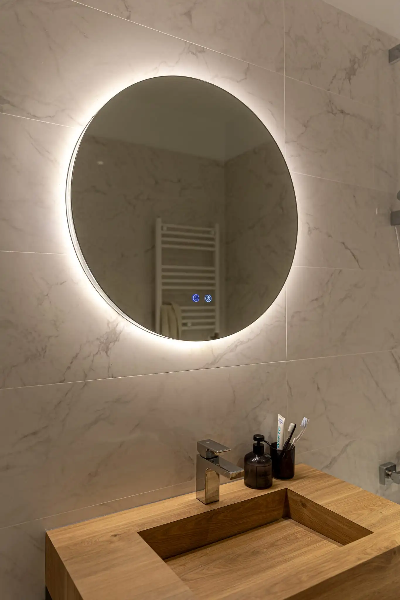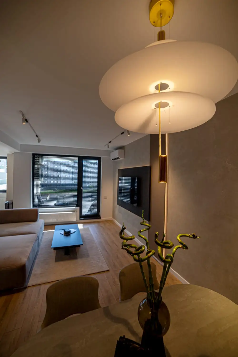 Iluminat integrat: Spoturile și corpurile suspendate completează designul mobilierului, accentuând liniile moderne și funcționalitatea.