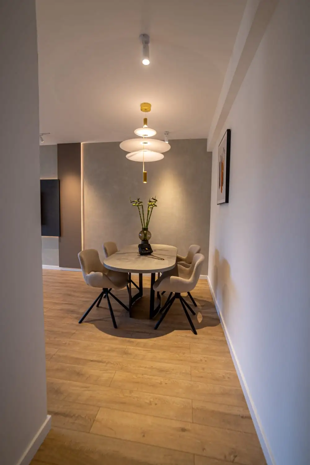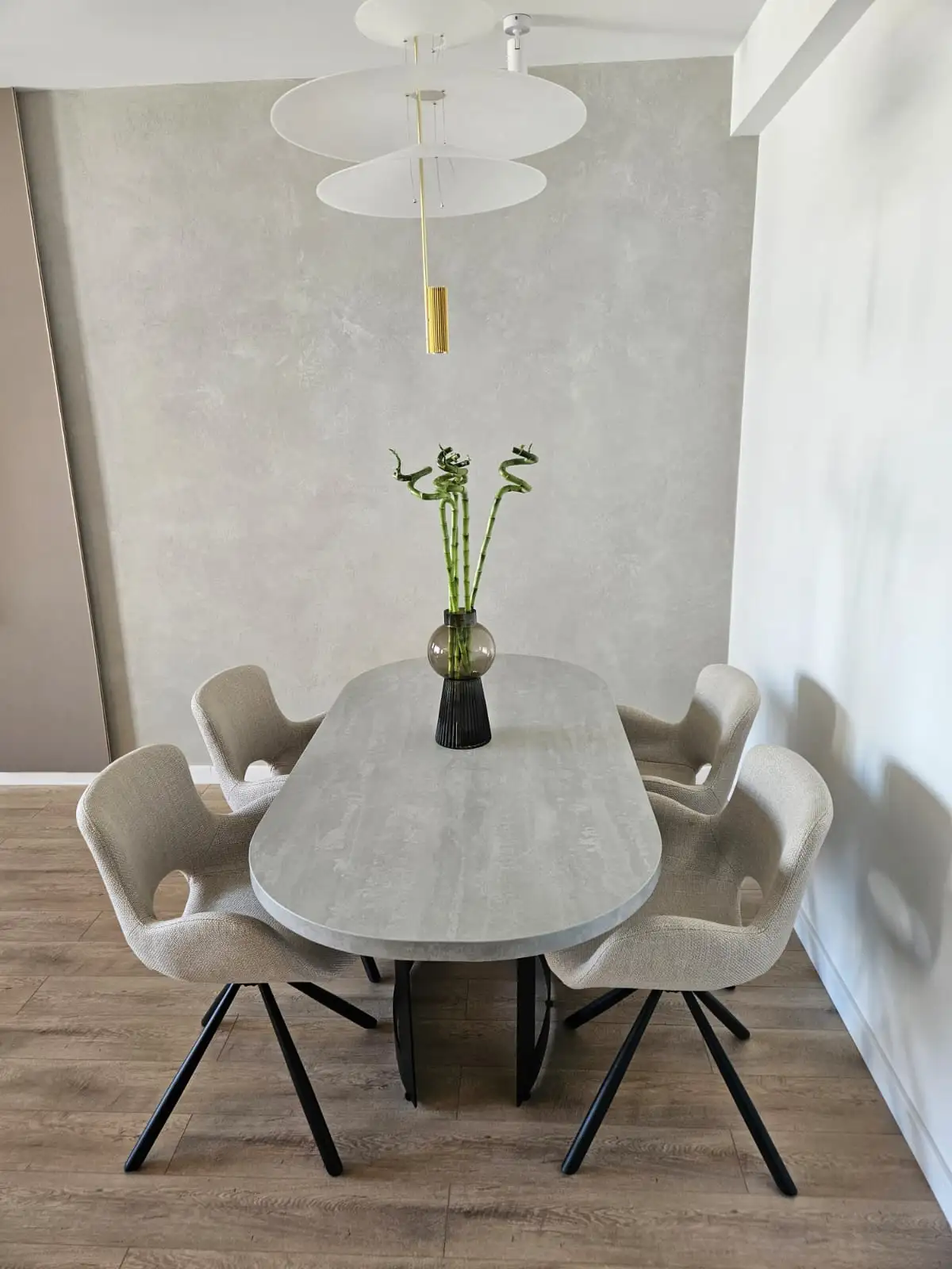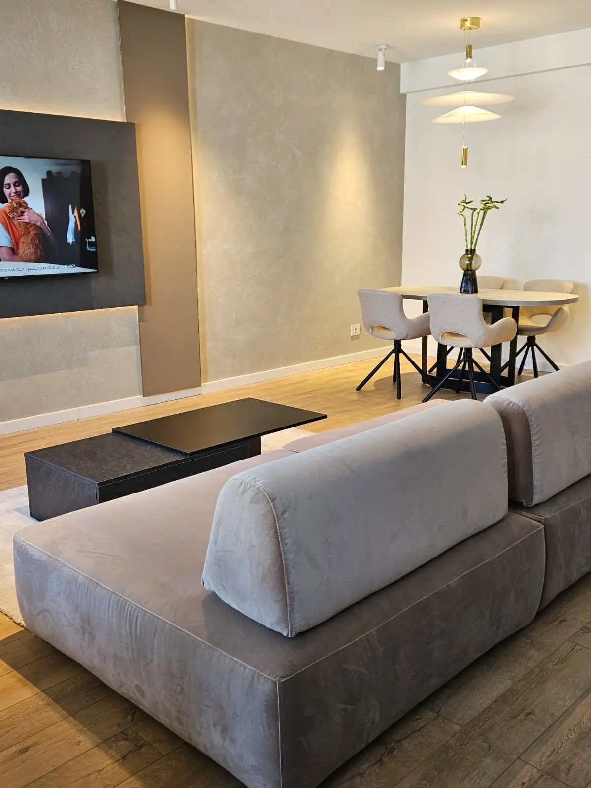 Texturi naturale și culori neutre: Toate piesele de mobilier contribuie la o atmosferă liniștitoare, punând în valoare spațiul apartamentului.