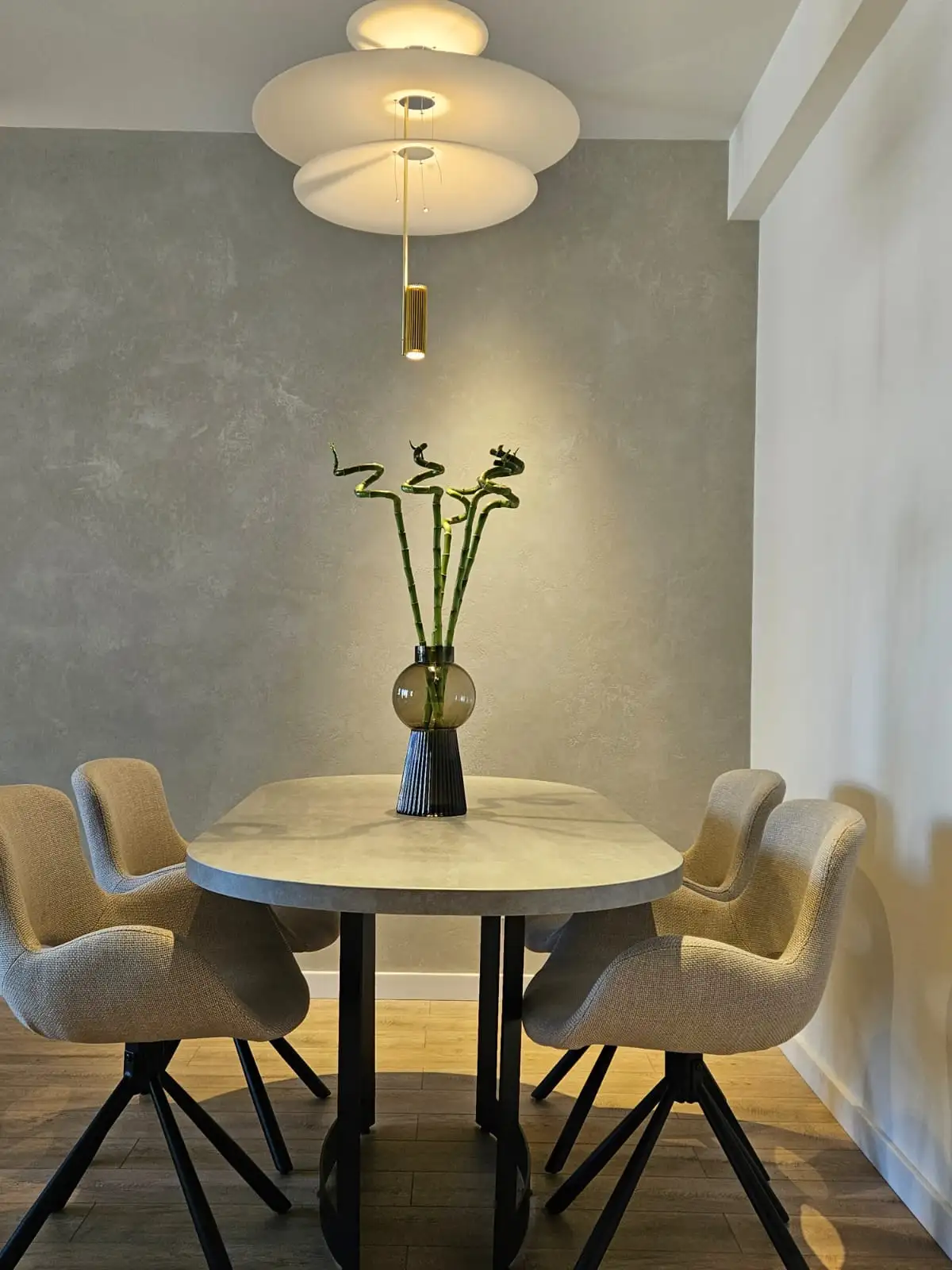 Masă rotundă elegantă: Suprafața netedă și designul simplu o fac punctul central al zonei de dining, perfectă pentru socializare.