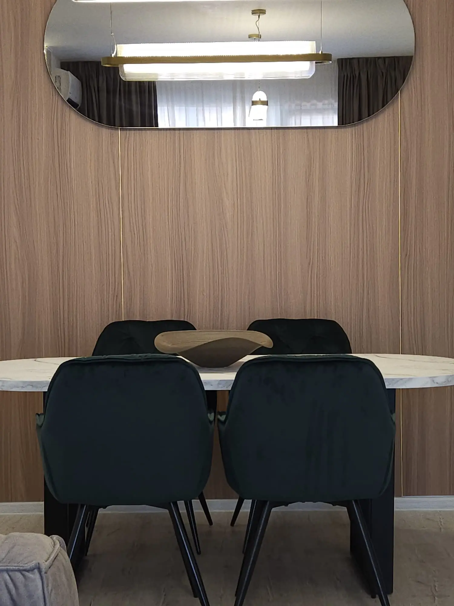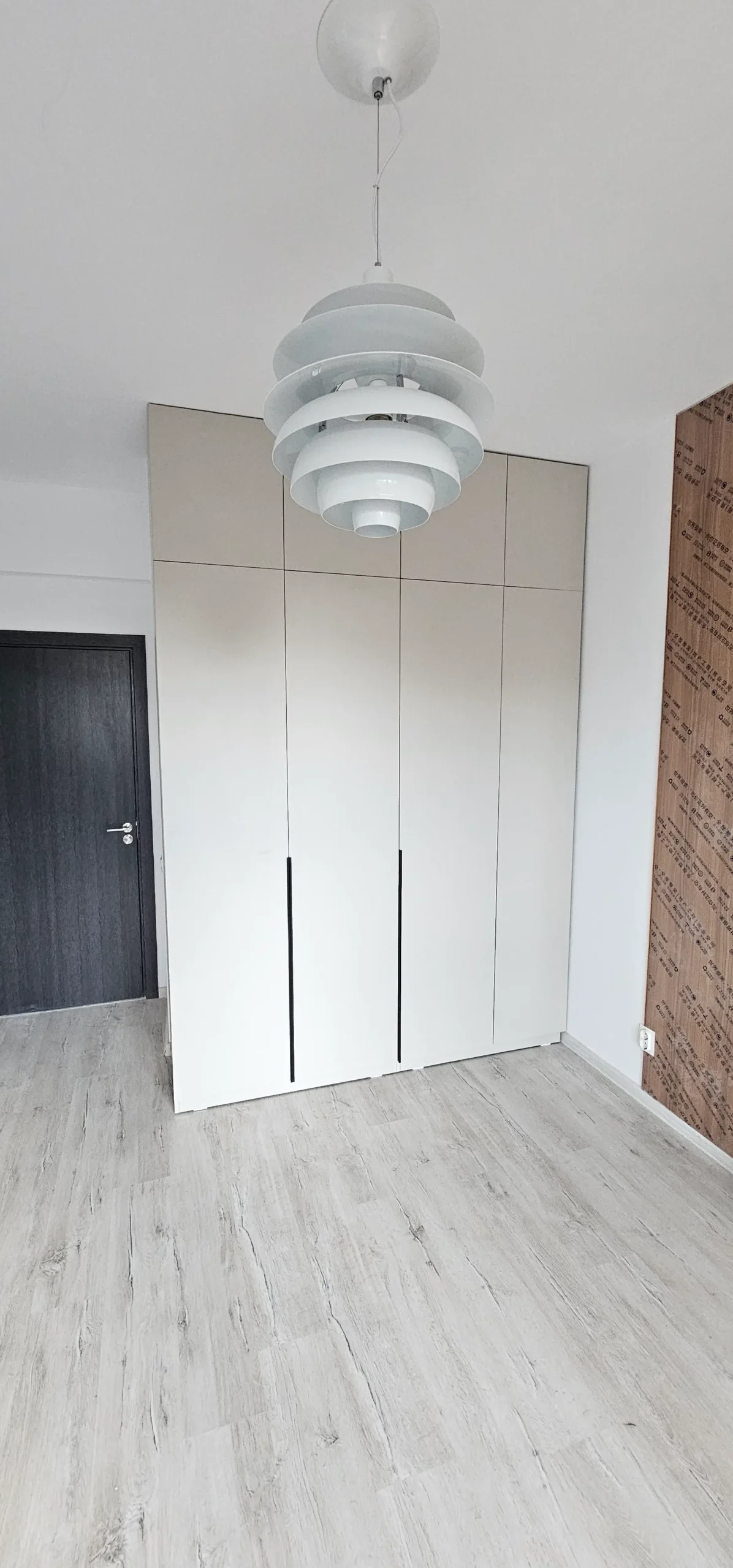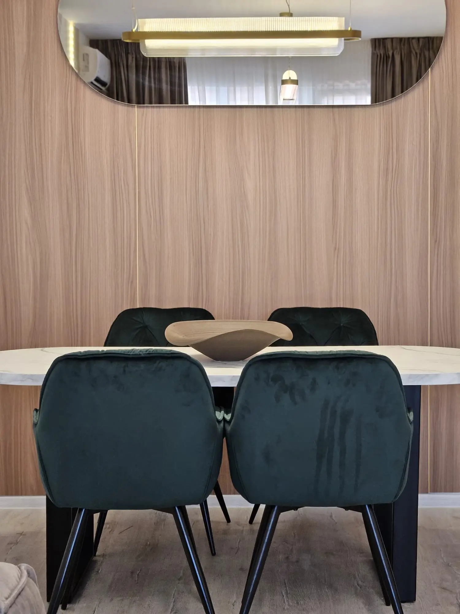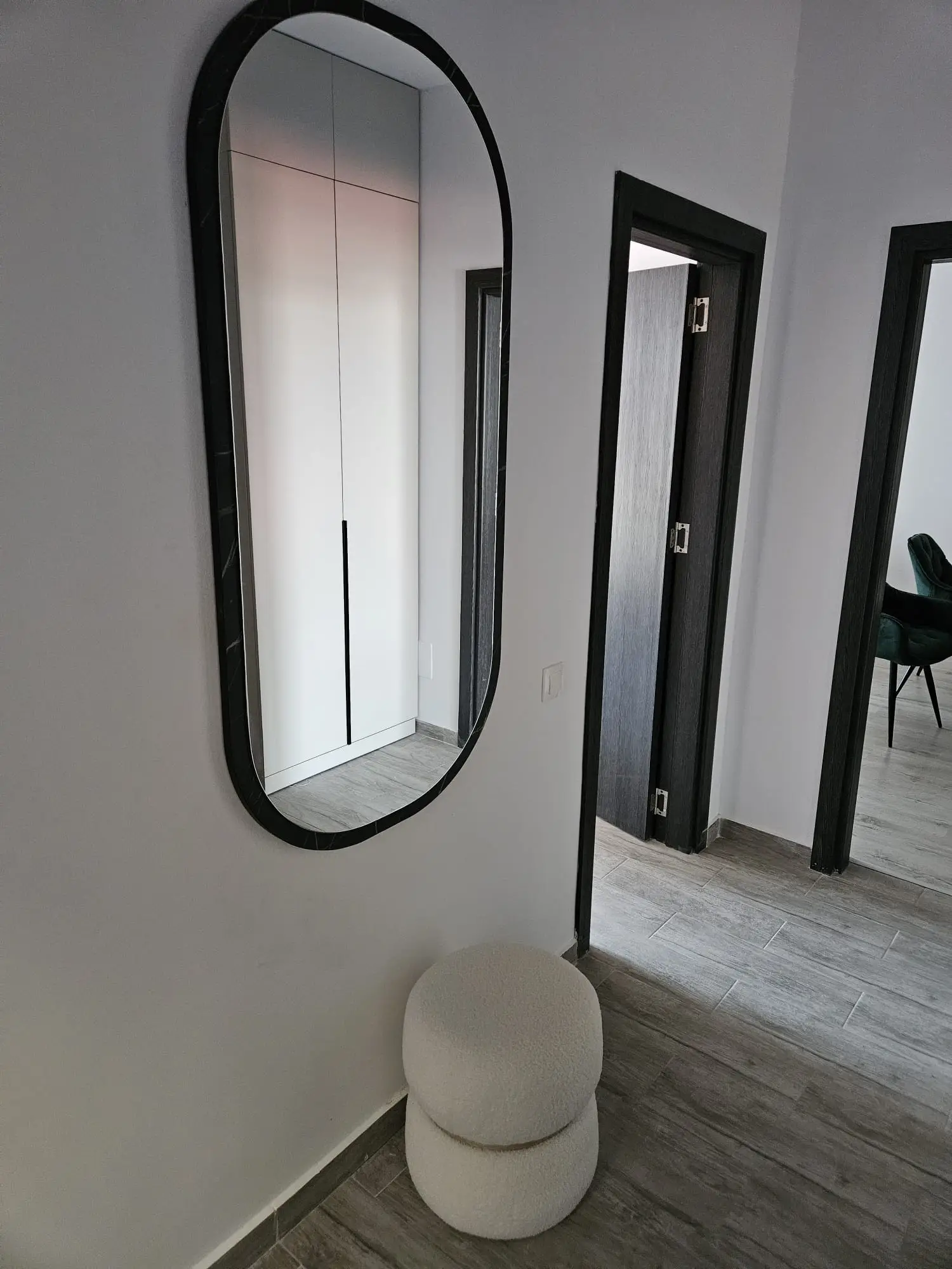 Holul apartamentului este conceput pentru a impresiona de la prima vedere, îmbinând funcționalitatea cu un stil sofisticat. Dressingul încorporat, realizat cu finisaje mate și balamale Blum, oferă un spațiu generos de depozitare, păstrând în același timp un design minimalist. Oglinda ovală cu ramă neagră, poziționată strategic, creează iluzia unui spațiu mai mare și adaugă profunzime. Taburetul tapițat cu textură boucle și pardoseala cu aspect de piatră naturală completează un decor modern și primitor.
