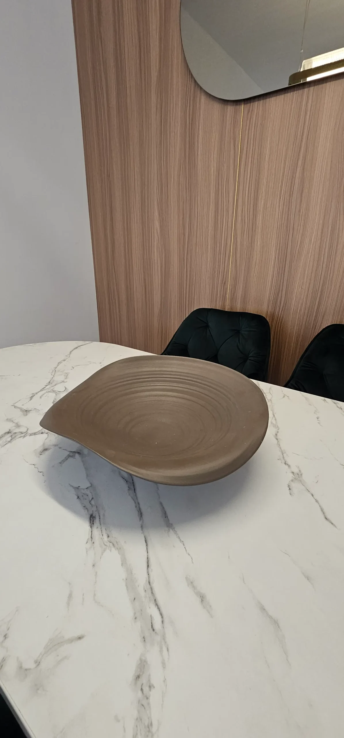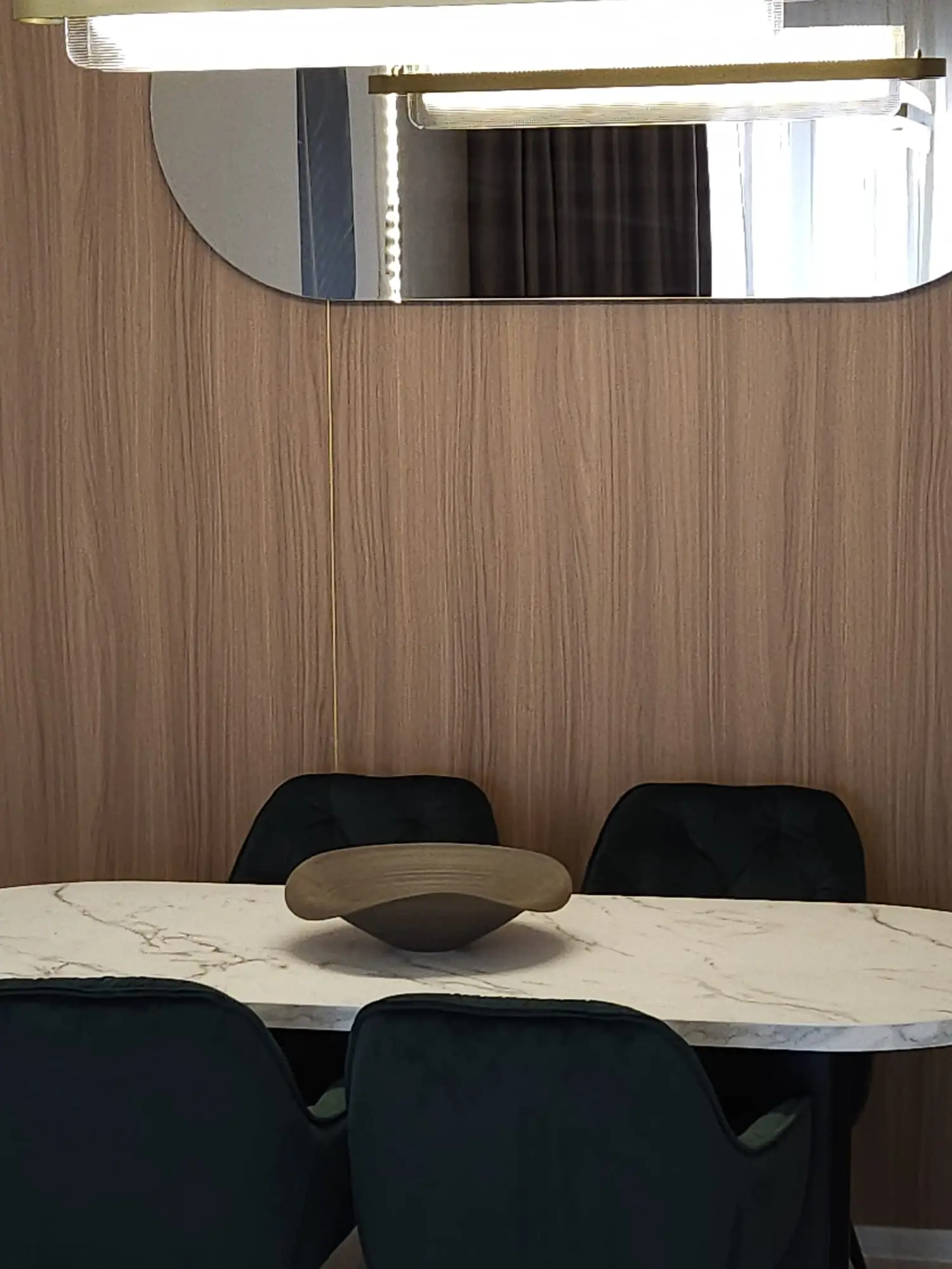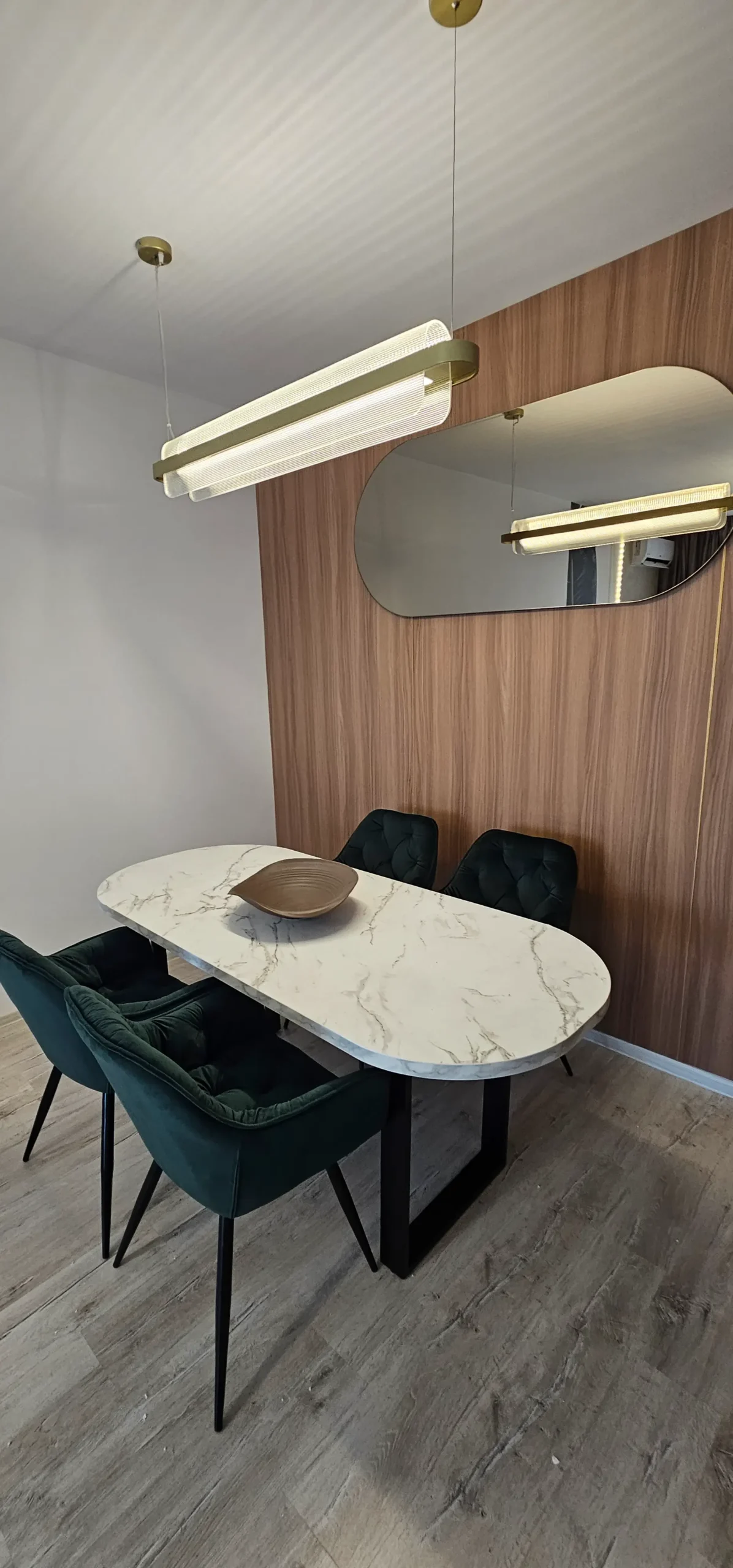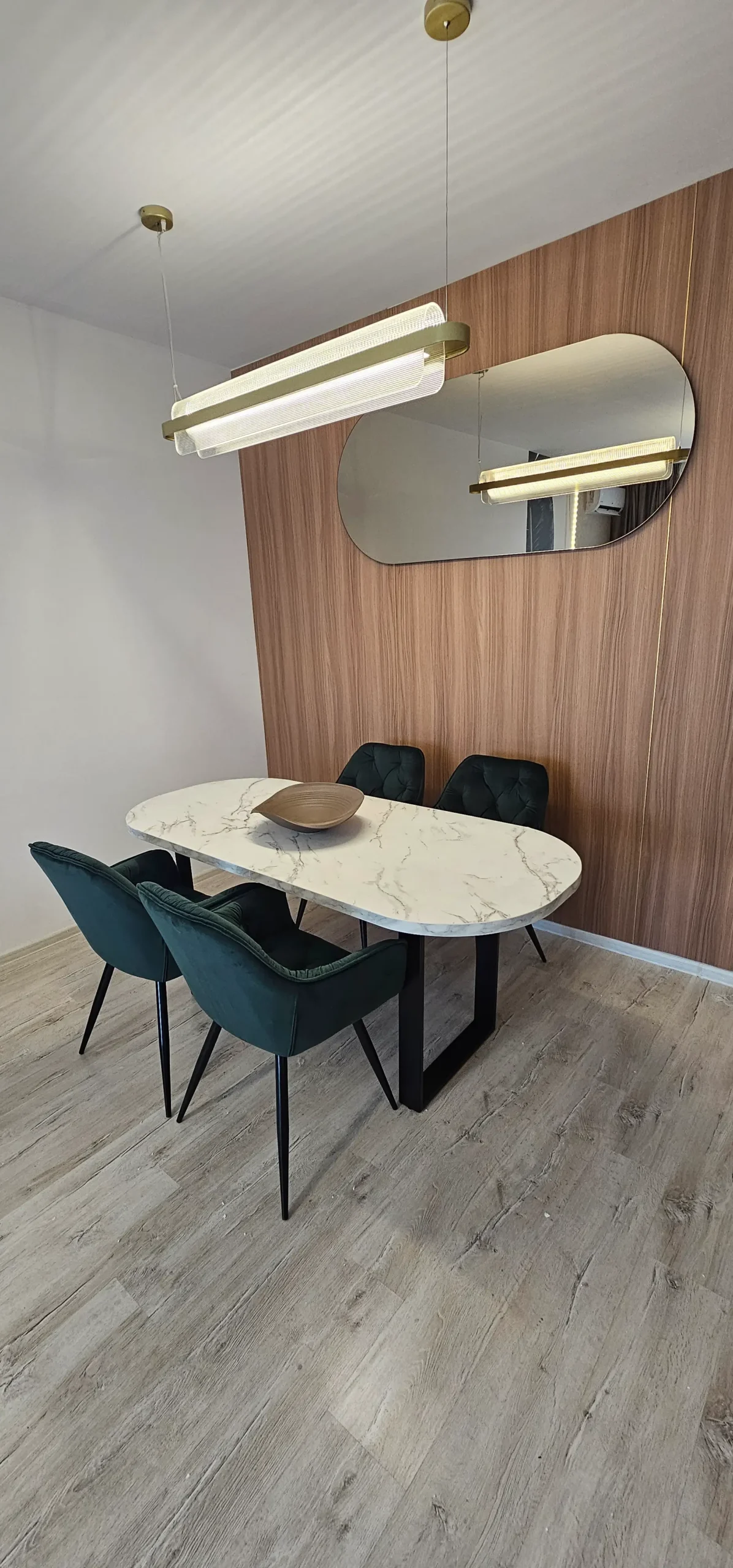 Holul apartamentului este conceput pentru a impresiona de la prima vedere, îmbinând funcționalitatea cu un stil sofisticat. Dressingul încorporat, realizat cu finisaje mate și balamale Blum, oferă un spațiu generos de depozitare, păstrând în același timp un design minimalist. Oglinda ovală cu ramă neagră, poziționată strategic, creează iluzia unui spațiu mai mare și adaugă profunzime. Taburetul tapițat cu textură boucle și pardoseala cu aspect de piatră naturală completează un decor modern și primitor.