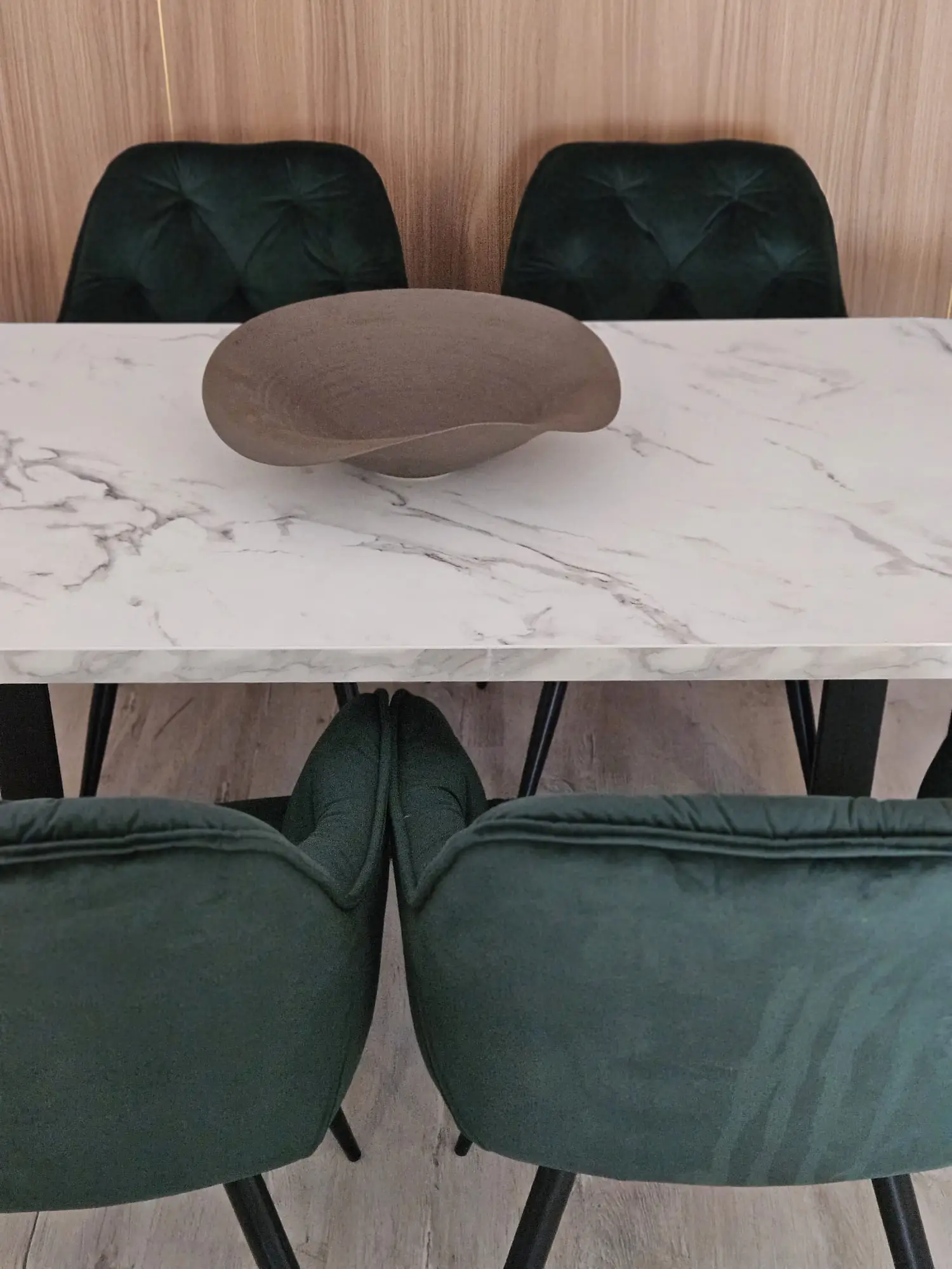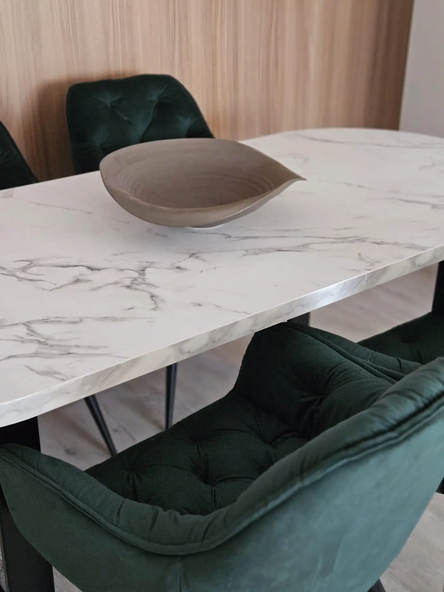 - Noptiere minimaliste, cu accente de lemn și marmură albă, care adaugă un plus de stil.