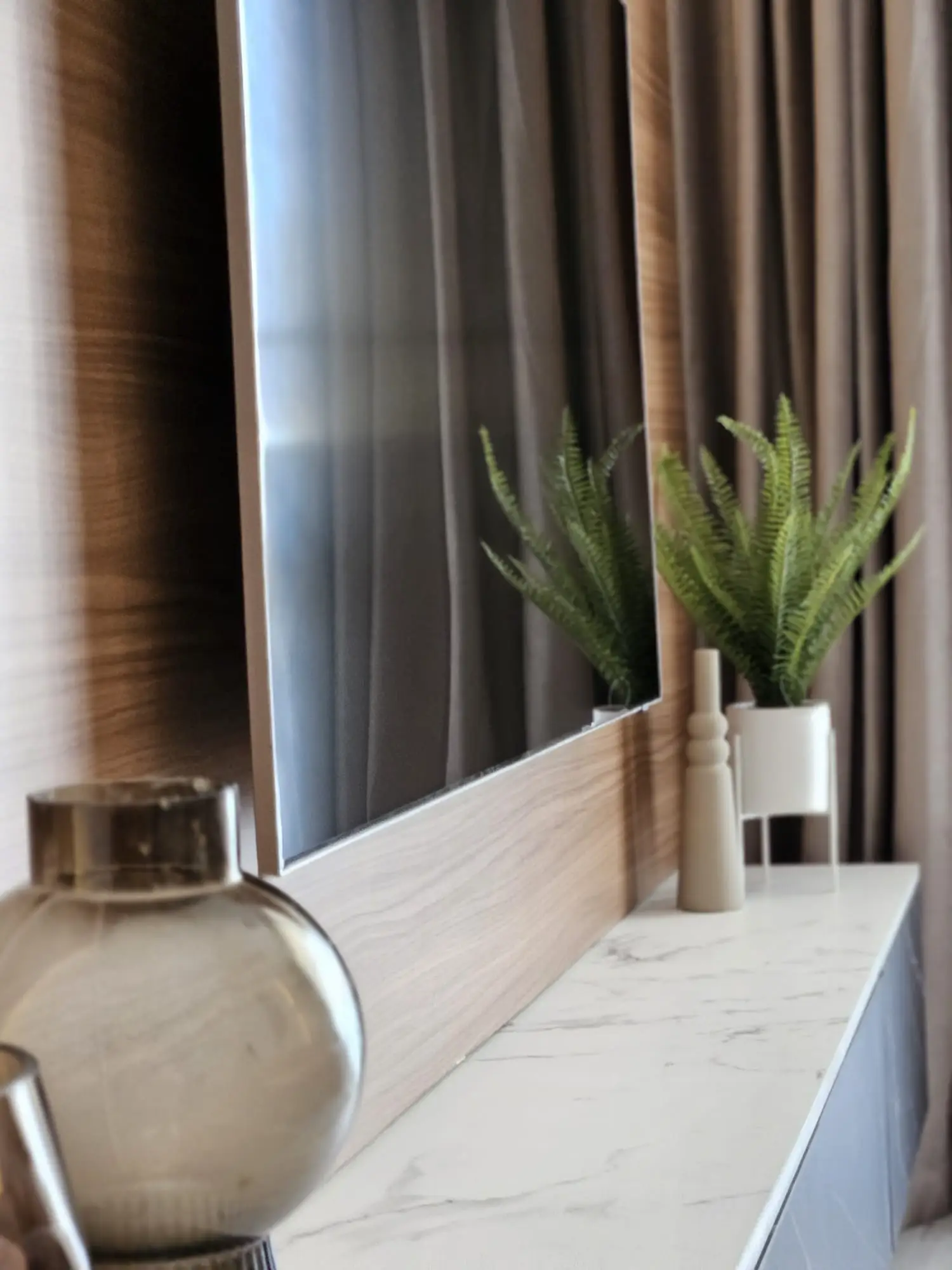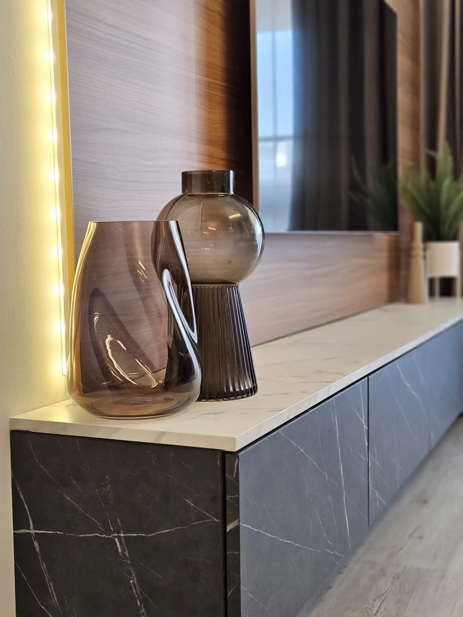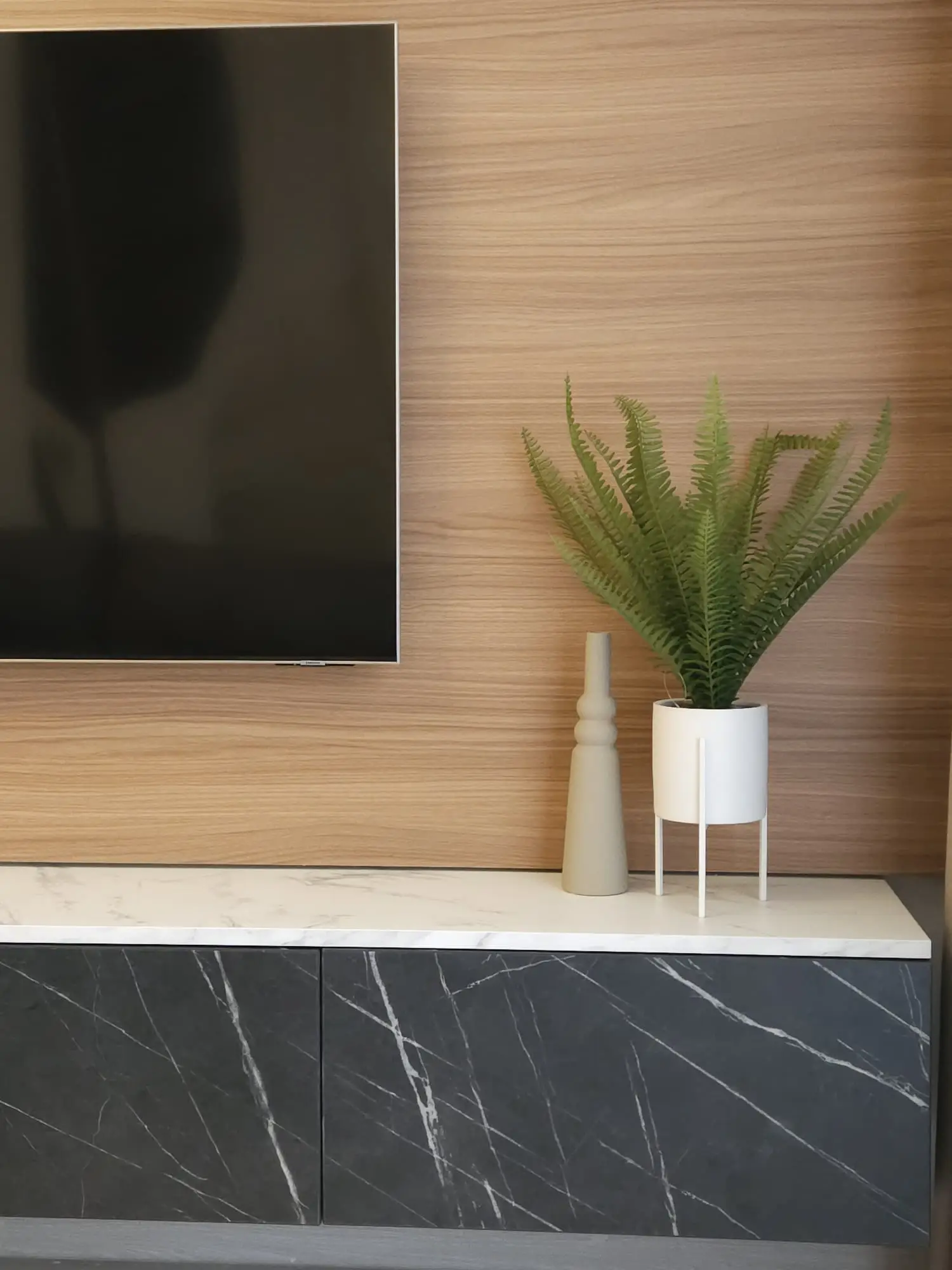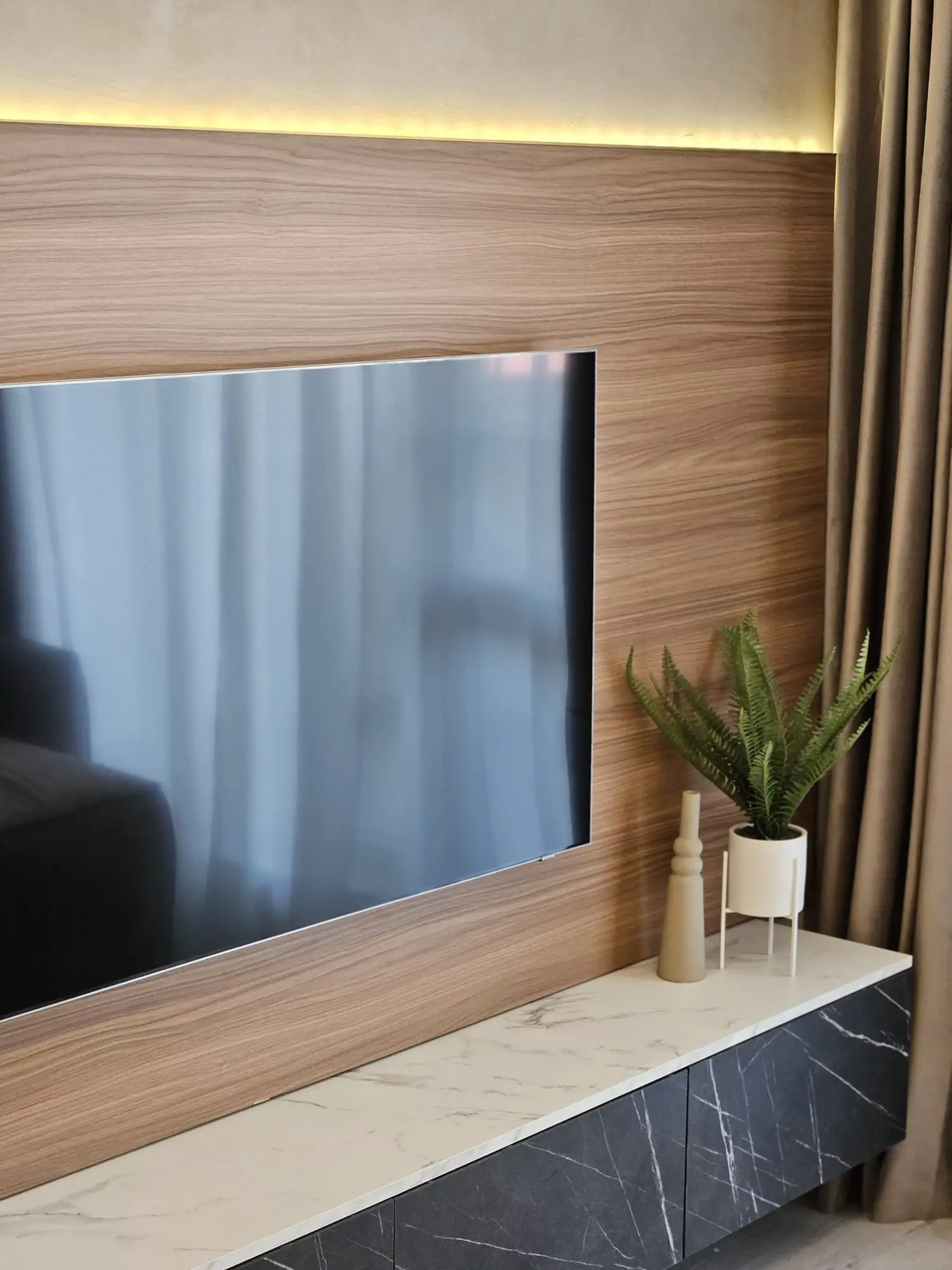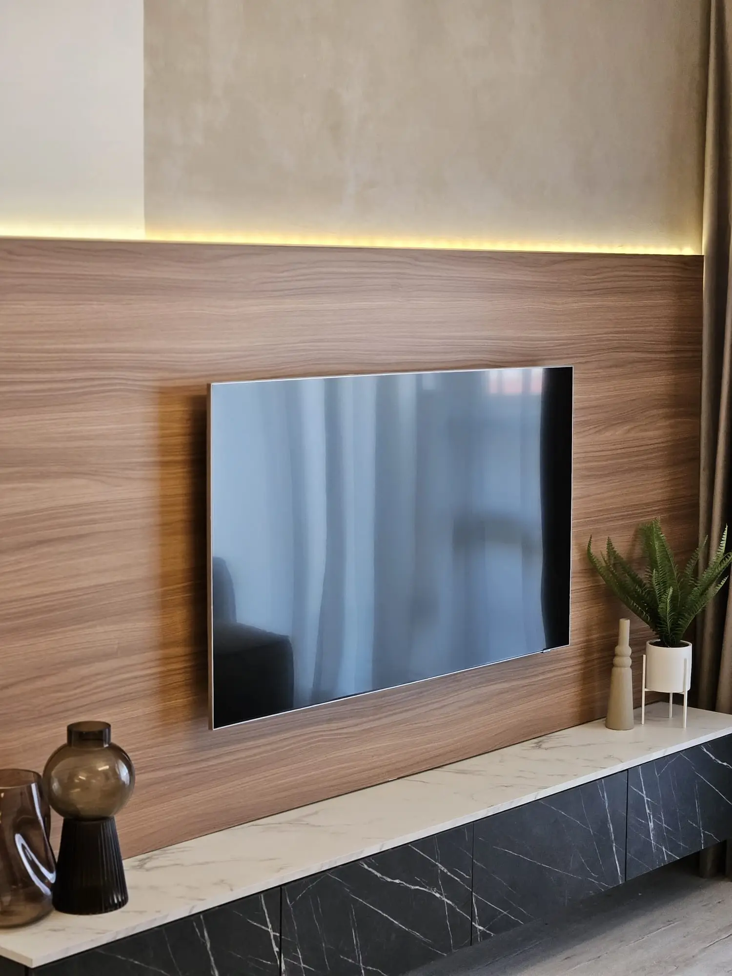 - Corp TV suspendat cu detalii elegante de lemn și marmură, un element statement cu funcționalitate integrată.