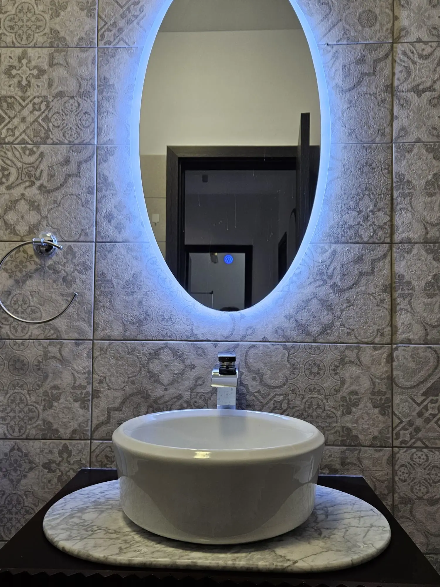 - Oglindă ovală cu iluminare LED, oferind un ambient relaxant și sofisticat.