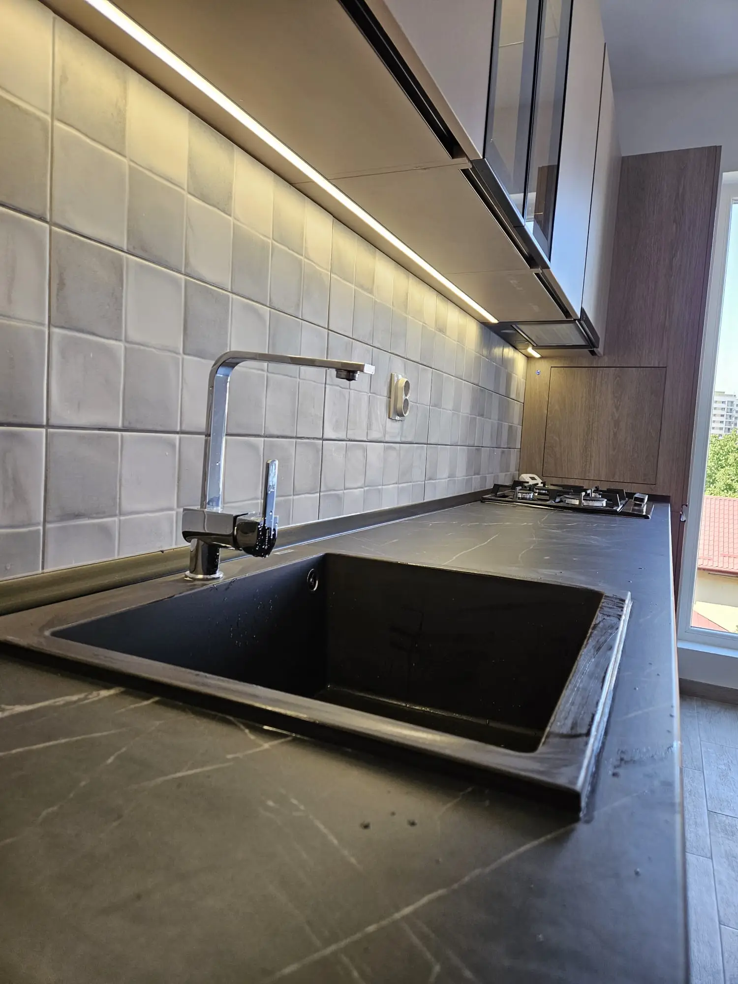 - Blatul și contrablatul din quartz negru cu vinișoare subtile adaugă un aer sofisticat.