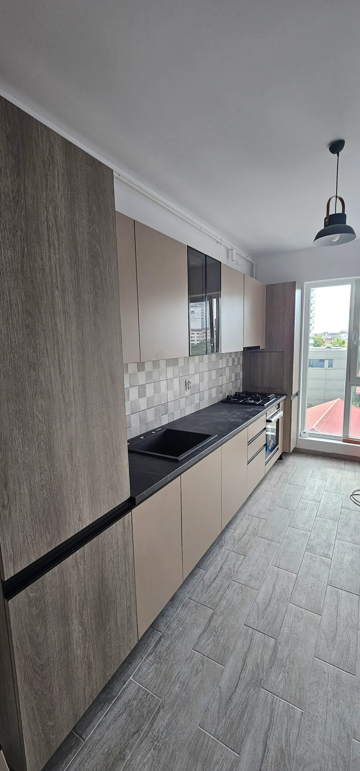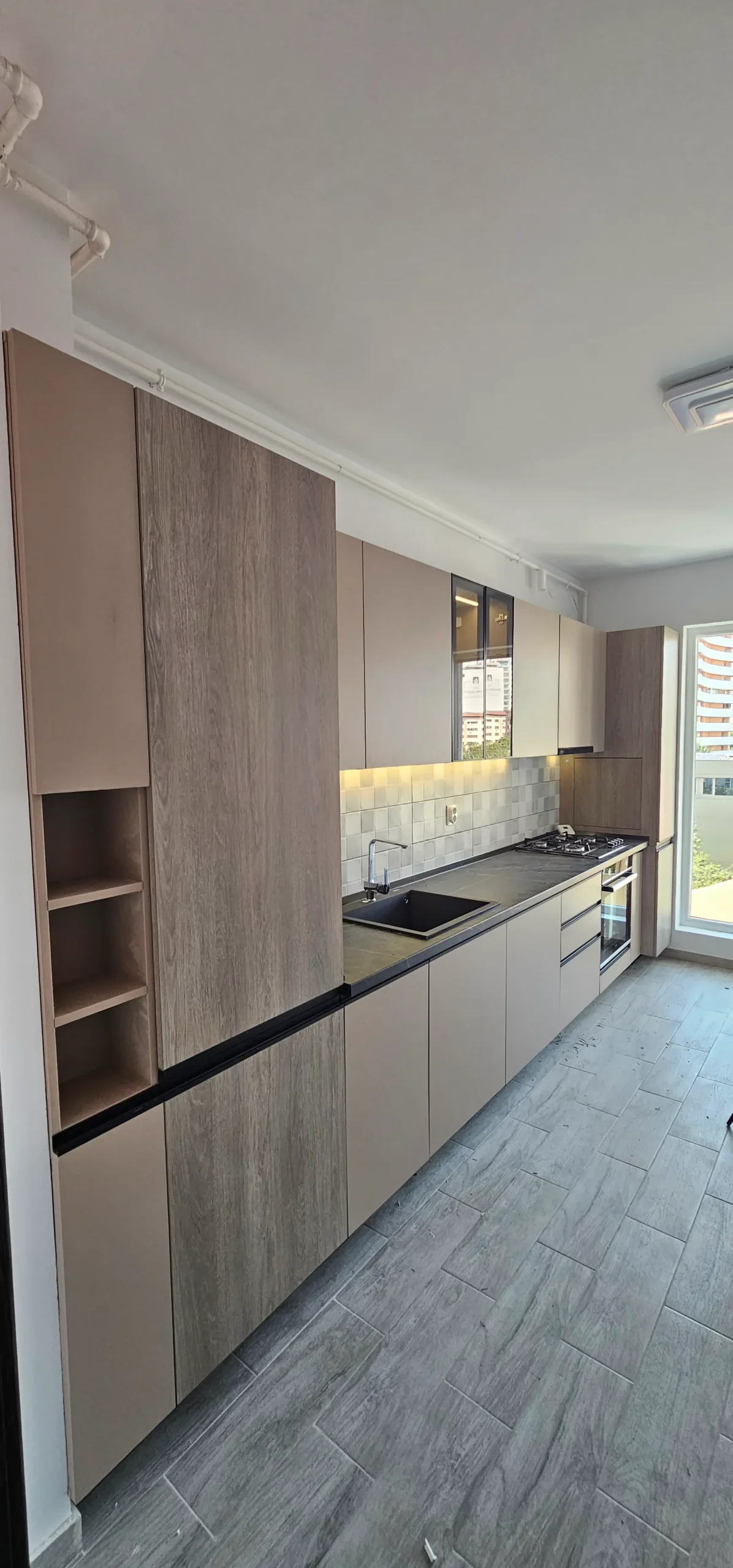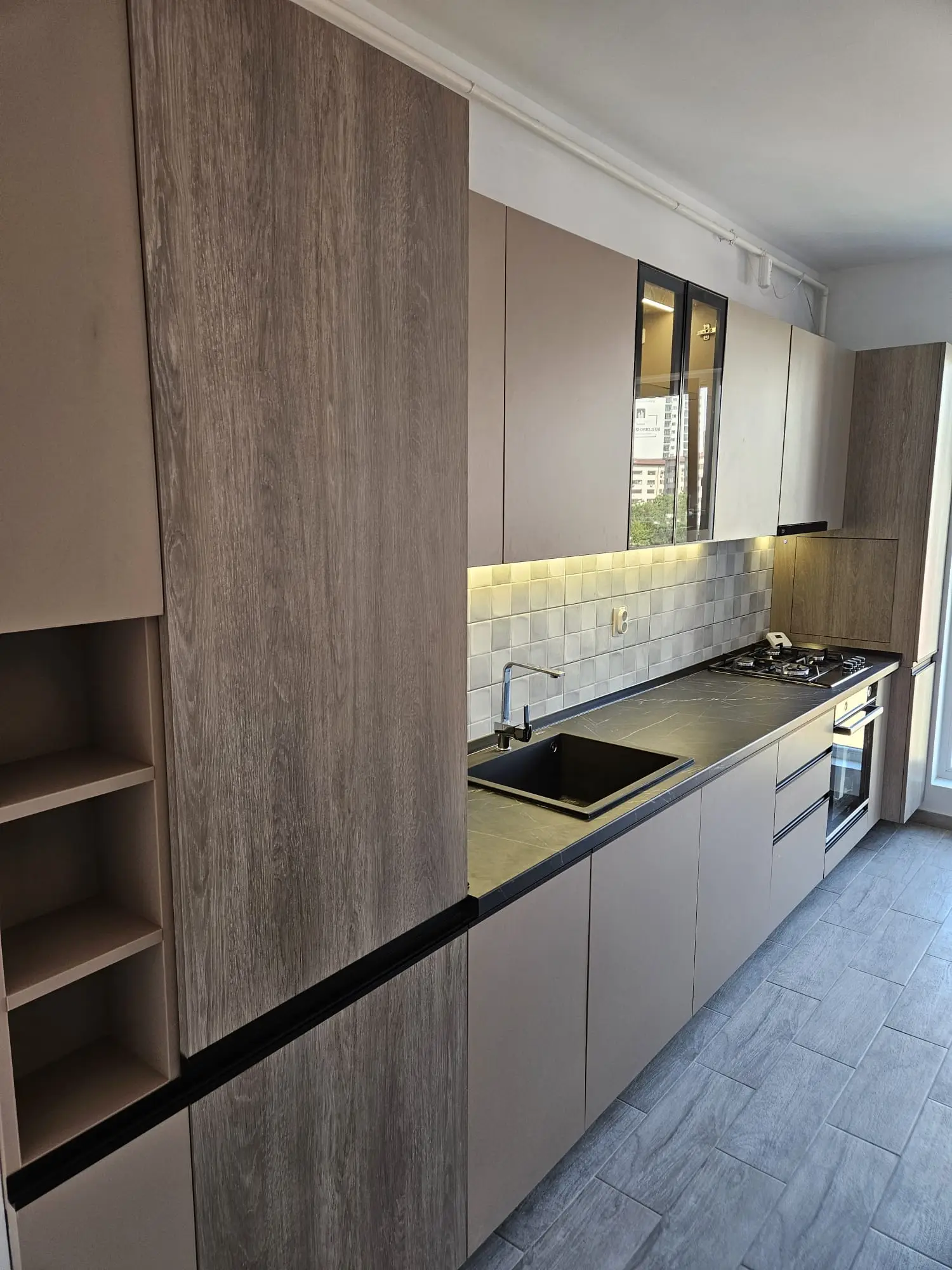 Bucătăria open-space este un exemplu de eleganță și eficiență. Mobilierul realizat la comandă de ETREE combină suprafețe mate și texturi de lemn, integrându-se perfect într-un design modern.