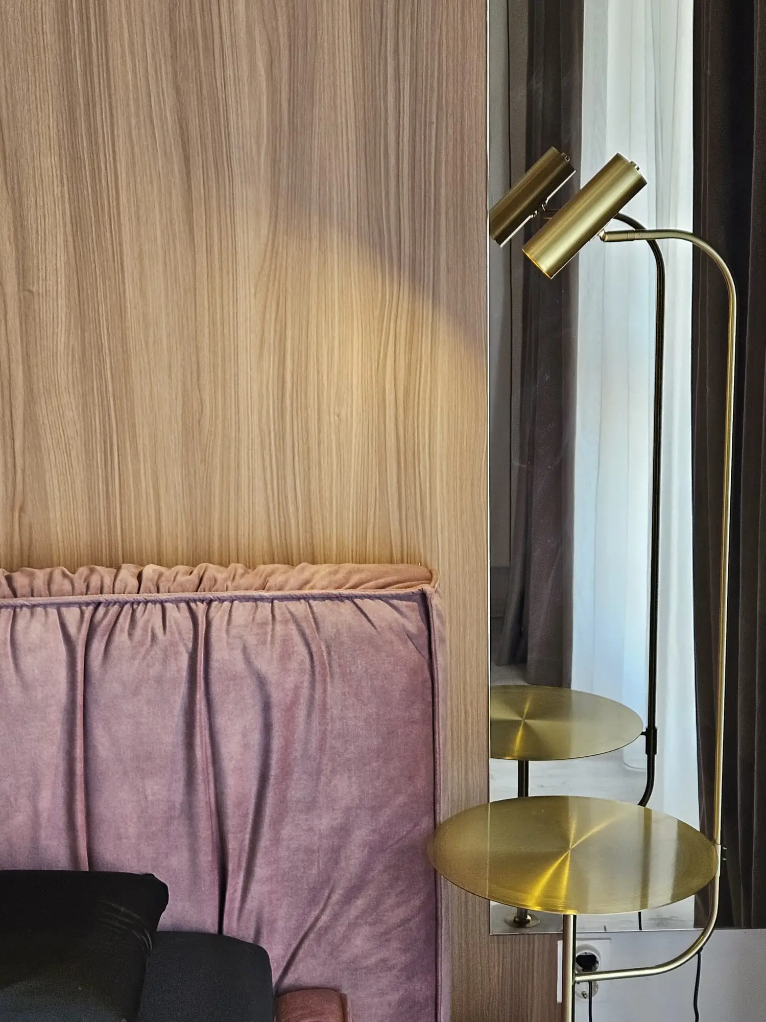 - Lămpi de perete aurii, ce creează un iluminat ambiental perfect pentru serile de relaxare.