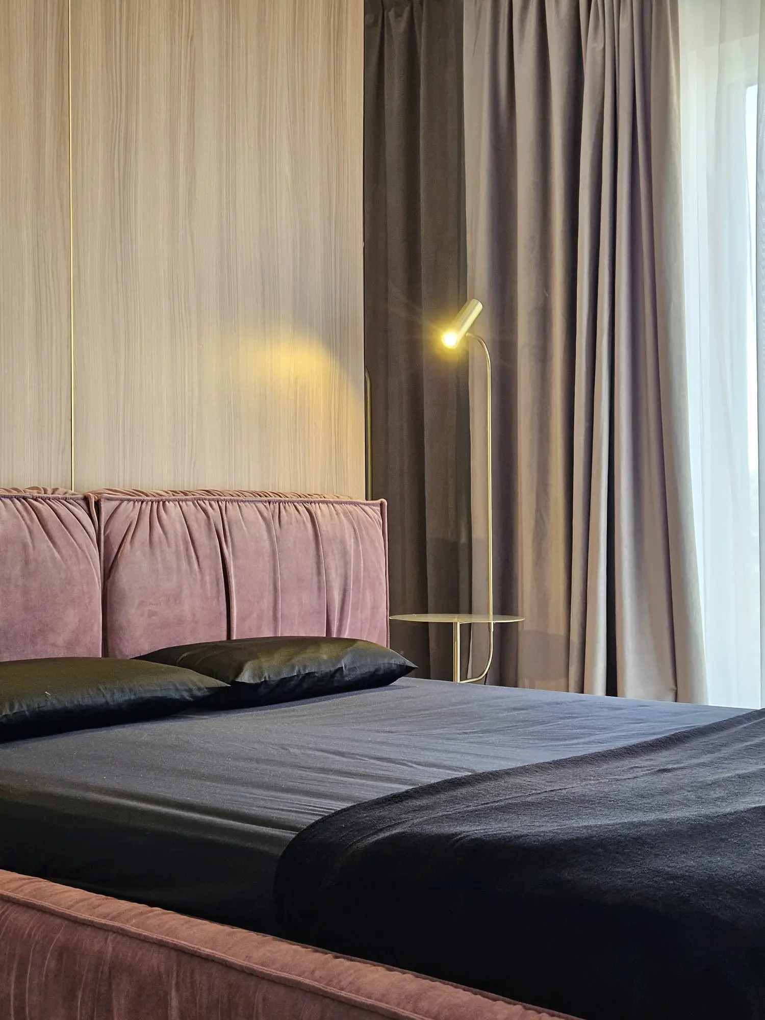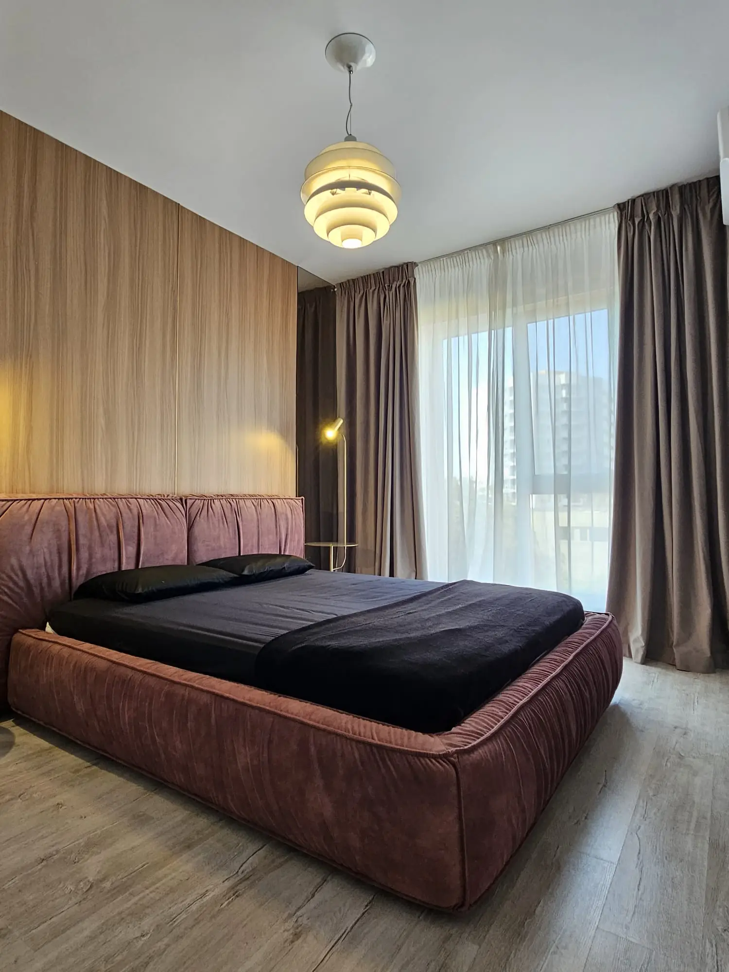 Dormitorul este proiectat pentru a oferi o atmosferă relaxantă și sofisticată, îmbinând materiale premium cu soluții de depozitare eficiente.