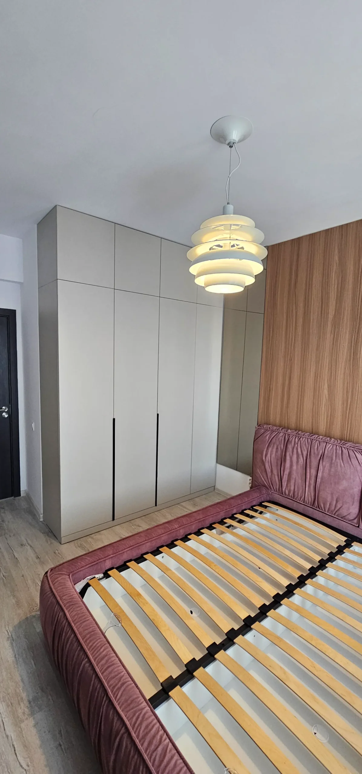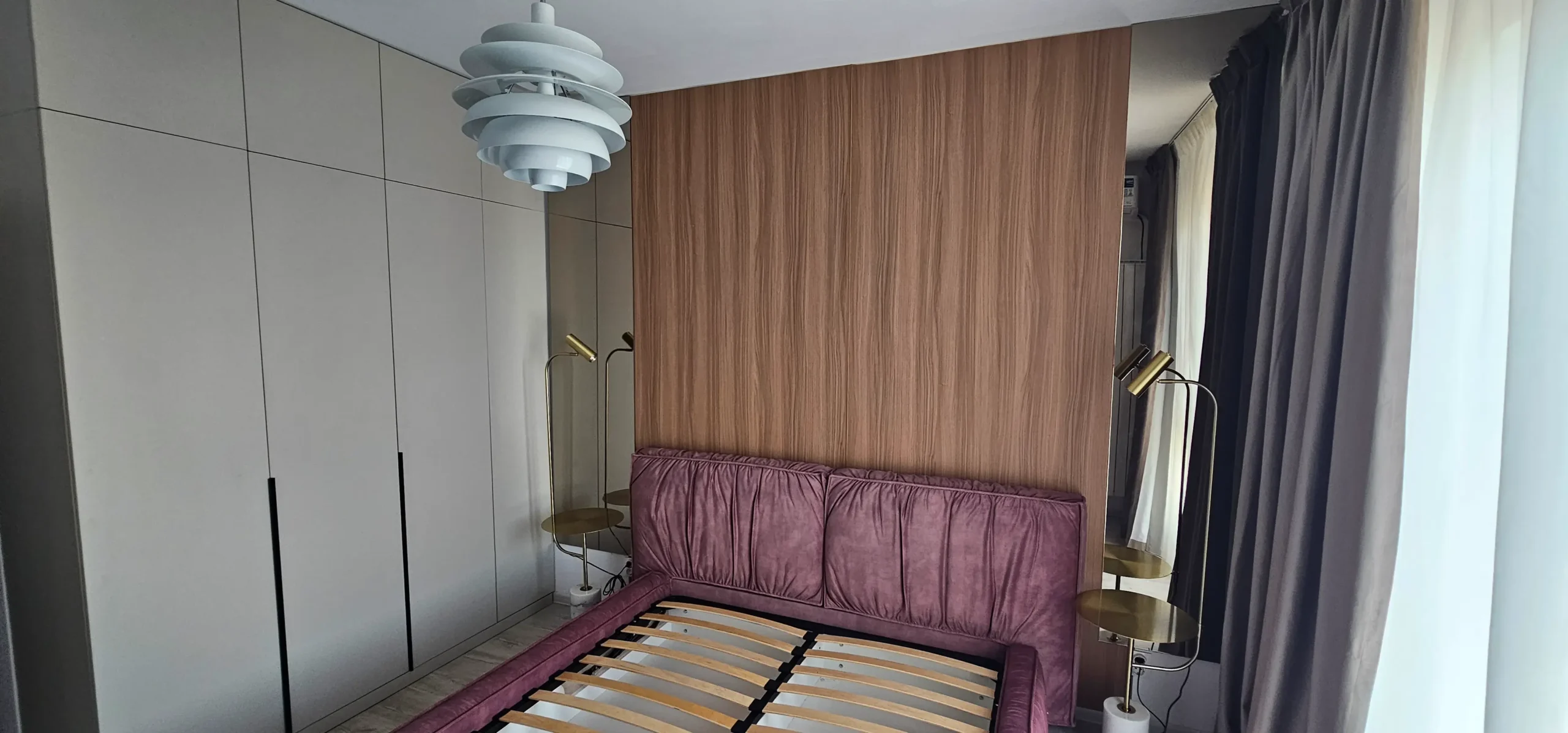 - Placare decorativă din lemn pe peretele din spatele patului, aducând căldură și textură camerei.