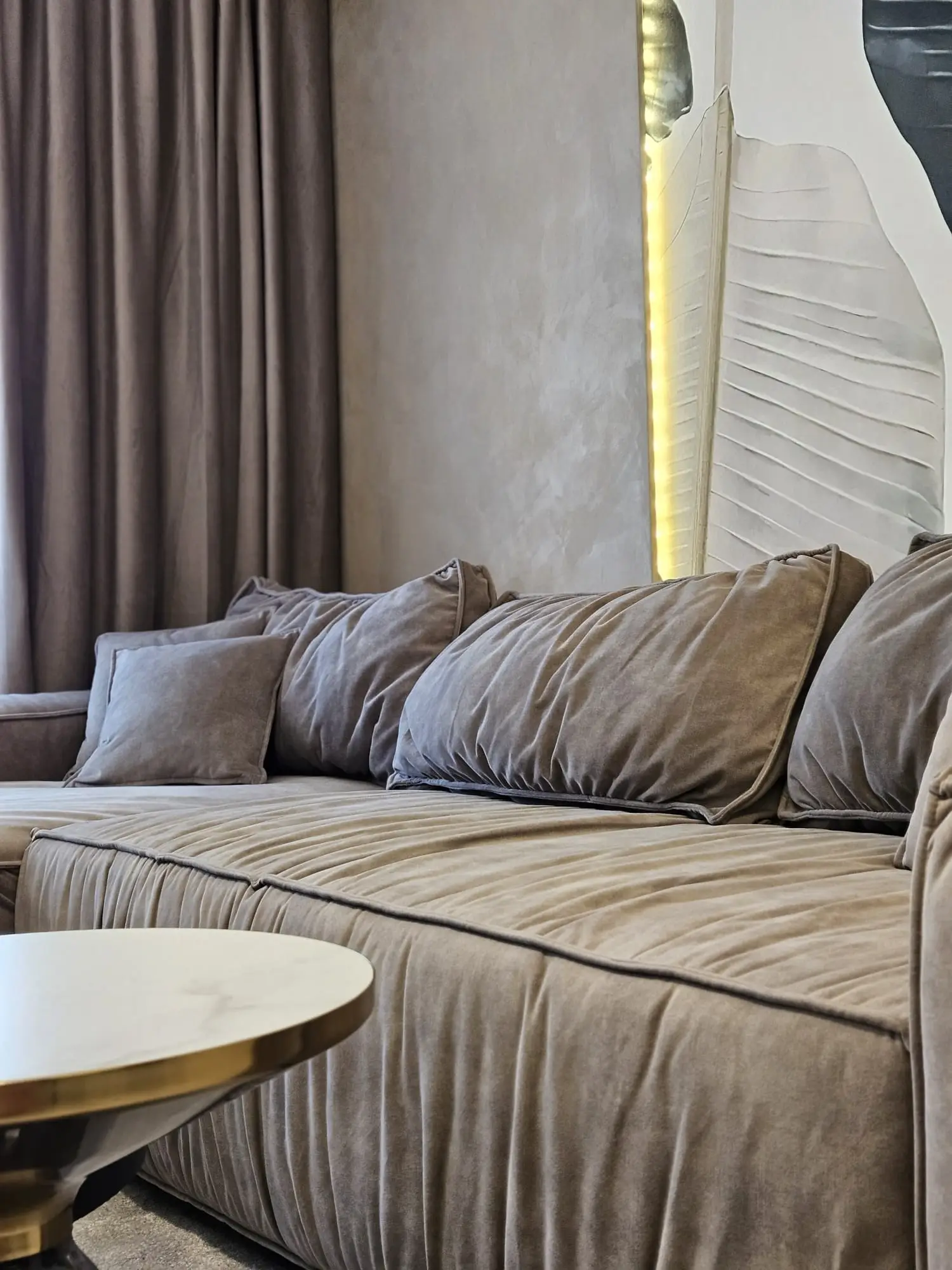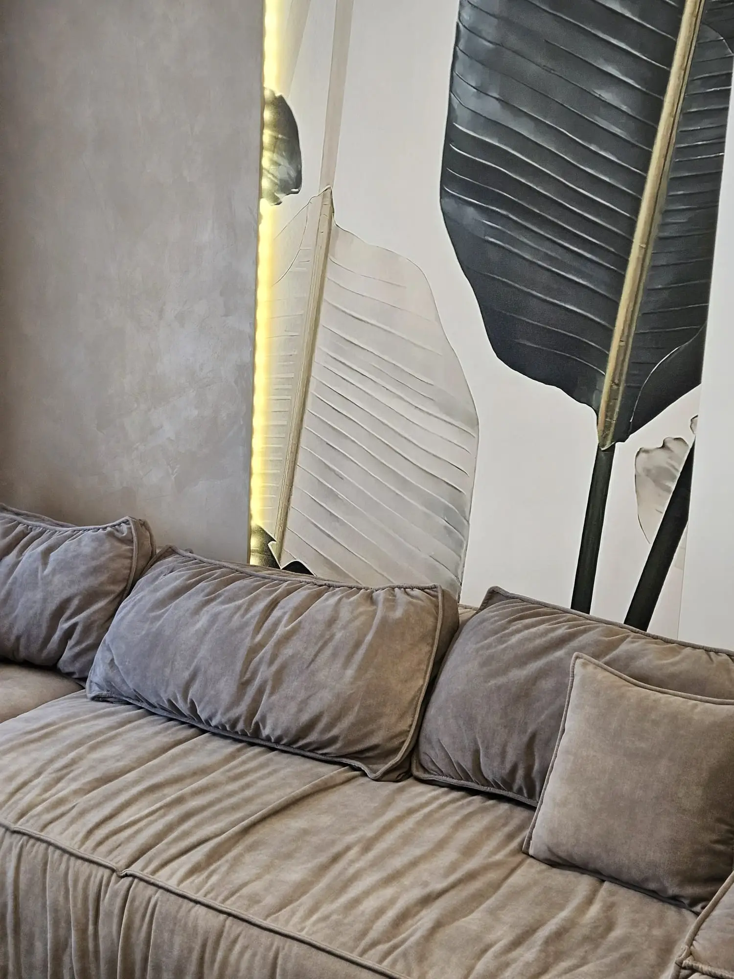 - Pereții decorați cu tencuială decorativă și iluminare LED ascunsă, ce adaugă adâncime și o atmosferă caldă.