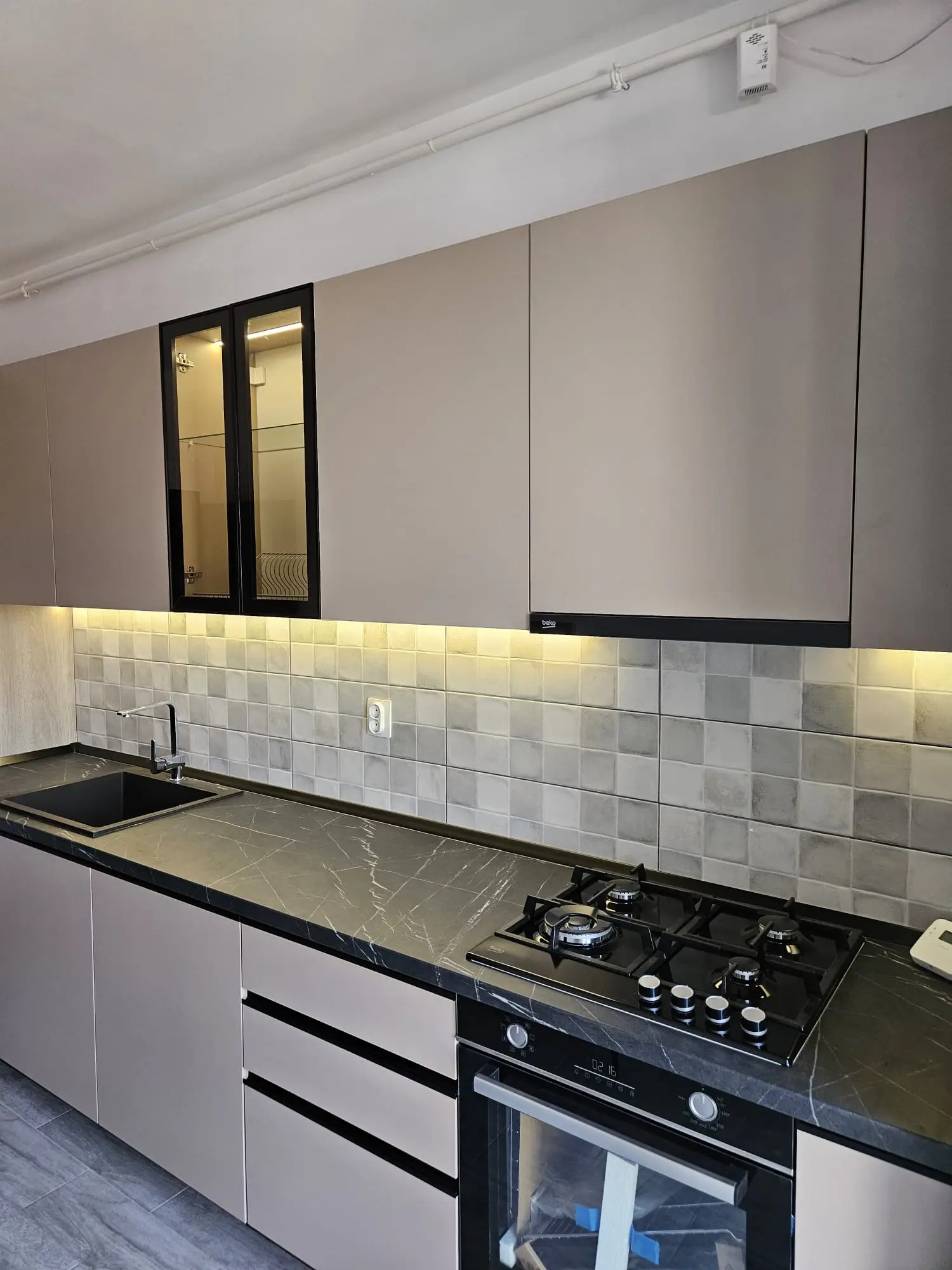 - Electrocasnicele încorporate (cuptor, plită, hotă telescopică) sunt poziționate ergonomic pentru un plus de eficiență.
