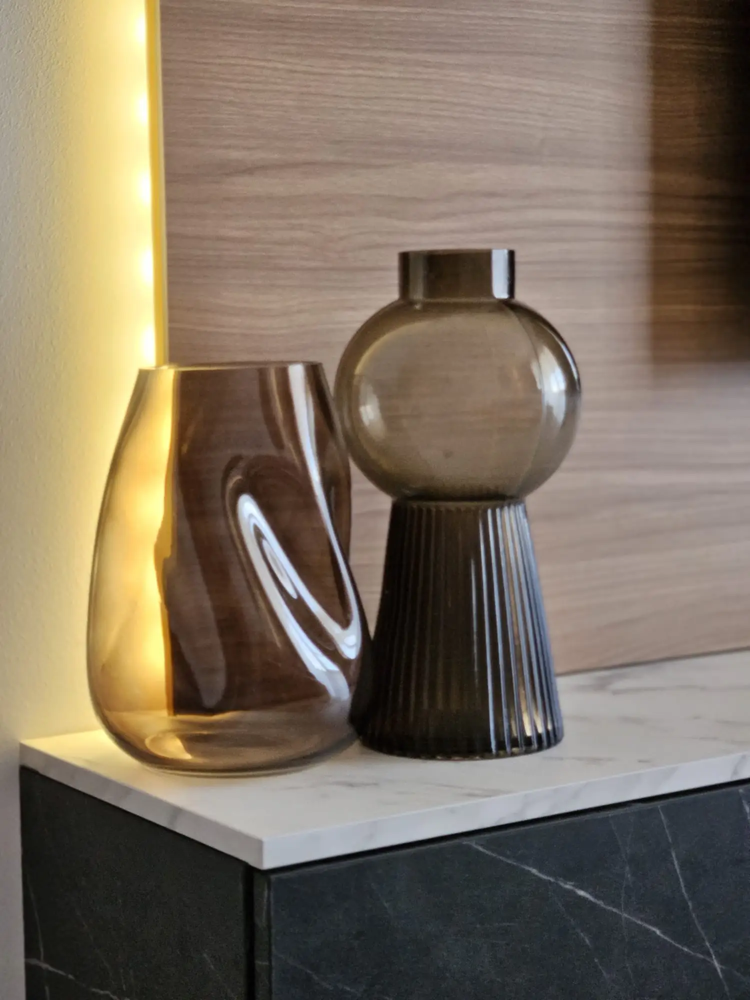 - Măsuțe de cafea cu blat din sticlă fumurie și bază metalică aurie, pentru un contrast sofisticat.