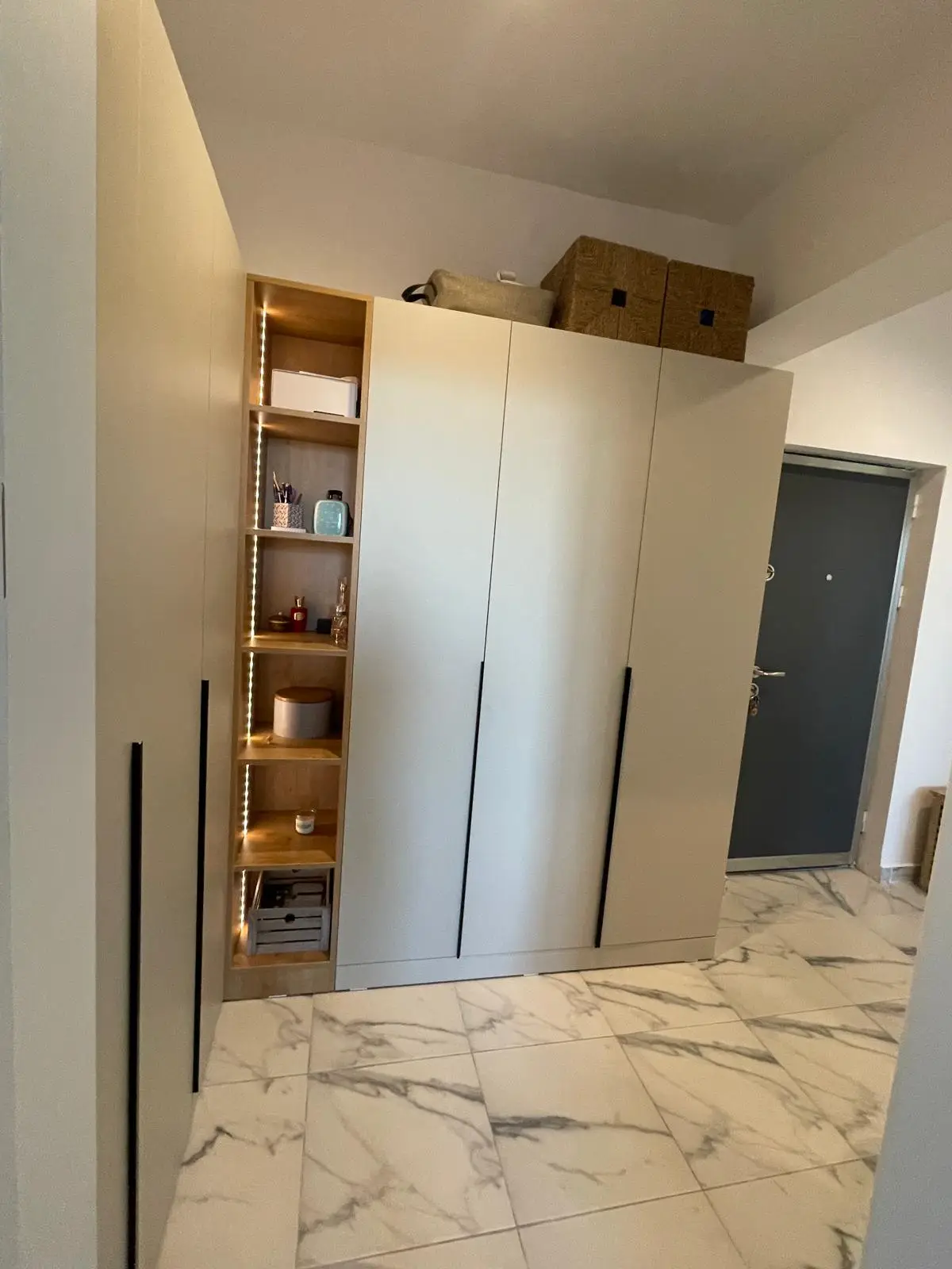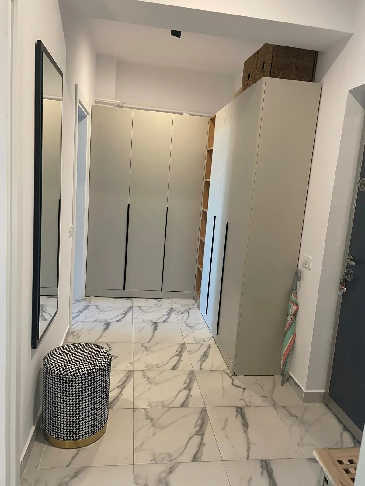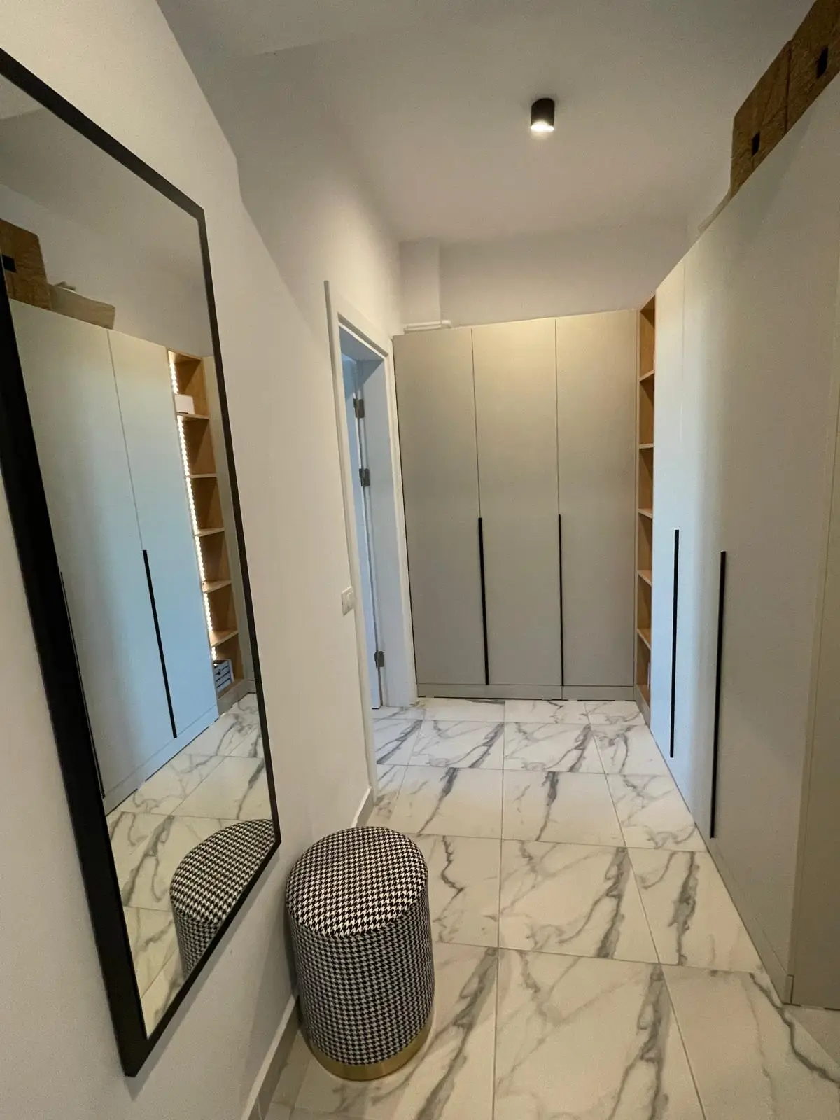 Holul este conceput pentru eficiență maximă, beneficiind de un ansamblu de dulapuri înalte, cu rafturi deschise și iluminare LED integrată. Elementele de design, precum oglinda înaltă cu ramă neagră și taburetul îmbrăcat în material textil elegant, oferă un aer sofisticat și practic. Pardoseala din gresie cu efect de marmură completează armonios designul general al spațiului.