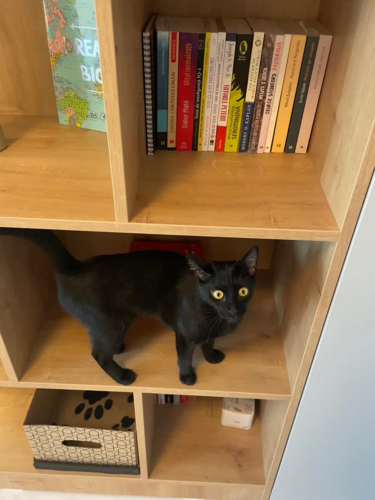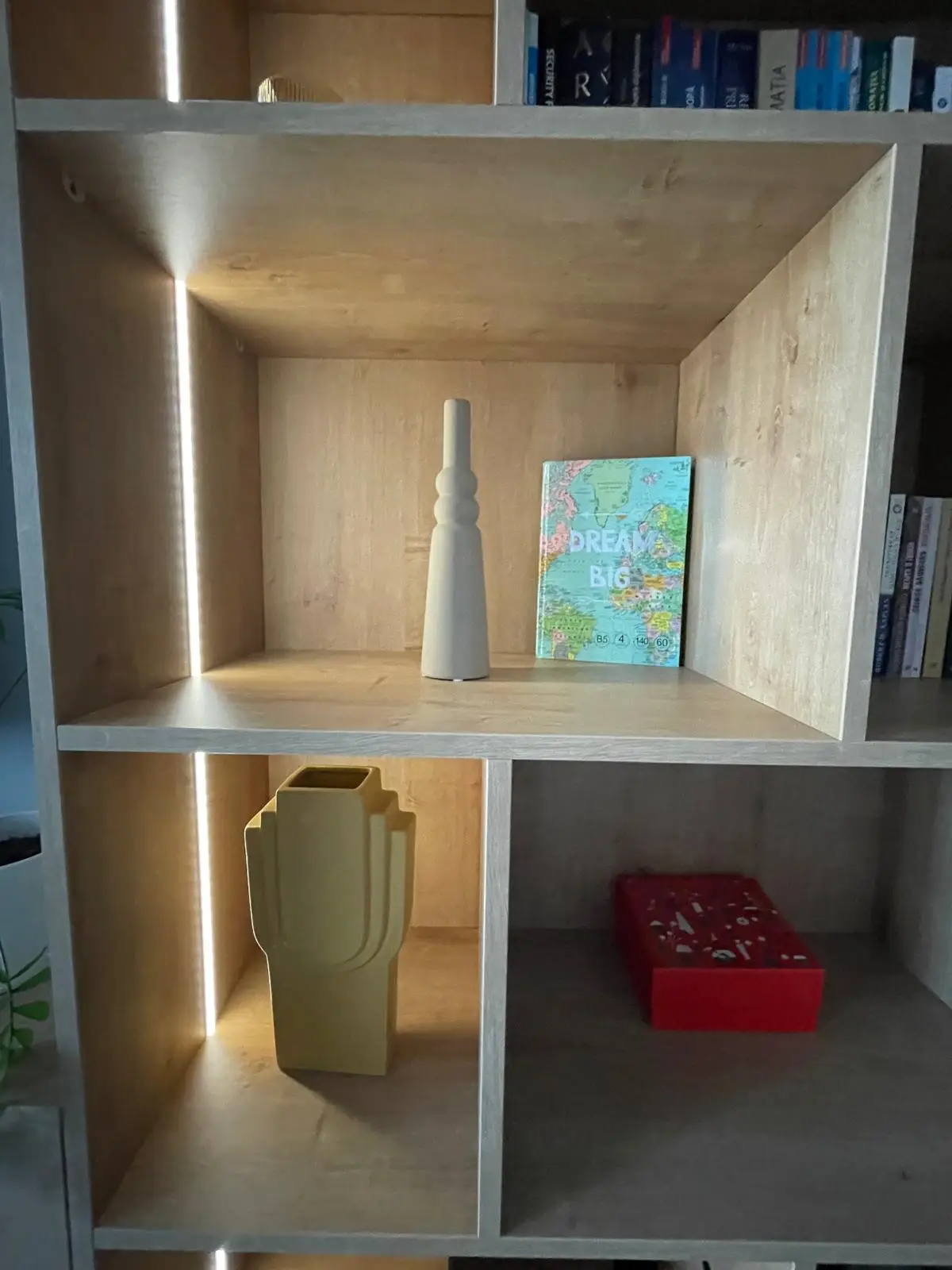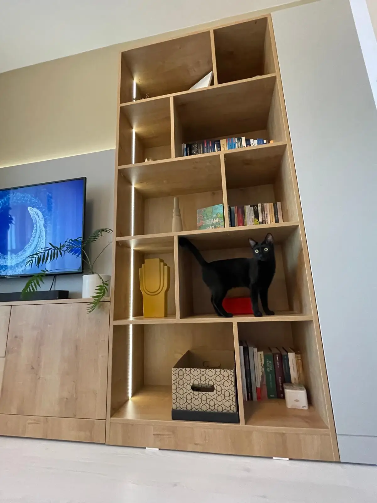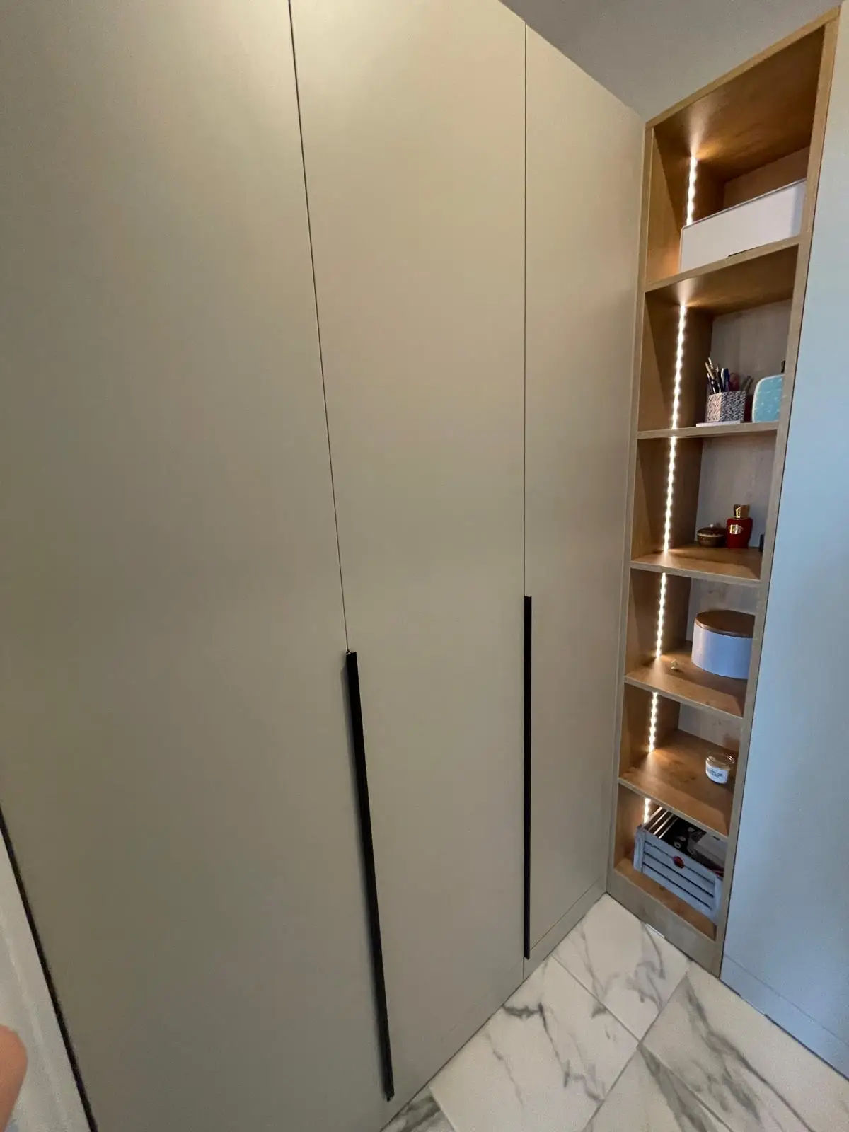 Holul este conceput pentru eficiență maximă, beneficiind de un ansamblu de dulapuri înalte, cu rafturi deschise și iluminare LED integrată. Elementele de design, precum oglinda înaltă cu ramă neagră și taburetul îmbrăcat în material textil elegant, oferă un aer sofisticat și practic. Pardoseala din gresie cu efect de marmură completează armonios designul general al spațiului.