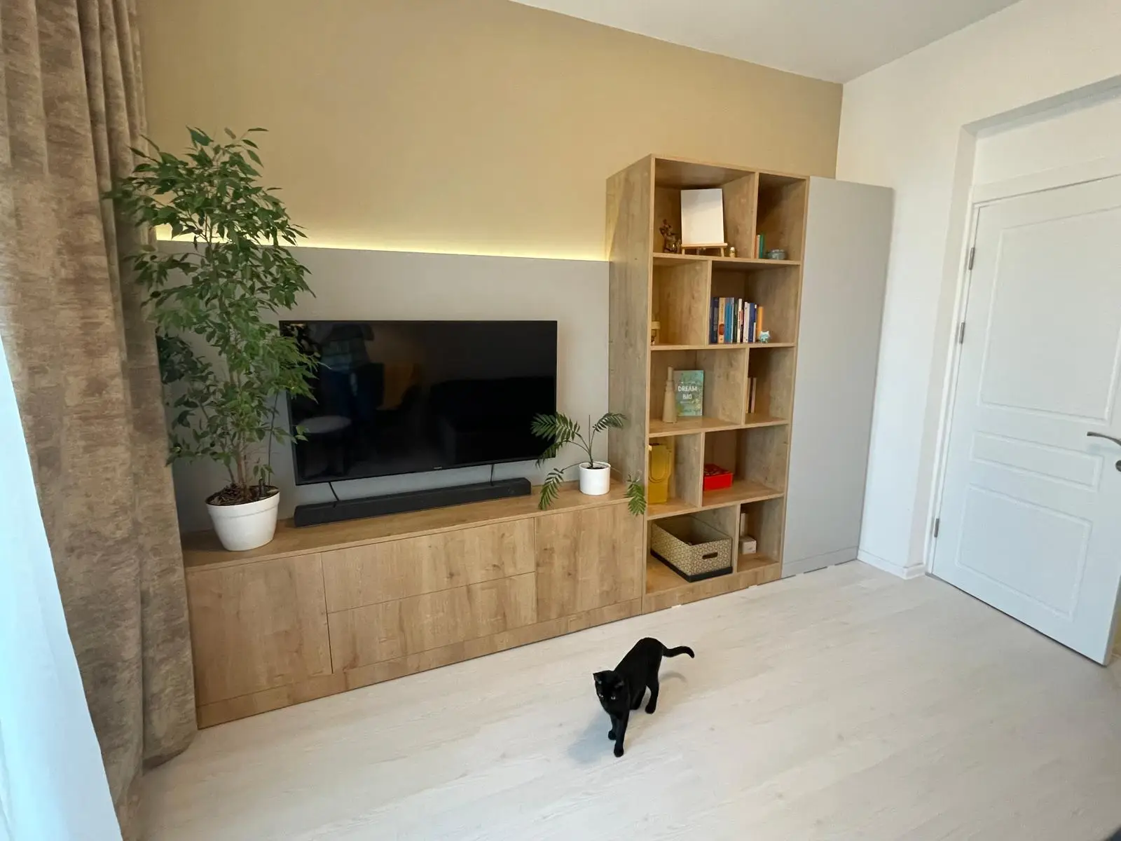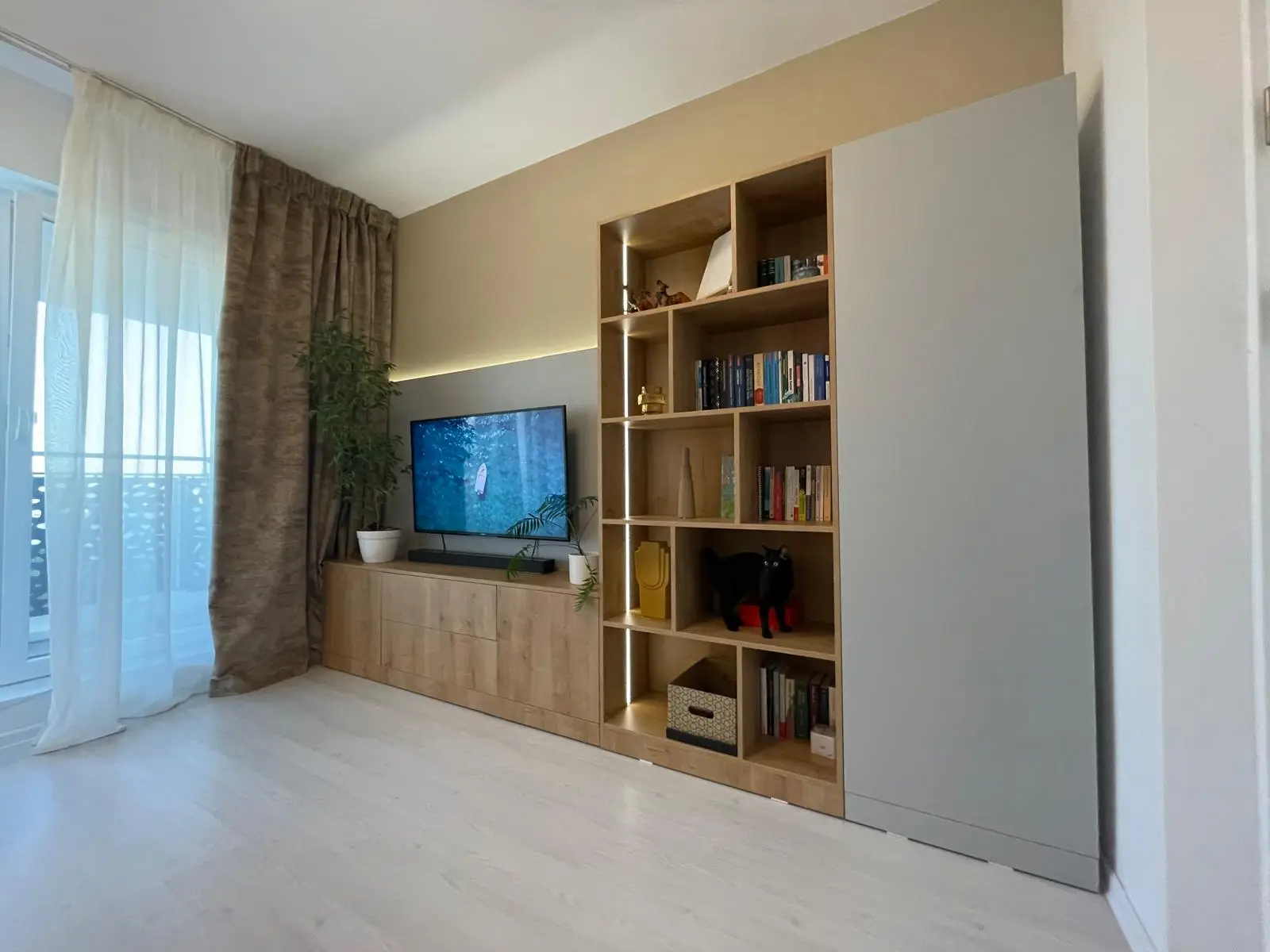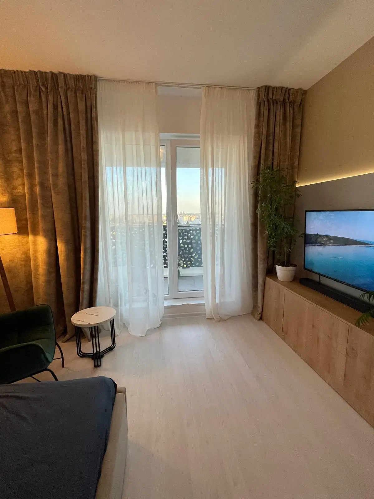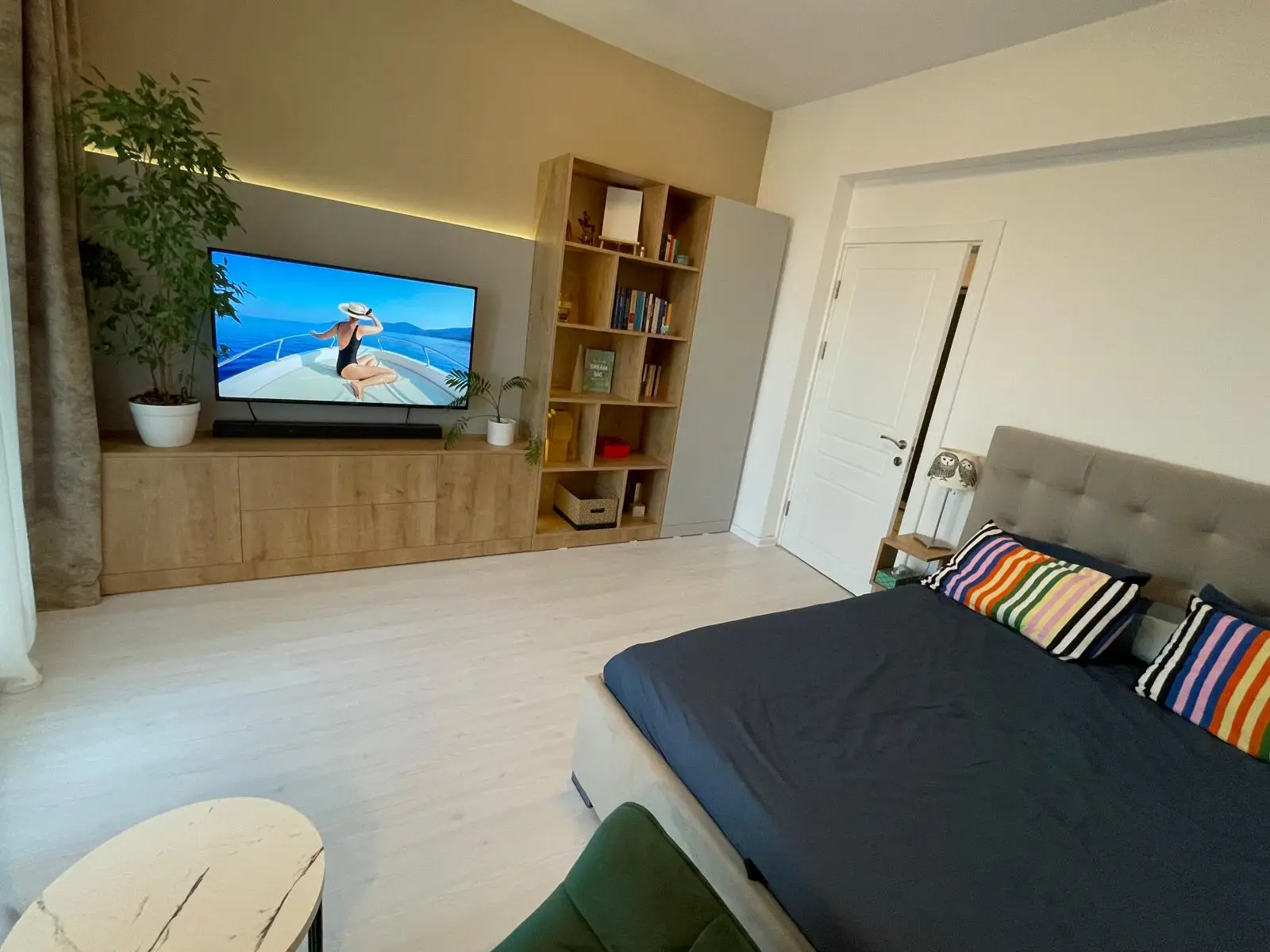 Livingul reprezintă punctul central al apartamentului, fiind amenajat într-un stil modern cu influențe minimaliste. Canapeaua extensibilă de mari dimensiuni, în nuanțe de maro și bej, este punctată de accente elegante precum măsuța de cafea cu blat din marmură și picioare metalice negre. Peretele decorativ din spatele televizorului combină texturi de lemn natural cu benzi LED discrete, oferind un efect vizual spectaculos și un ambient relaxant.