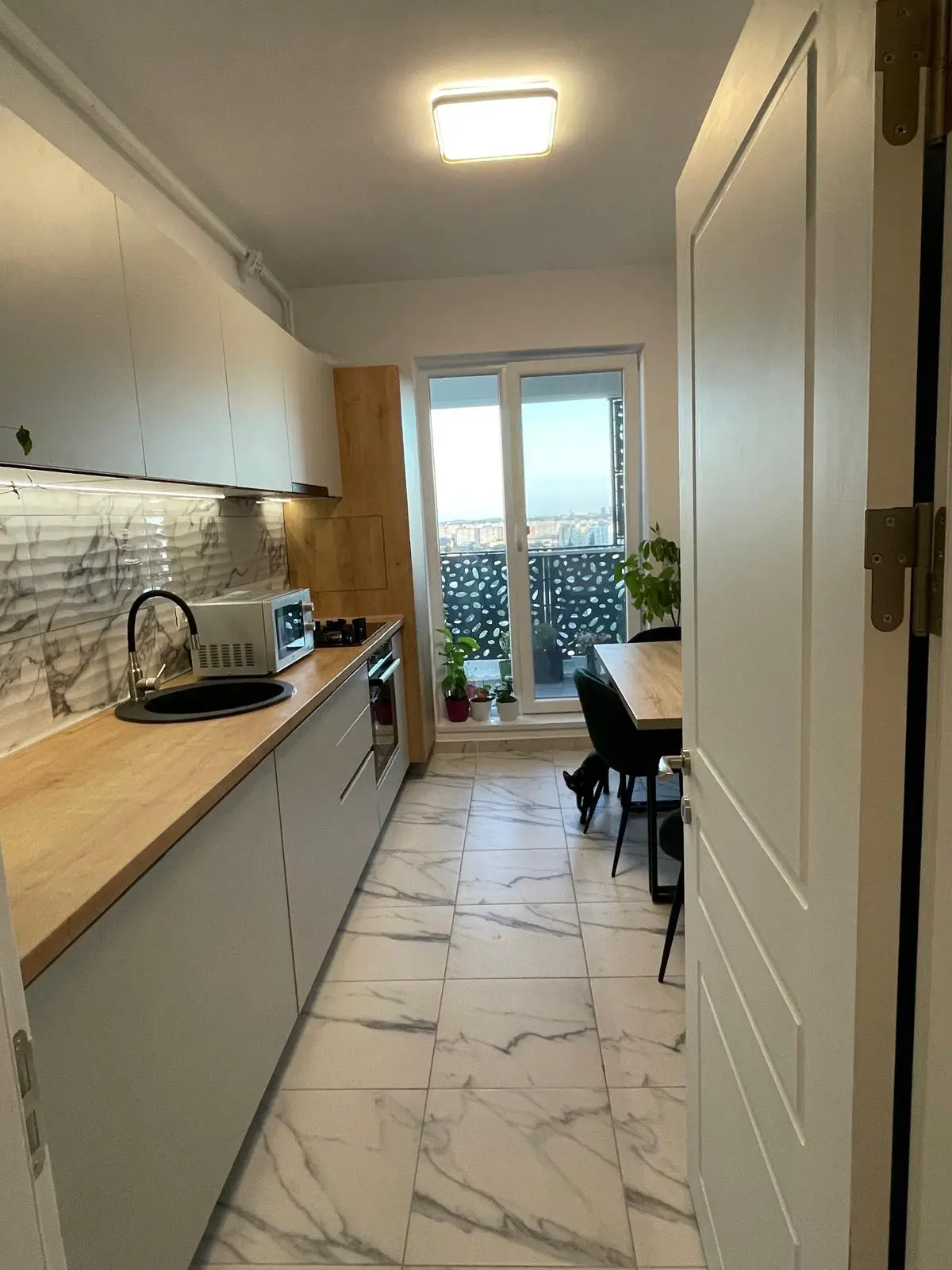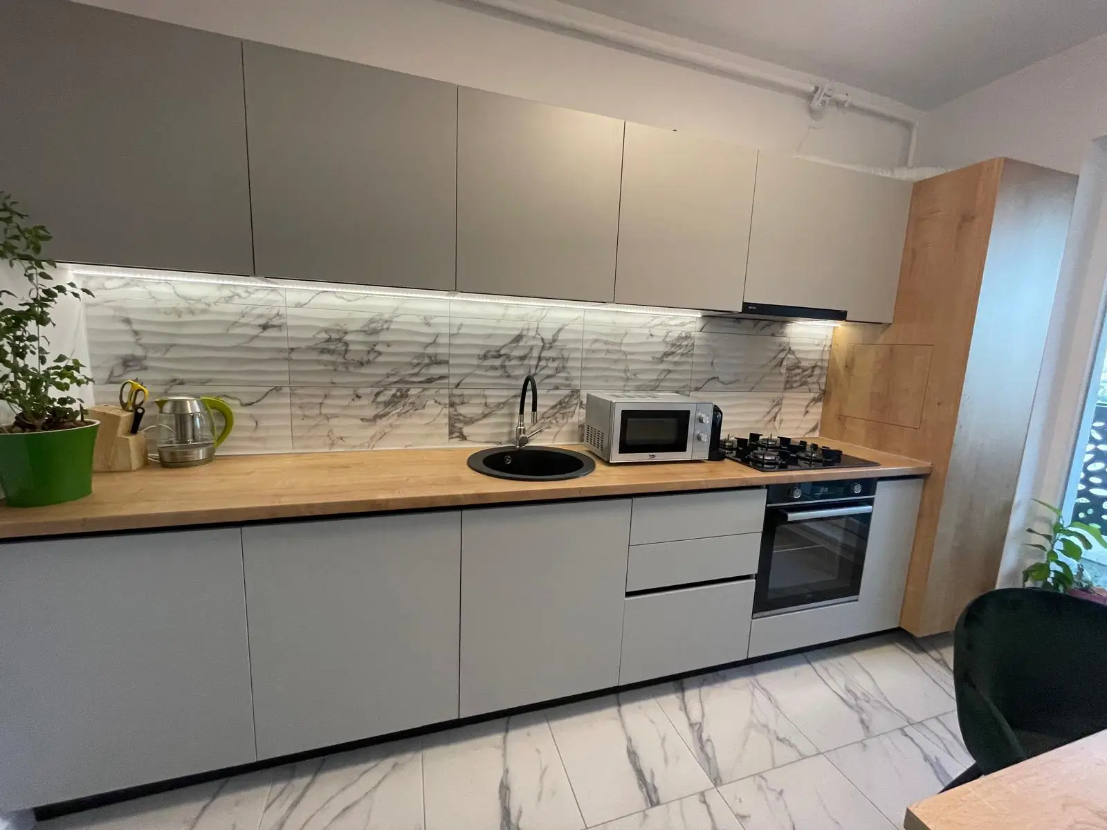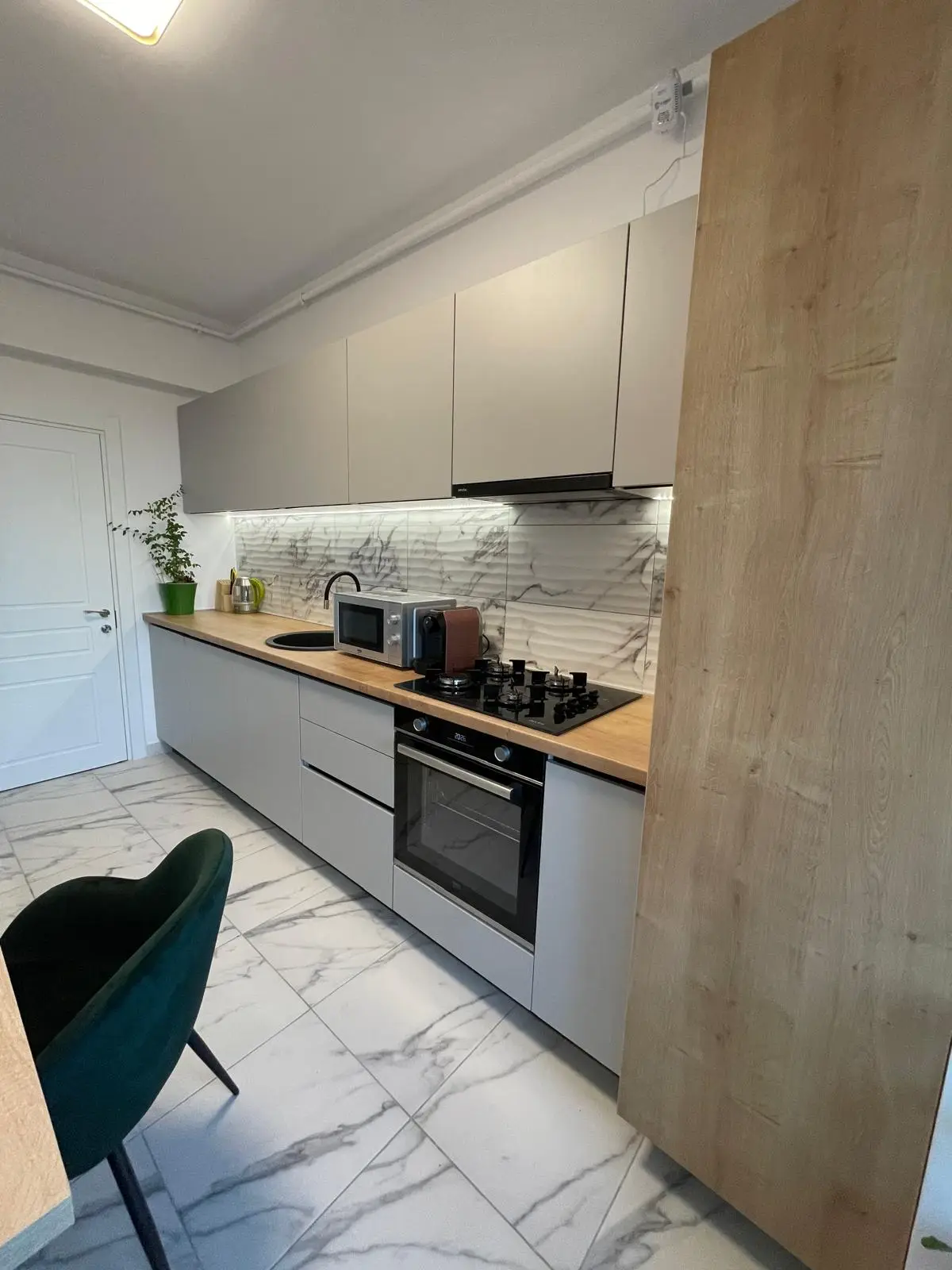 Bucătăria este optimizată inteligent, având corpuri suspendate și spații de depozitare integrate. Blatul de lucru din lemn natural contrastează armonios cu finisajele neutre ale mobilierului, iar backsplash-ul din marmură albă adaugă un plus de rafinament. Electrocasnicele moderne, precum plita pe gaz, cuptorul încorporat și hota minimalistă, sunt perfect integrate, oferind un aspect unitar și funcțional.
